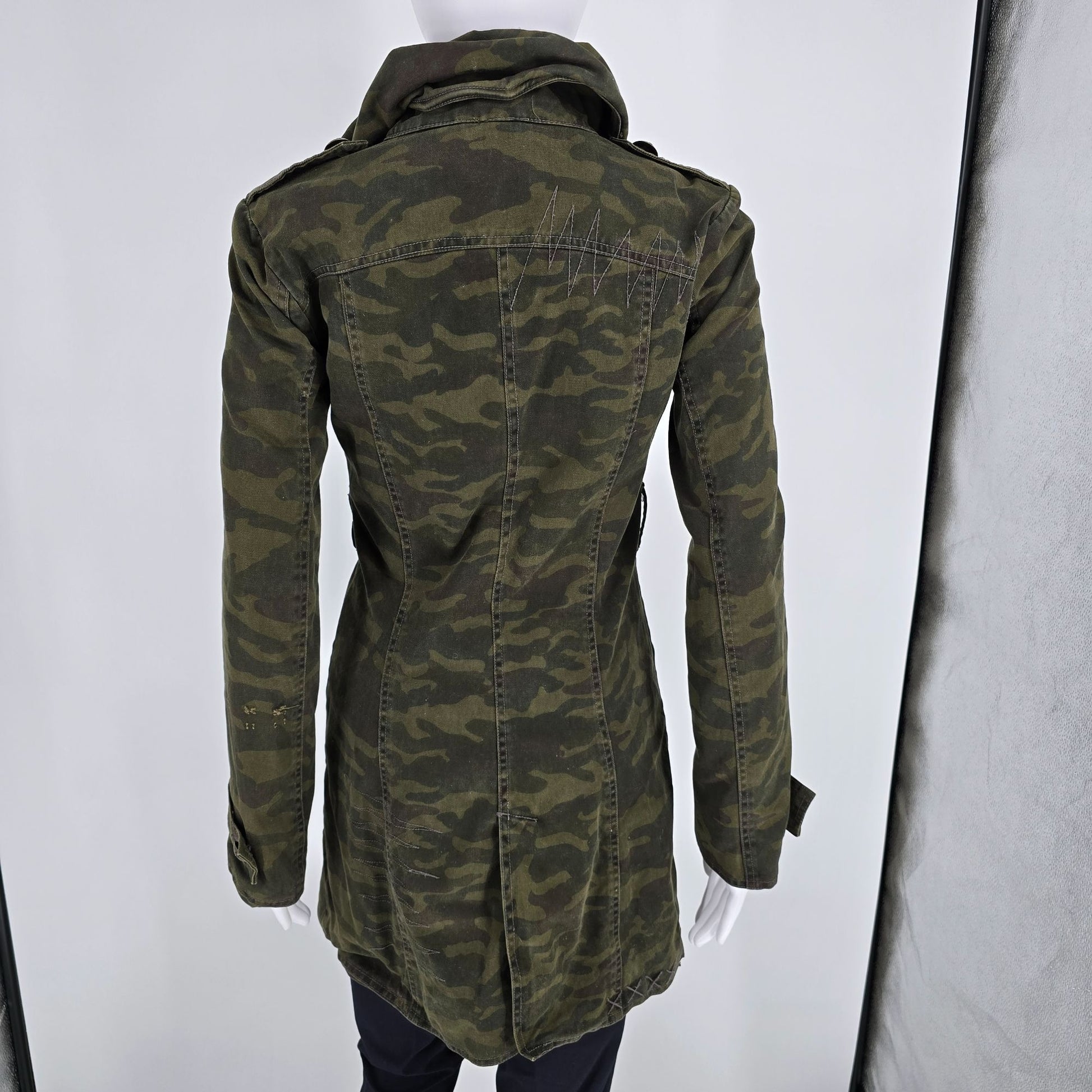 Notable Features: Long camo-print coat with fitted, military-inspired silhouette; brass-tone clasp closures over hidden snaps