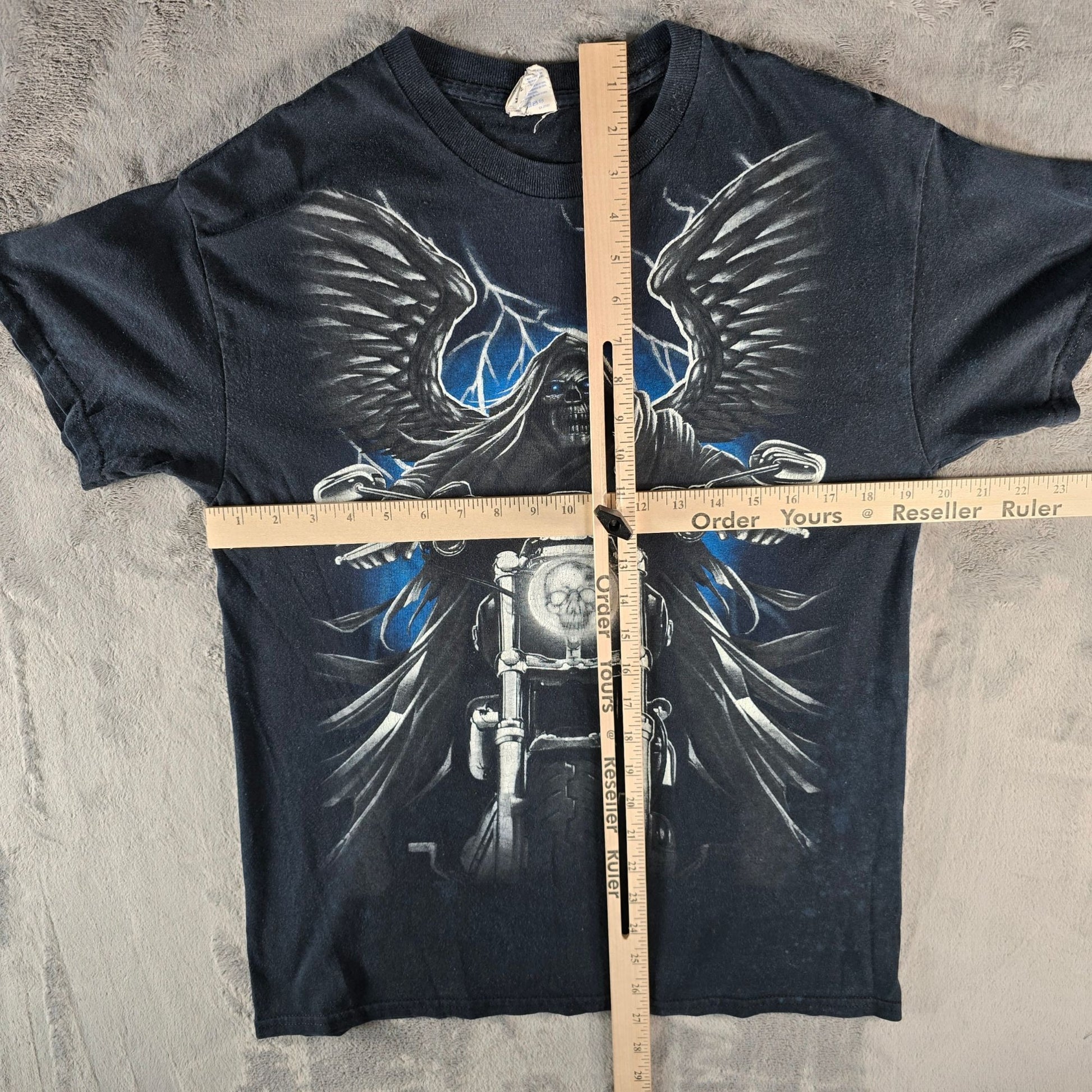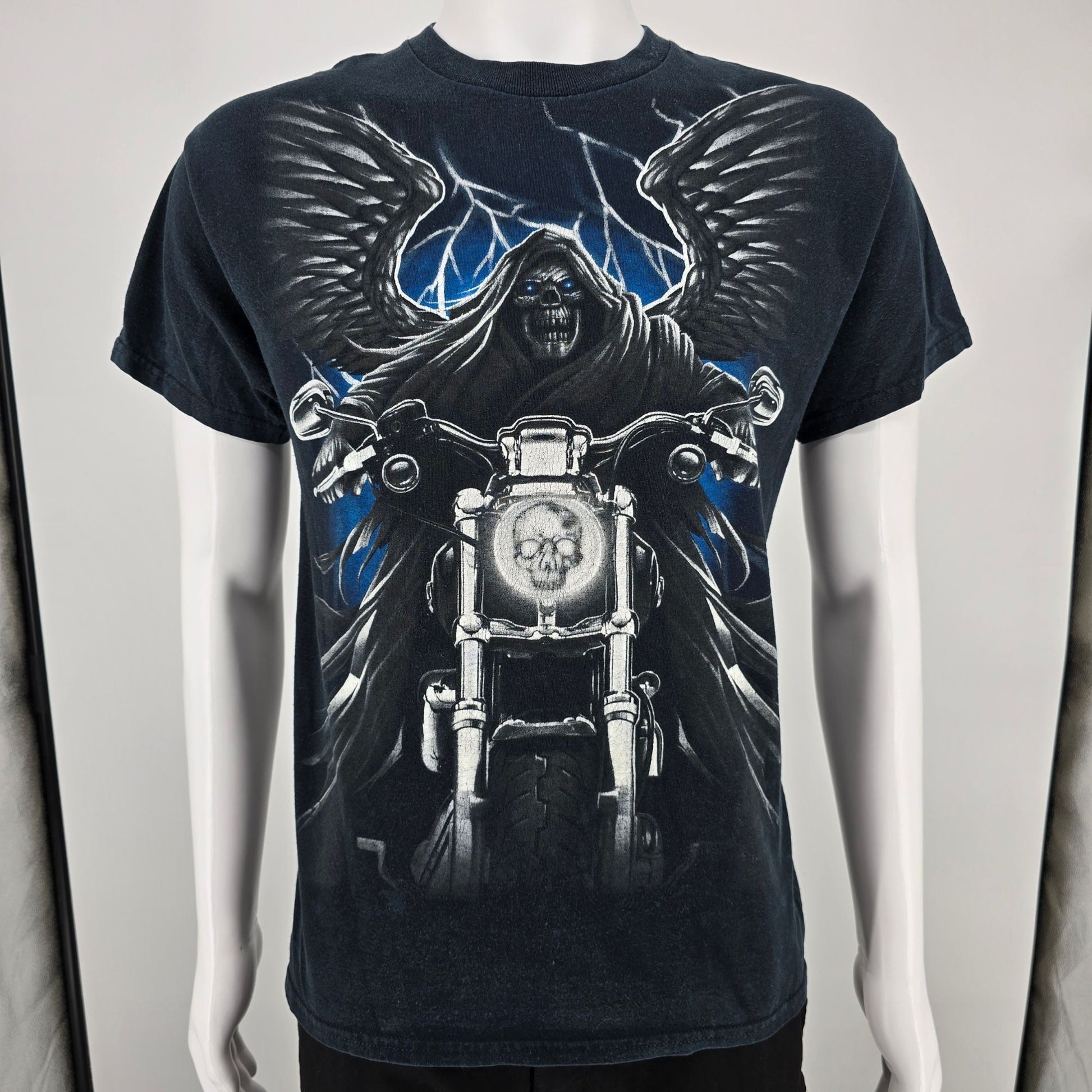 2010s Gildan Heavy Cotton Grim Reaper Motorcycle Graphic Biker T-Shirt (M) *Fair