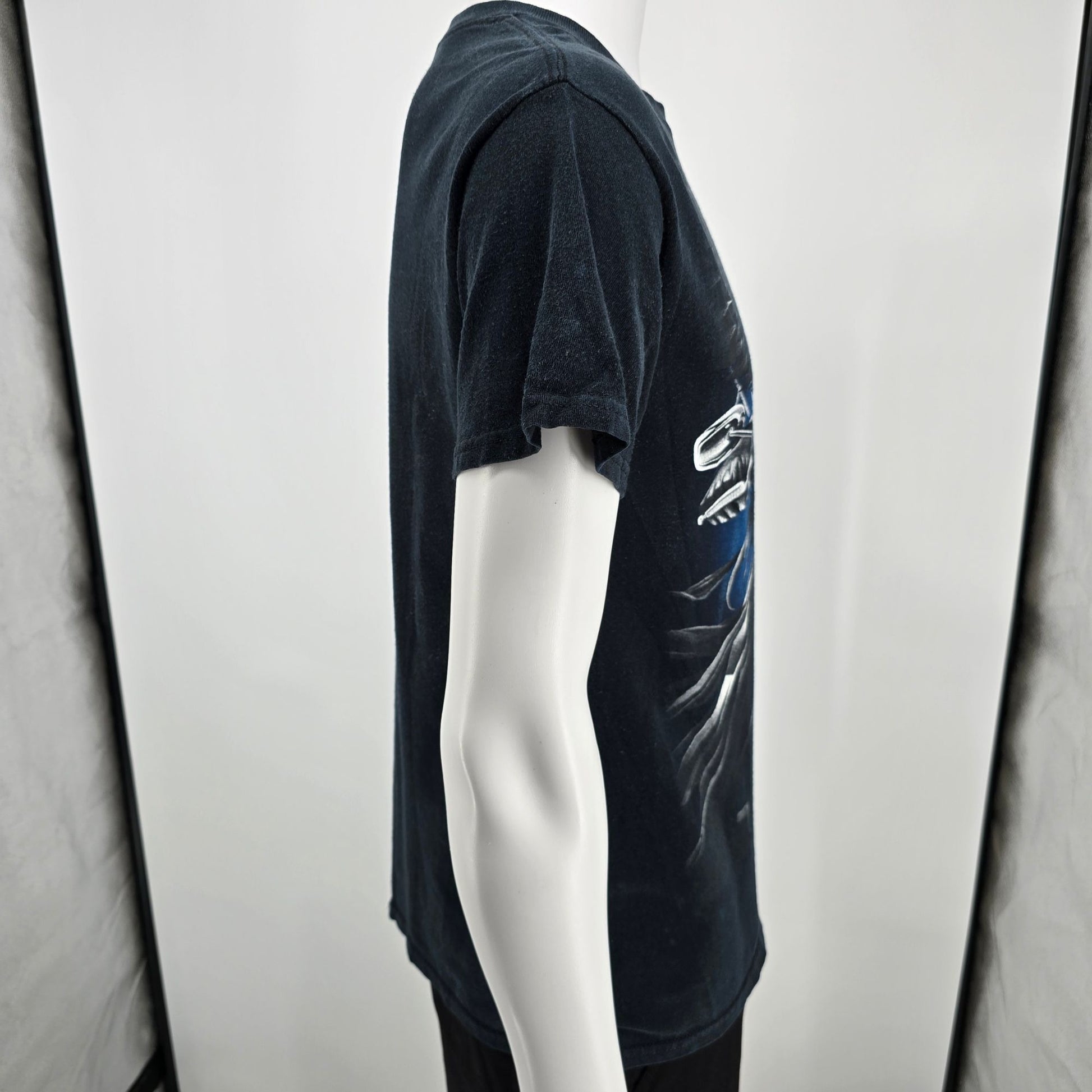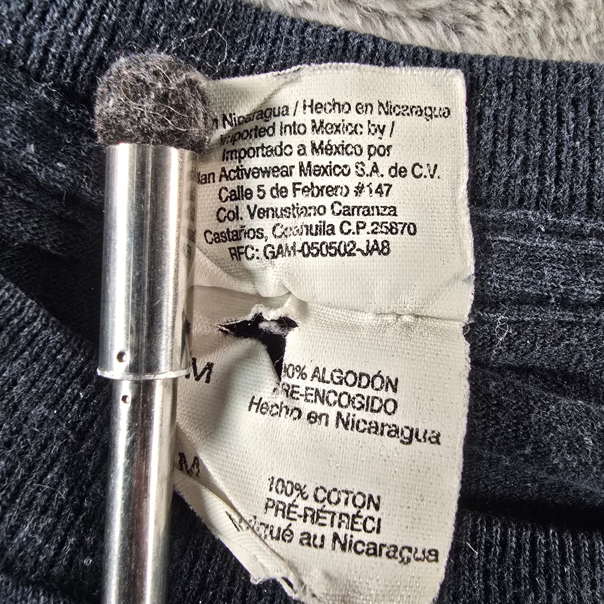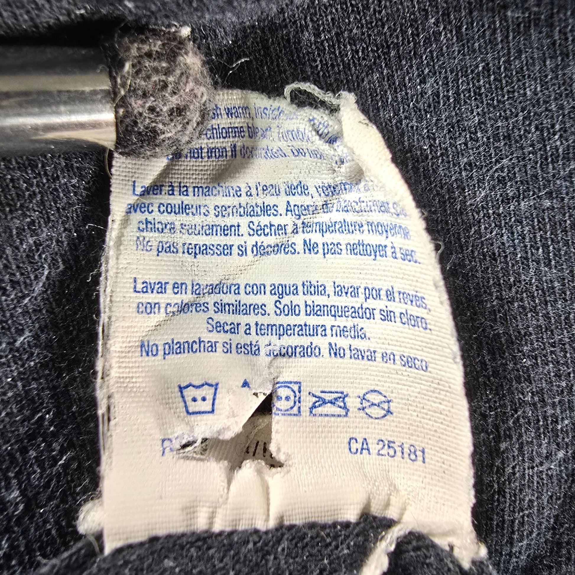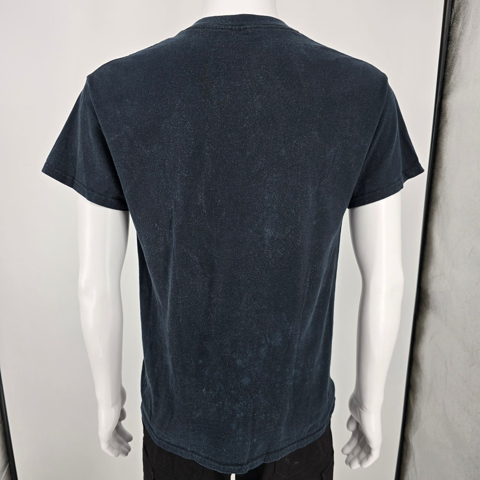 Fair used condition. No identified rips, cuts, holes, or tears. Extensive discoloration along the back of the shirt due to fabric degradation. Otherwise moderate to heavy fabric wear and fading throughout. See photos for details.