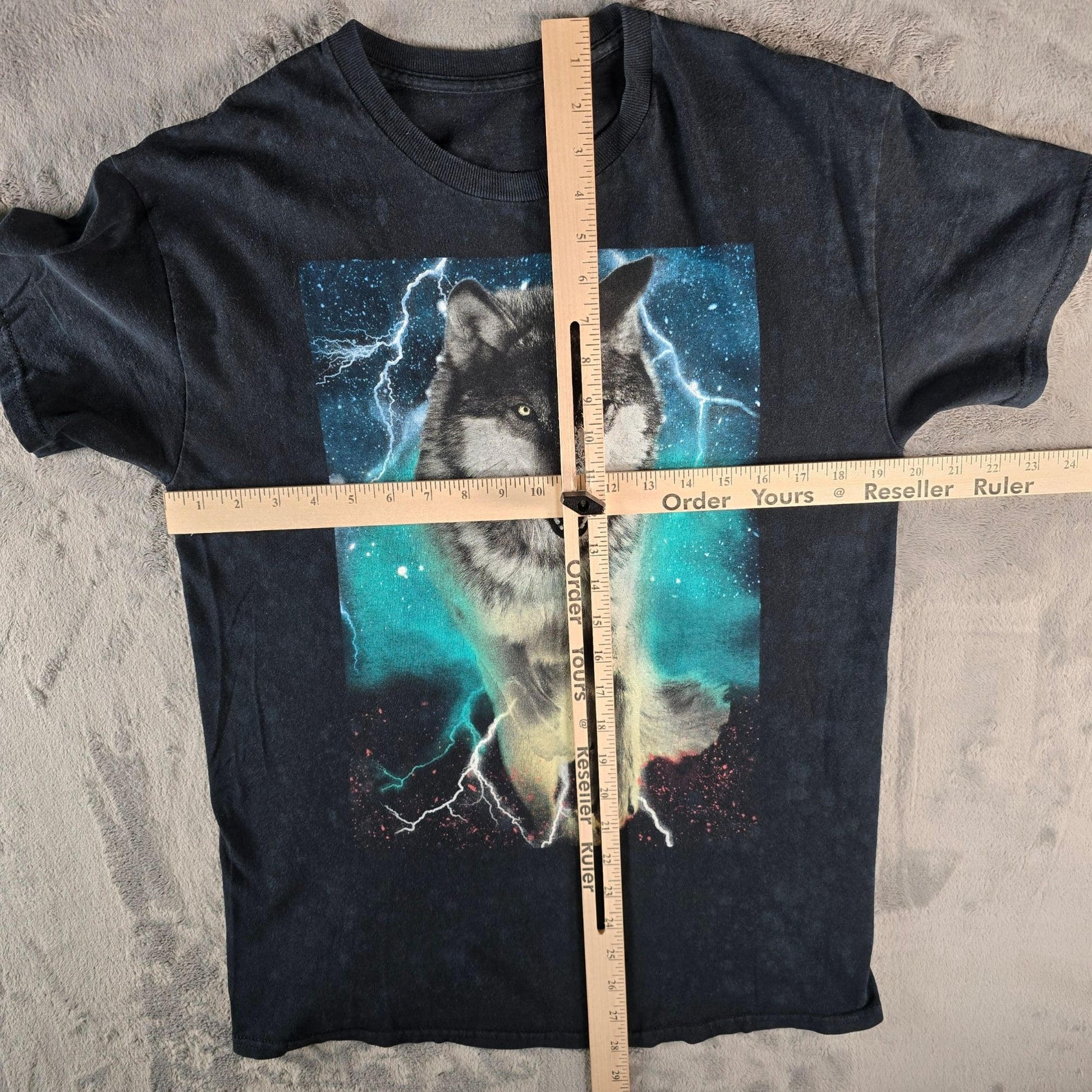 Fair to good used vintage condition. Printed tag on inside collar is almost completely illegible. Visible wear/distressing on wolf graphic. Small hole on front near bottom hem. Otherwise moderate fabric wear and fading throughout. See photos for details.