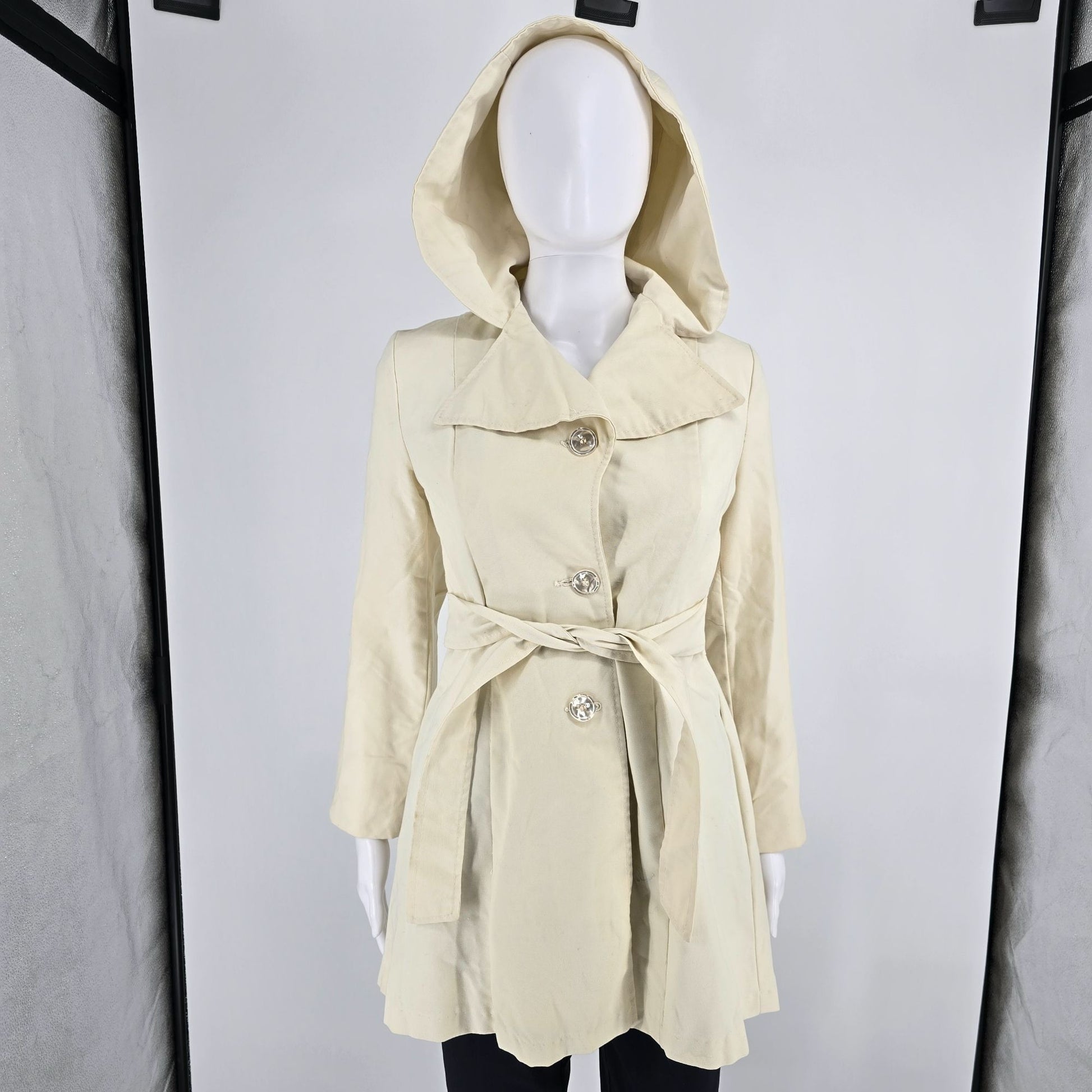 Notable Features: Hooded fit-and-flare coat; Self-tie belt; Princess seams; Full lining.