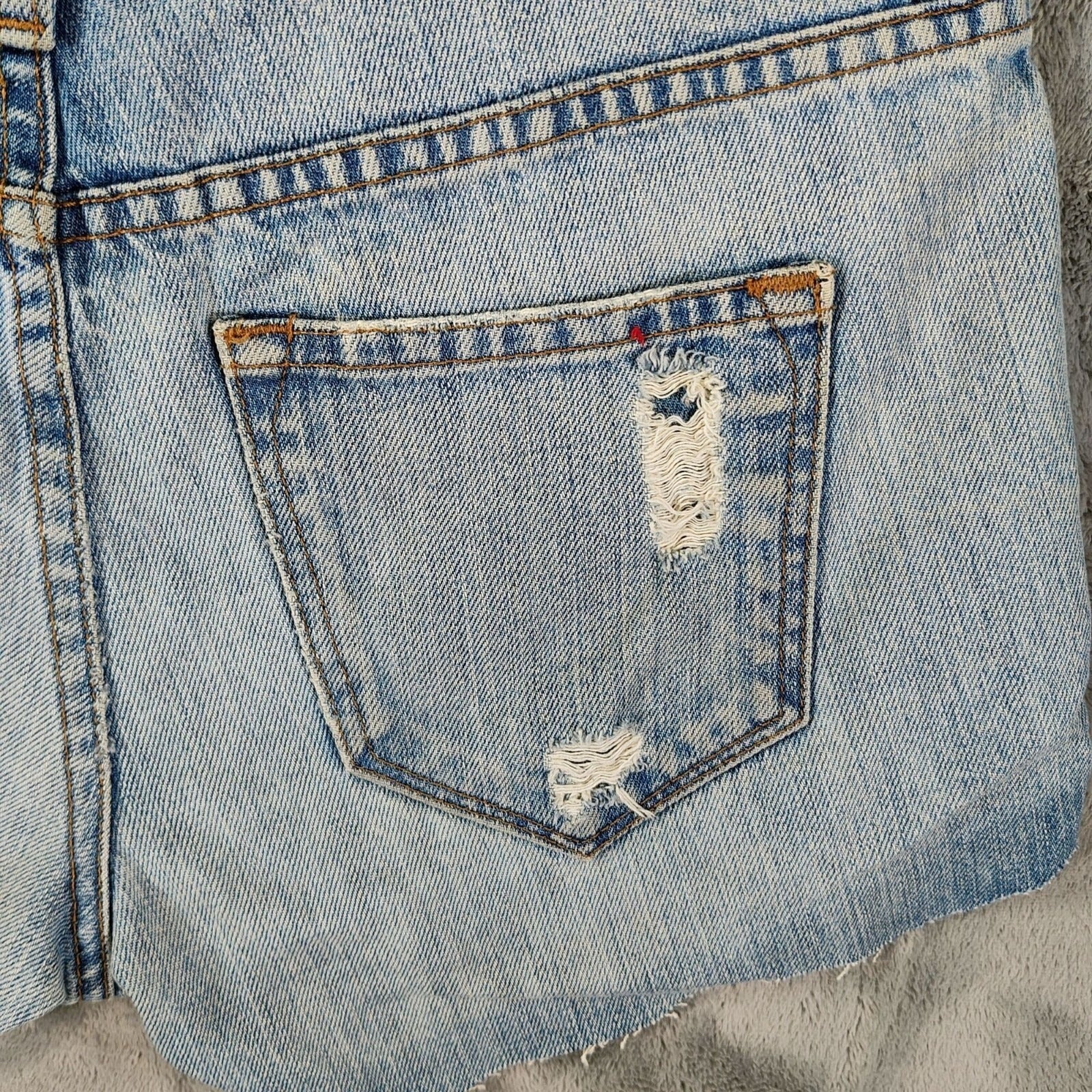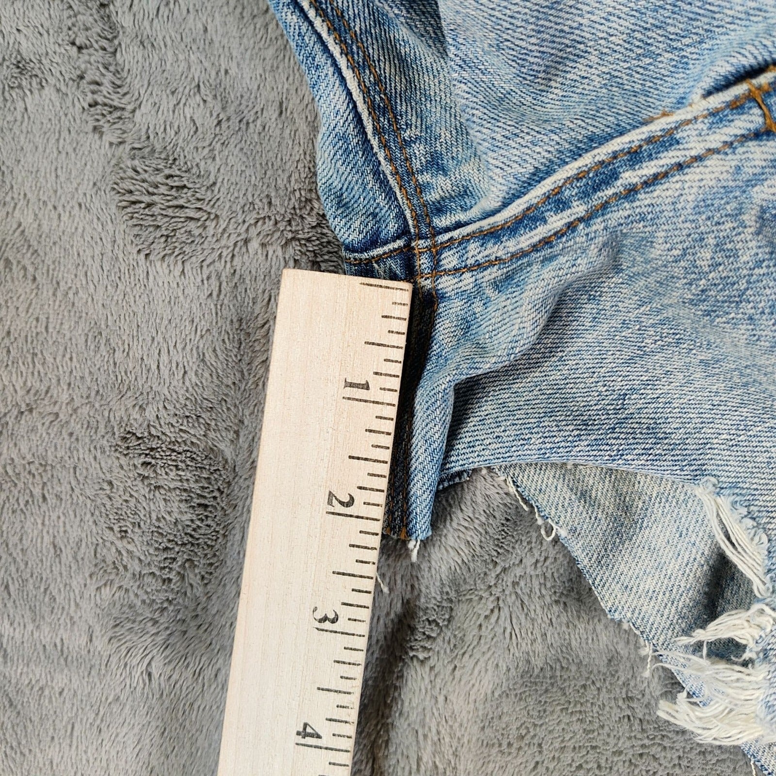 Condition Notes: Good DIY condition. DIY cutoffs with frayed hems and uneven seams. Intentional distressing throughout. Especially high distressed hole on back near waistline. See photos.