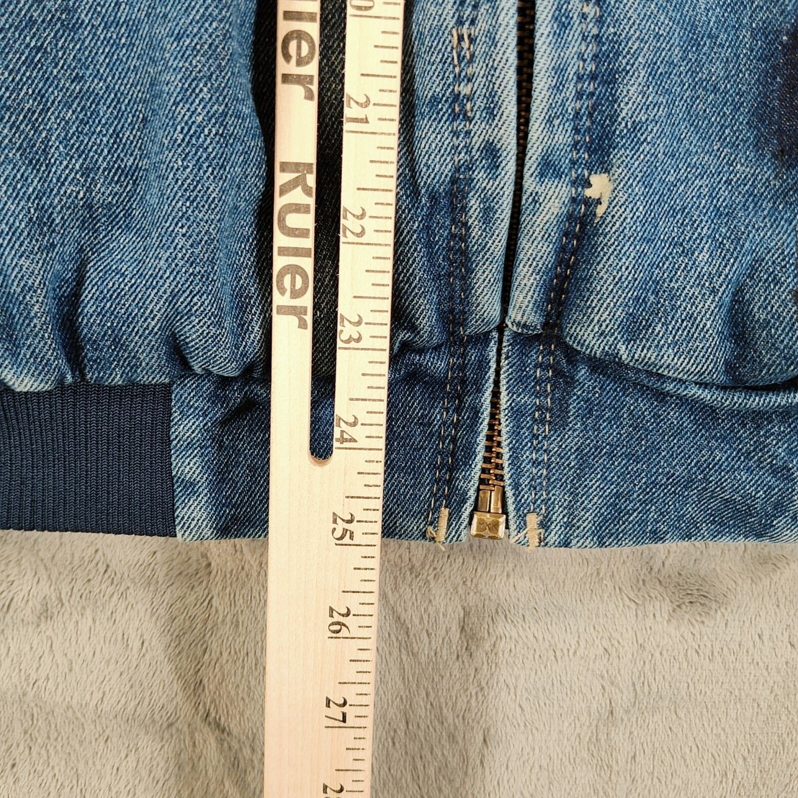 Condition Notes: Fair/distressed condition. Off-color denim repair patch on front of shirt near bottom hem. Several small stains on front at zipper flap near hem and below company logo. Large spot of discoloration on back above main logo near right shoulder. Discoloration on left side near vertical seam. Moderate wear throughout, but lots of life left. See photos.