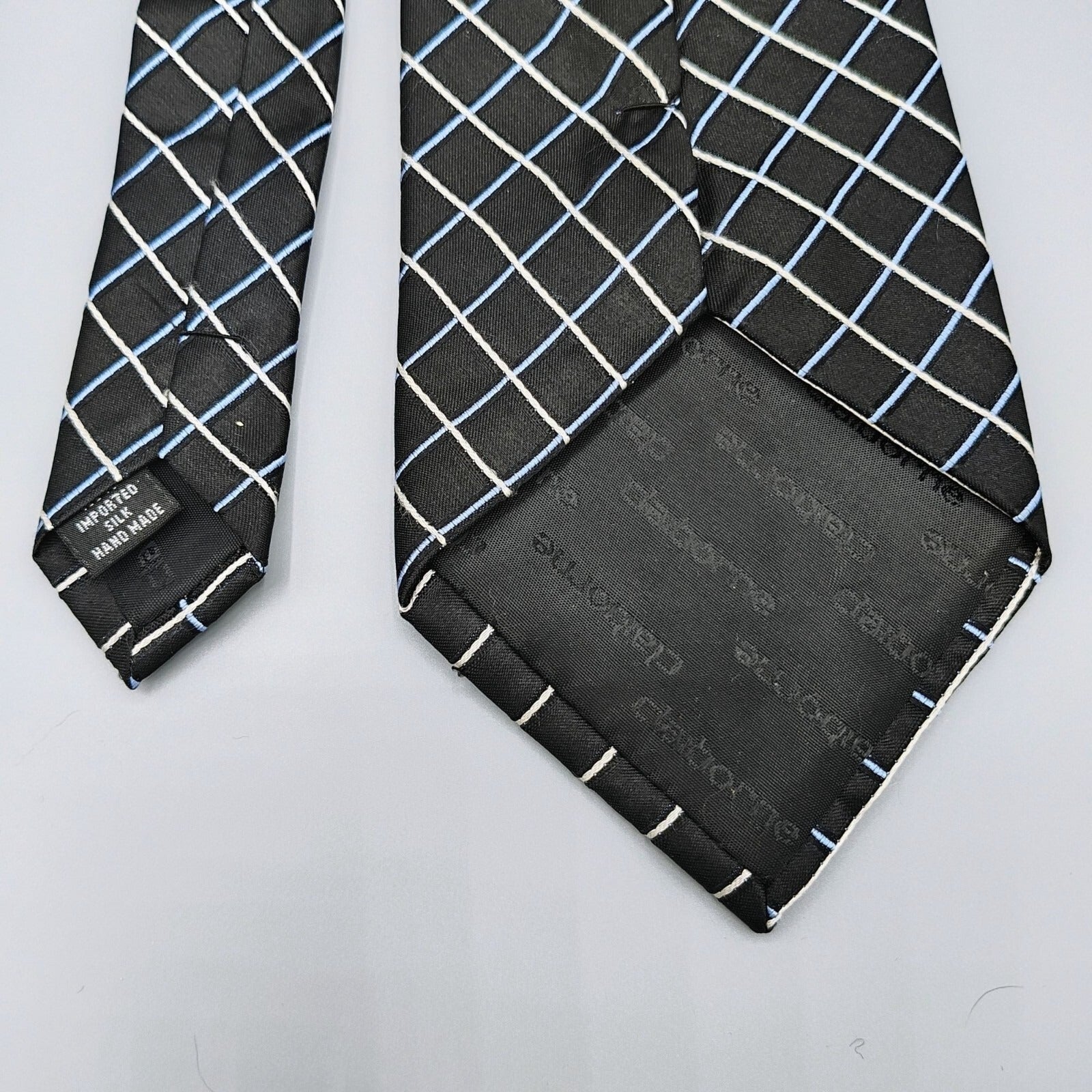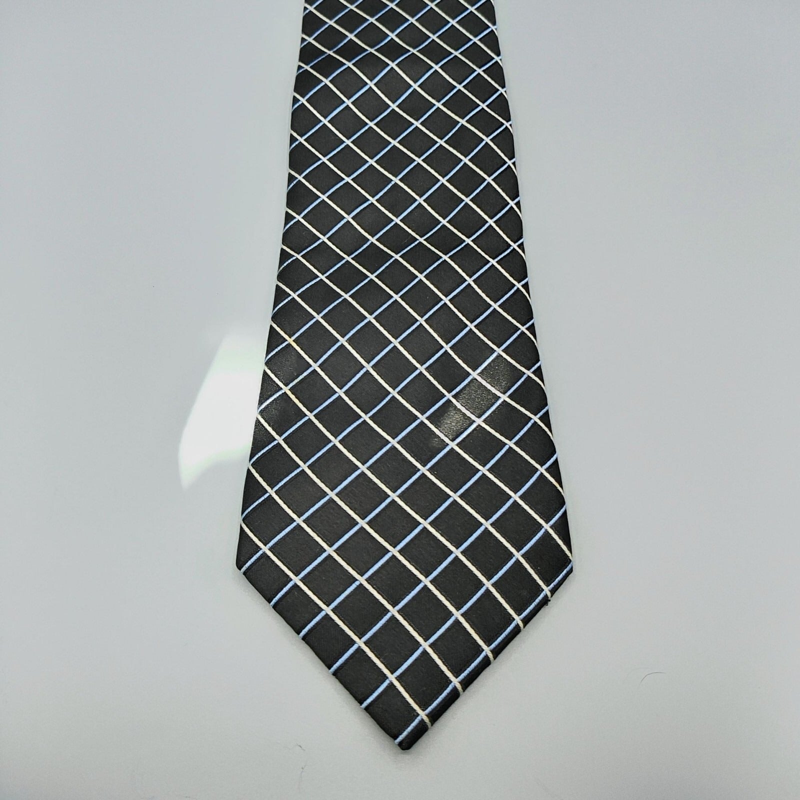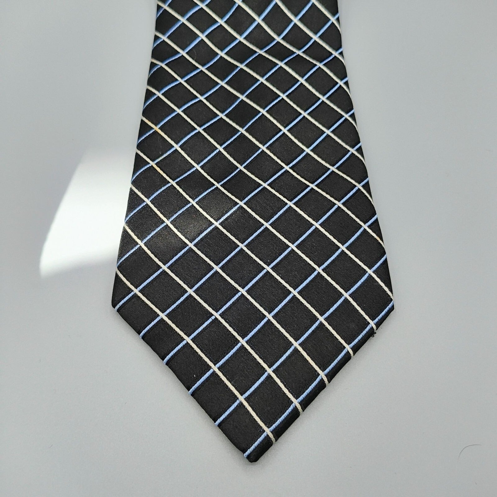 Claiborne Mens Black, Blue, and White Grid Pattern Textured 100% Silk Necktie