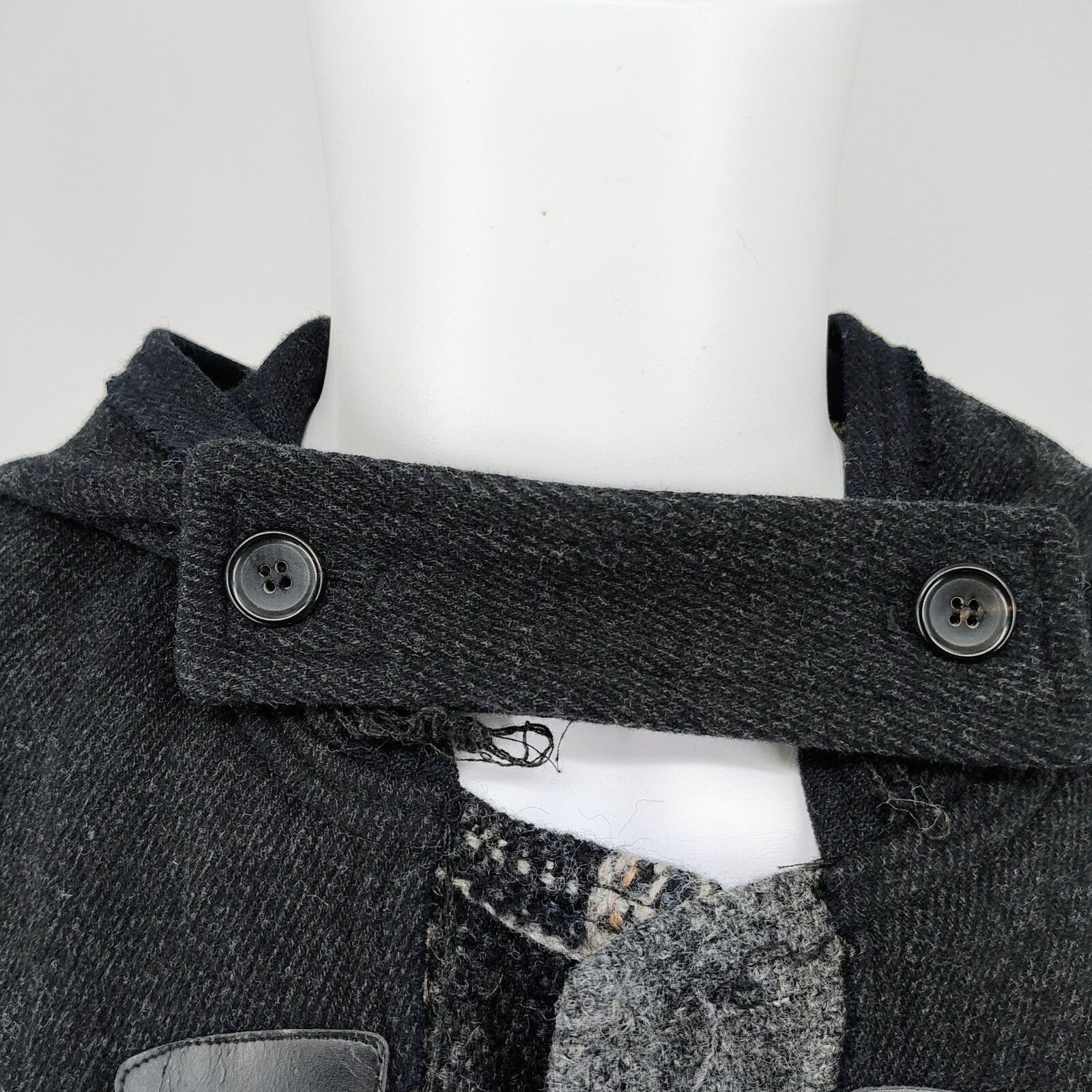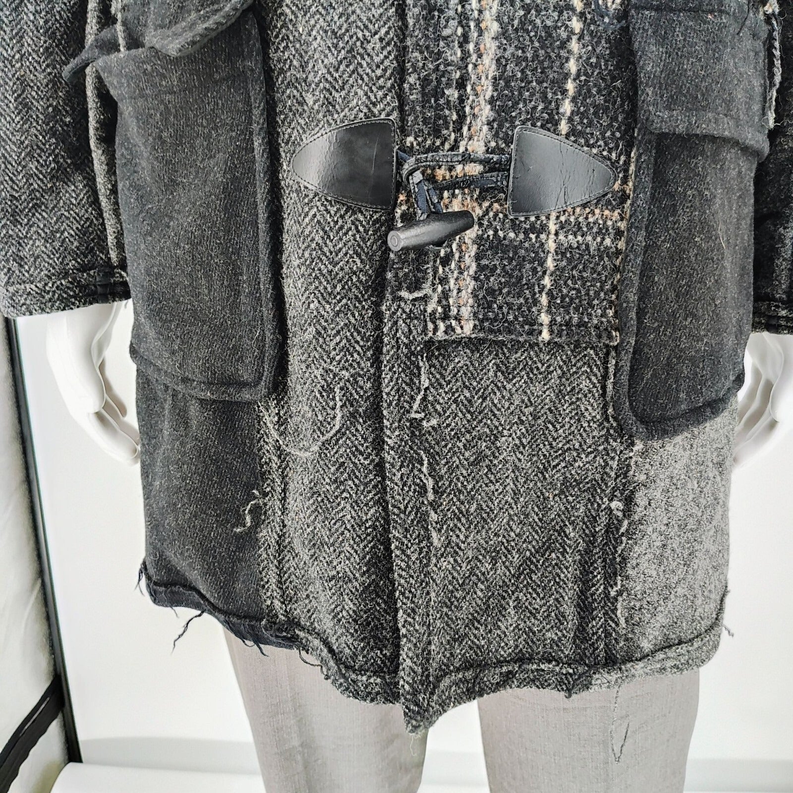 Condition Notes: Minor fading throughout. Minor scratches at hardware. Leather loops at toggles are deteriorating, with peeling of the top layers. Heavy intentional distressing (e.g. all the loose threads) throughout garment. See photos.
