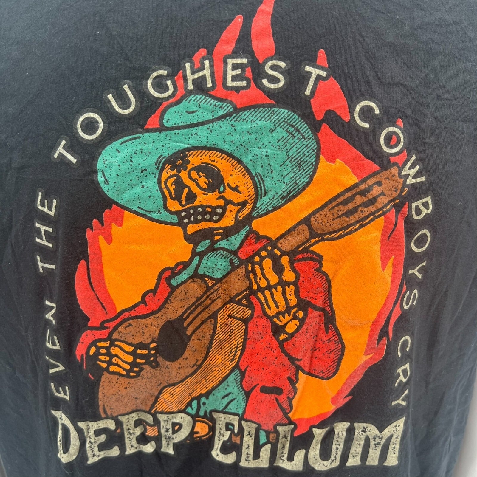 Design: The front logo is a picture of a crying cowboy skeleton skull. The big has a larger picture of the cowboy skeleton and says "Even the Toughest Cowboys" Cry" Deep Ellum