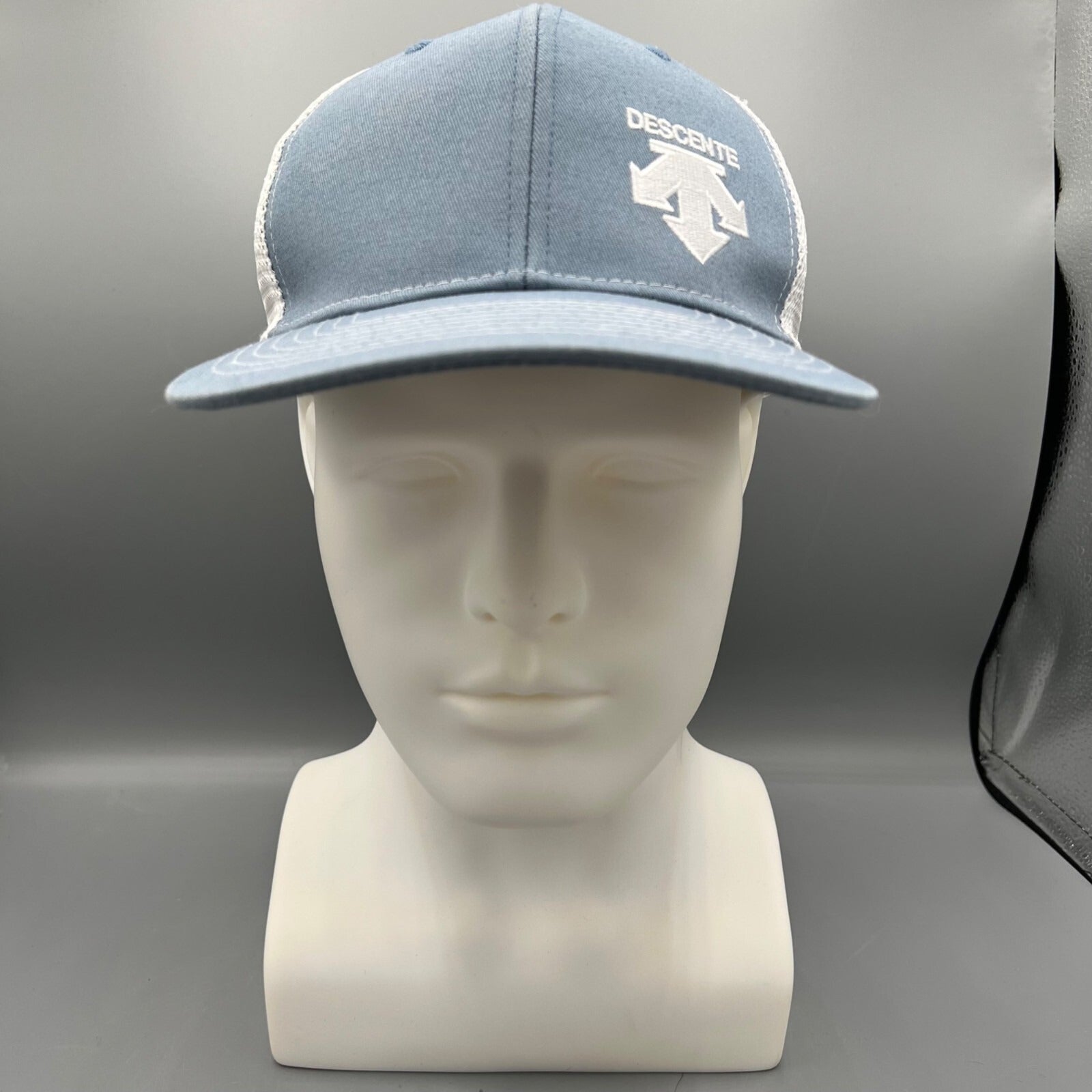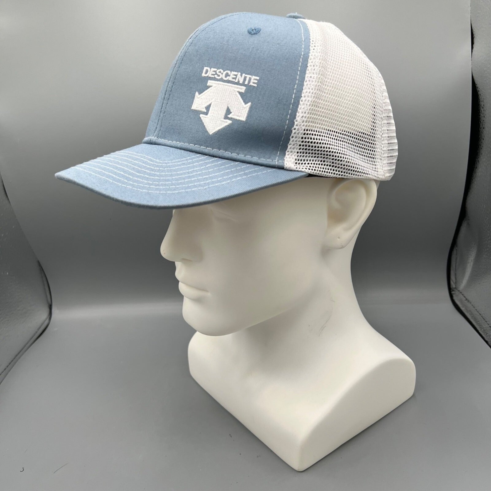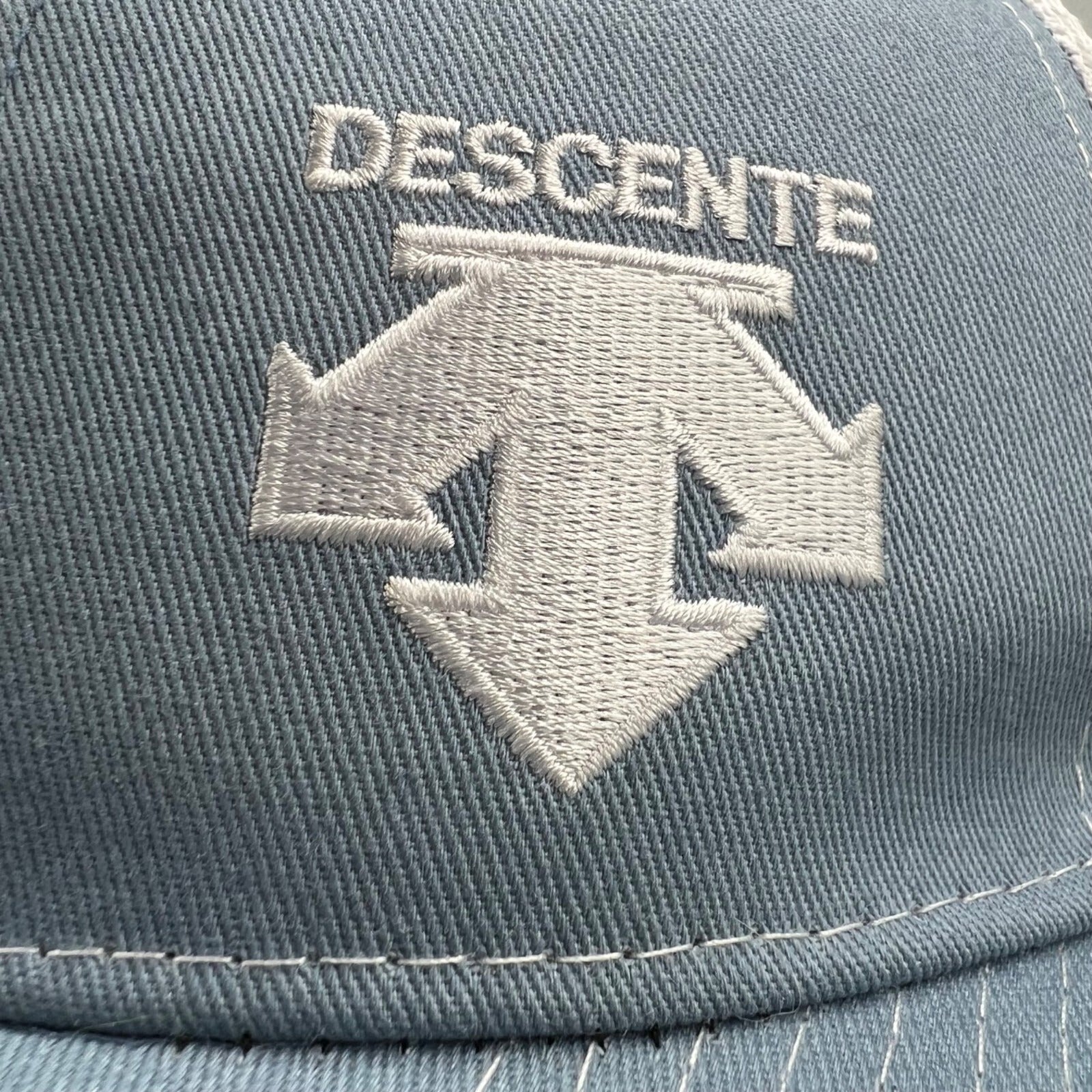 Descente Skiing Mesh Back Six Panel Blue and White Embroidered Logo Trucker Hat