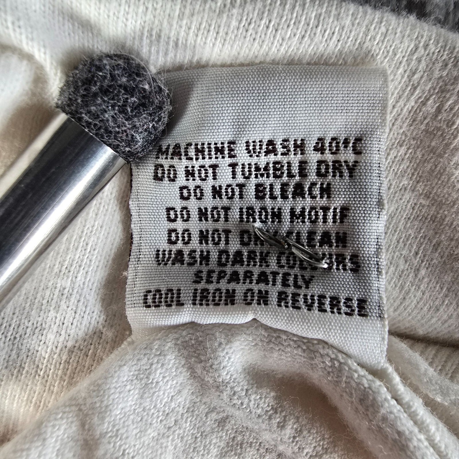 Staple in tag. Discoloration at both pits.
