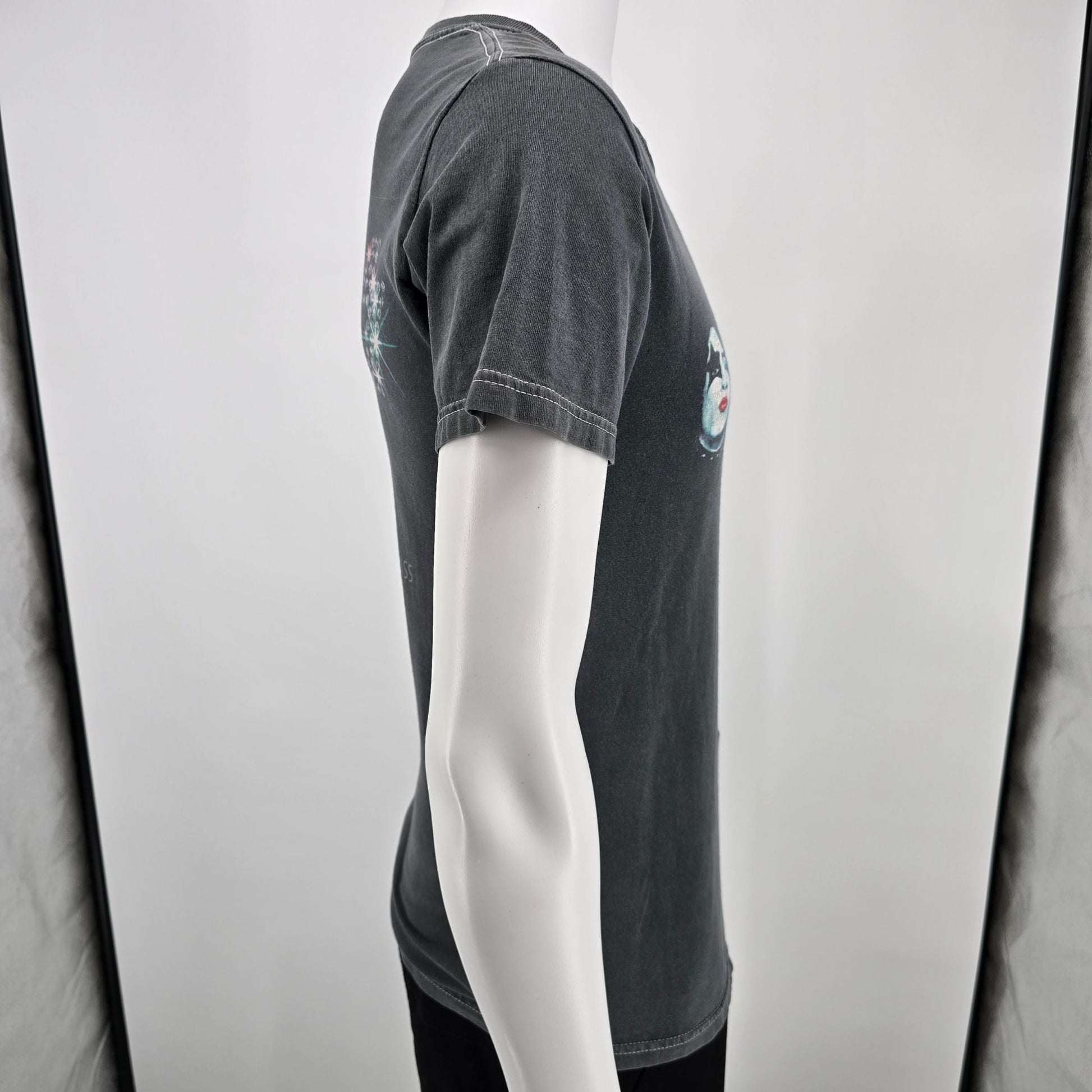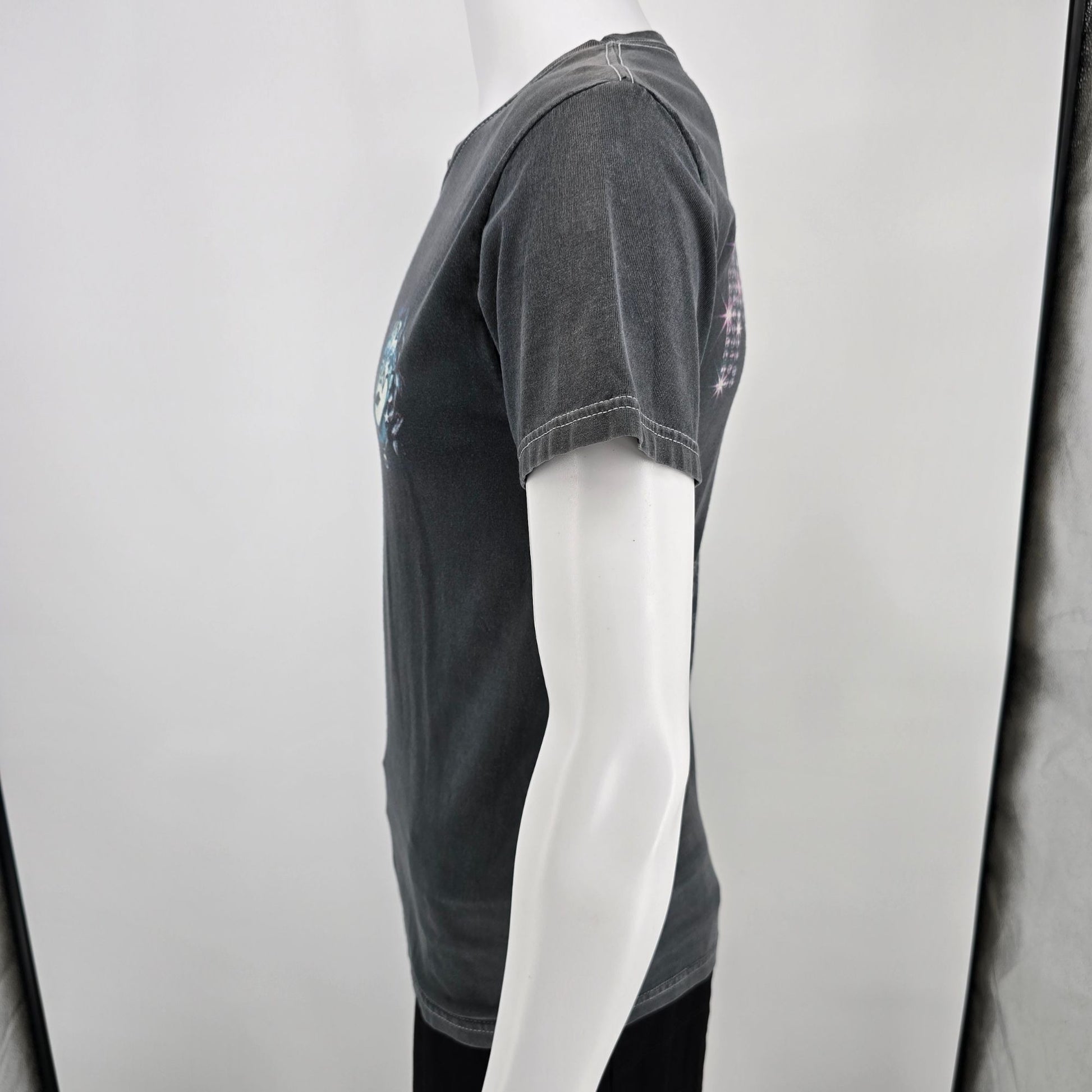 Fair/distressed used condition. Small hole on front halfway between bottom of graphic and hem. Natural cracking/distressing on both front and back graphics. Very heavy and uneven fading throughout. See photos for details.