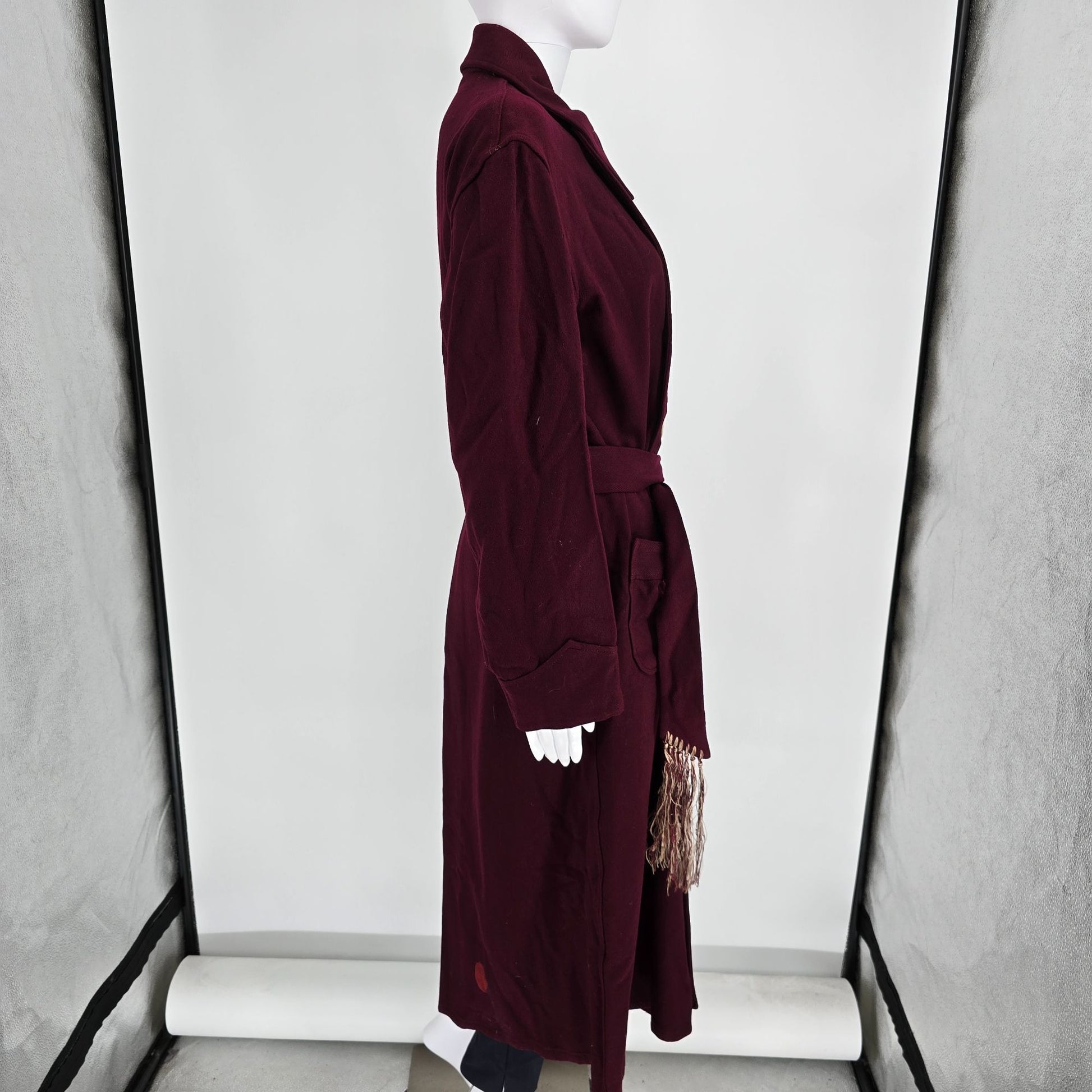 Notable Features: Double-breasted front; Self-tie belt with long tassel ends; Pockets;