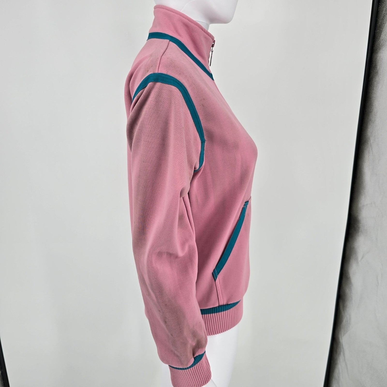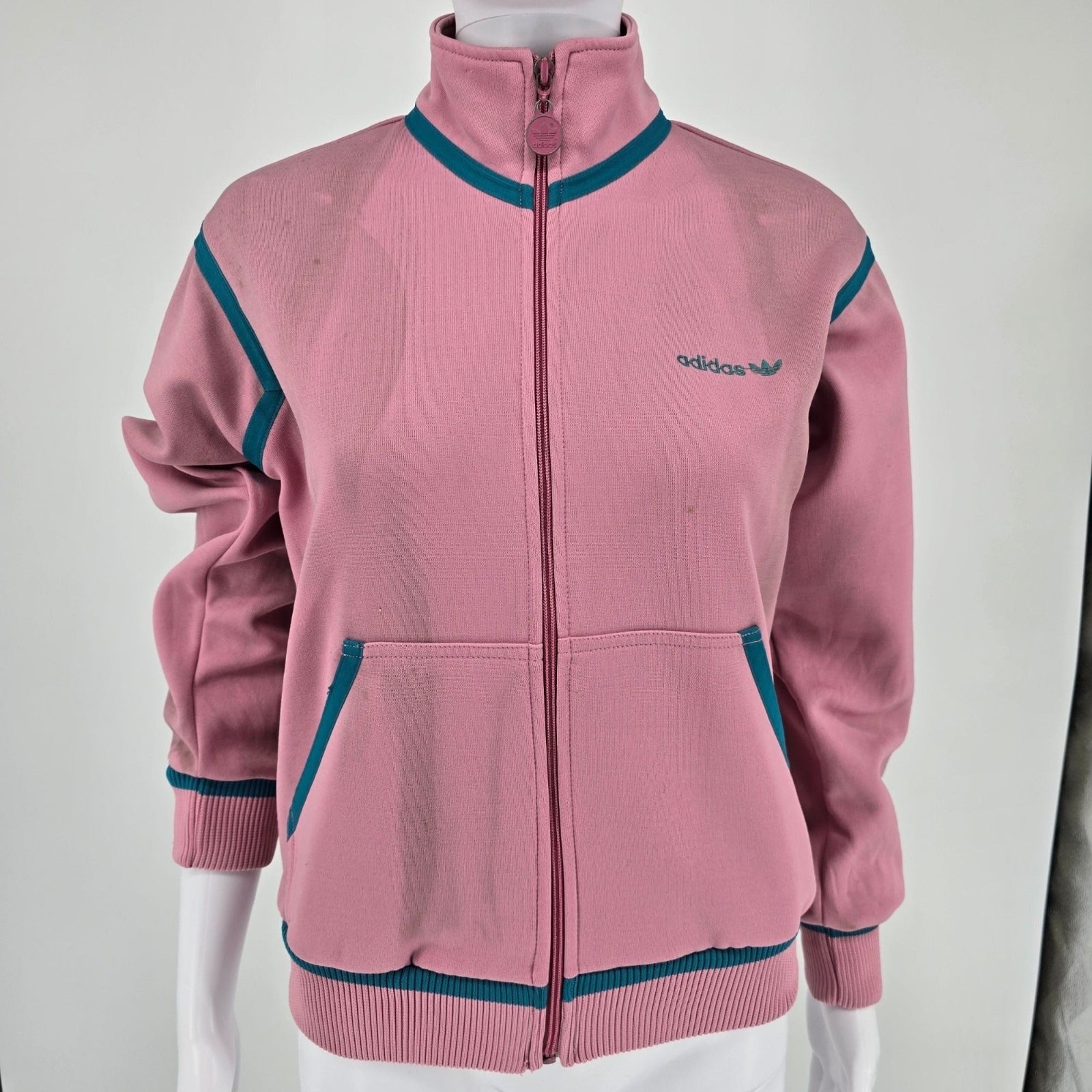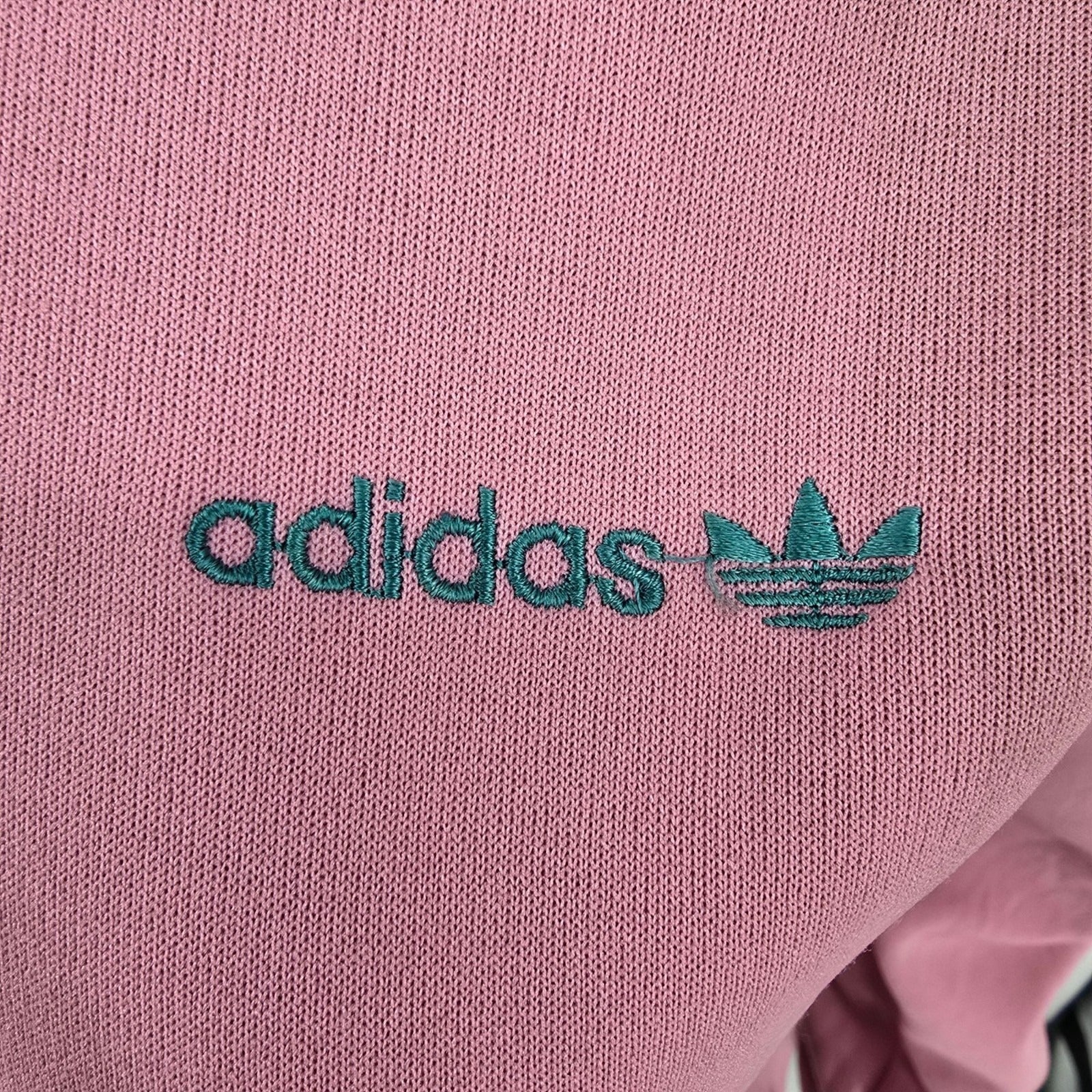 Distressed Vintage 1980s Adidas Women's Pink & Teal Full-Zip Track Jacket (S)