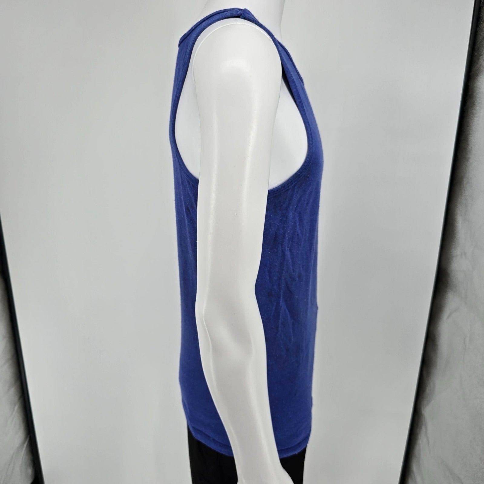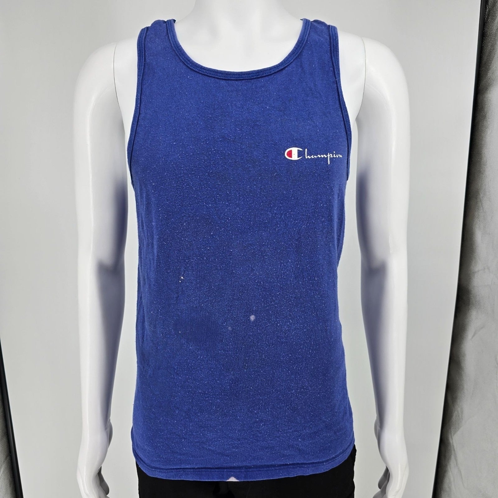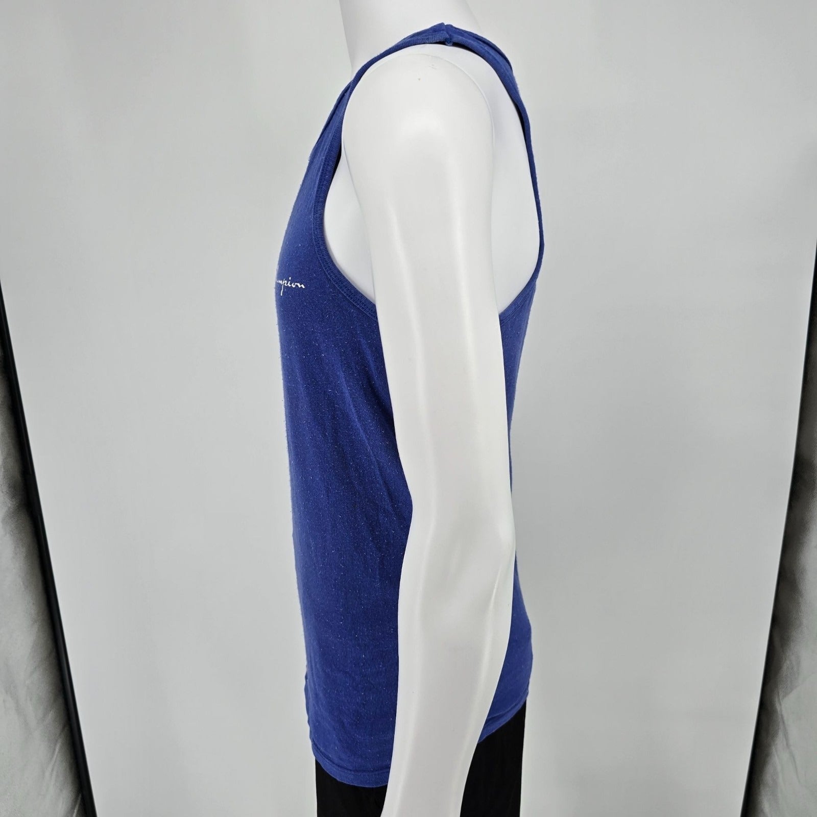 Distressed Vintage 1980s Champion USA Script Logo Blue Athletic Tank Top (S)