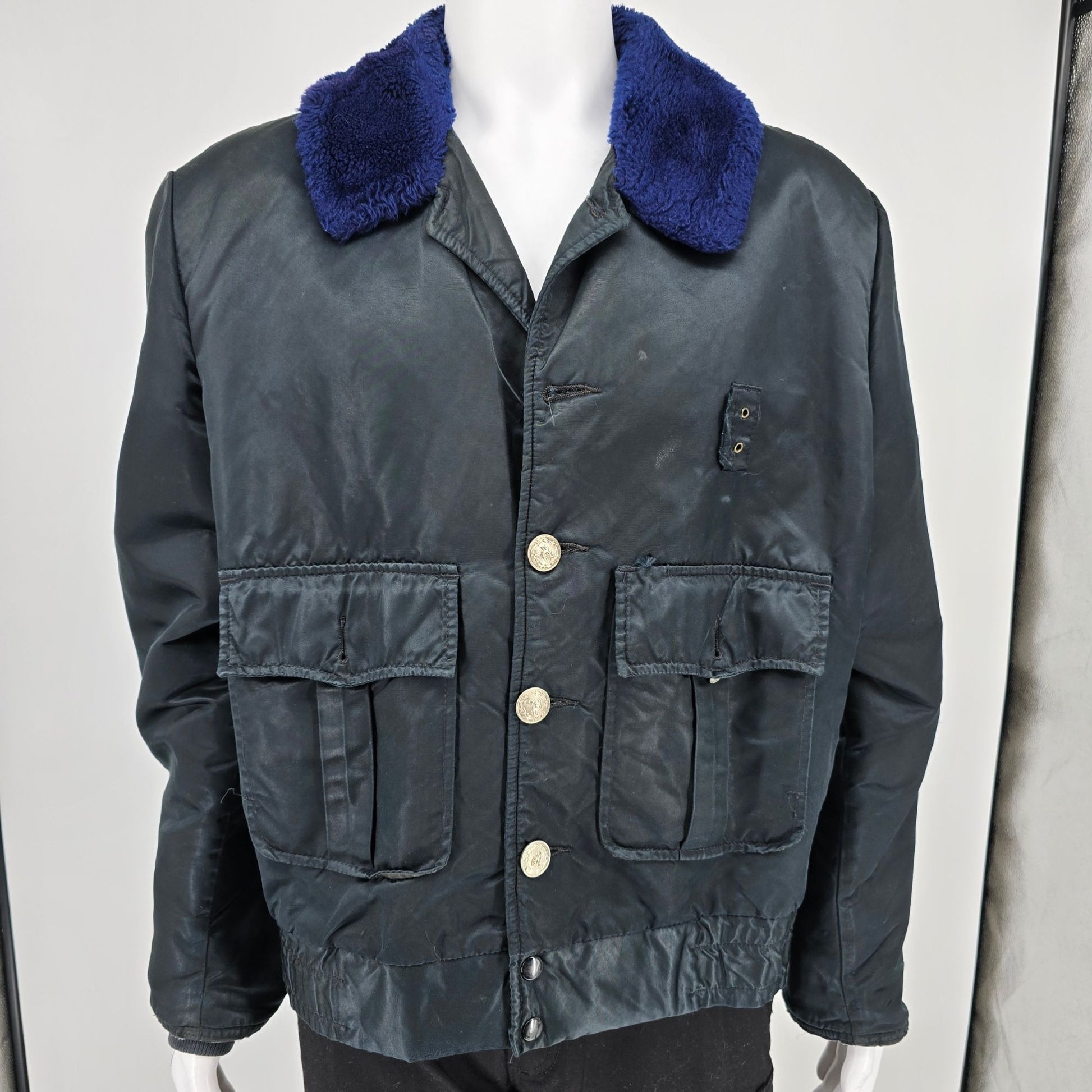 Fair/distressed used vintage condition. Two inch long repairable seam split at right pit. Missing button at top near collar. Missing button on right flap pocket. Multiple light-colored stains/markings on the front and back. Moderate to heavy fabric wear throughout. See photos for details.