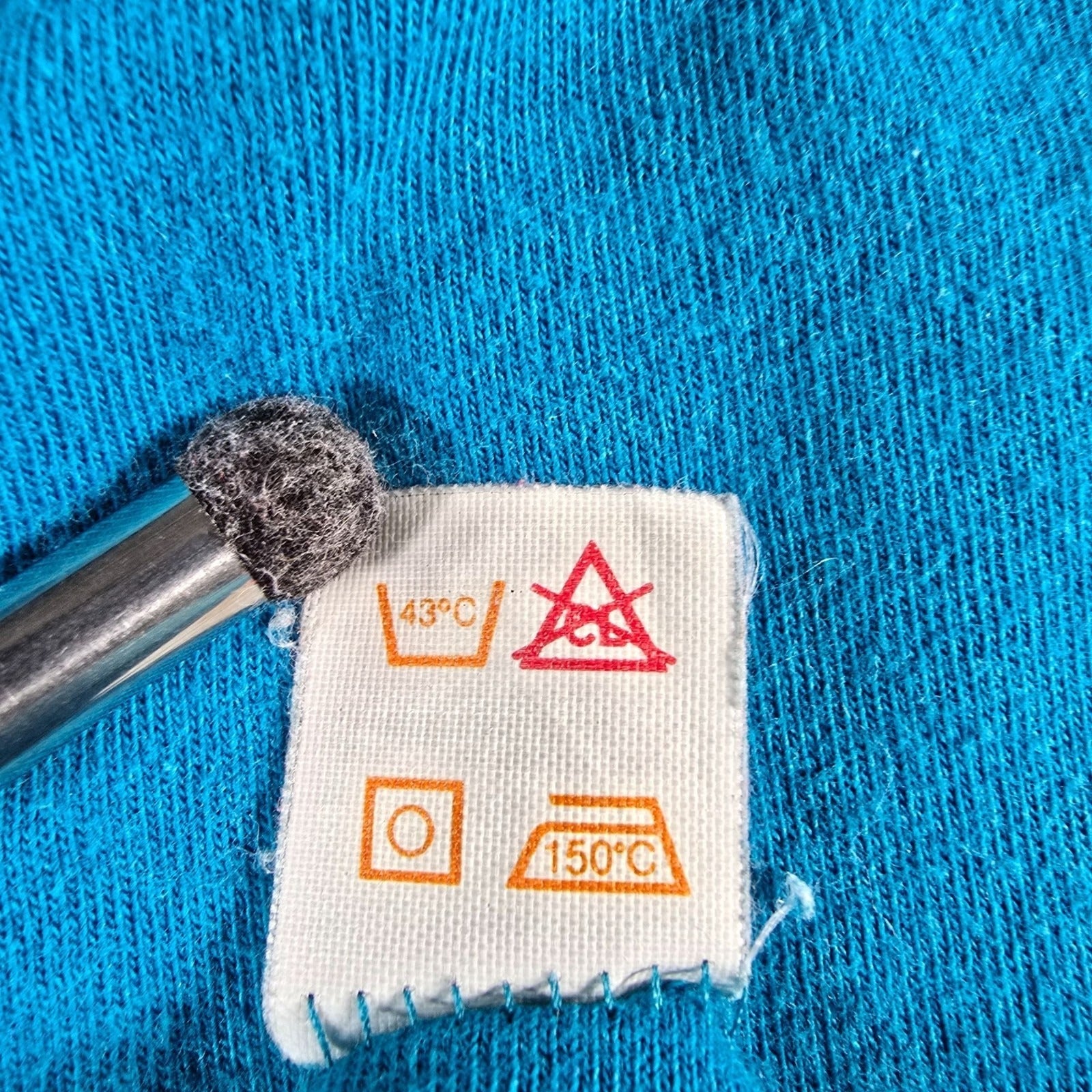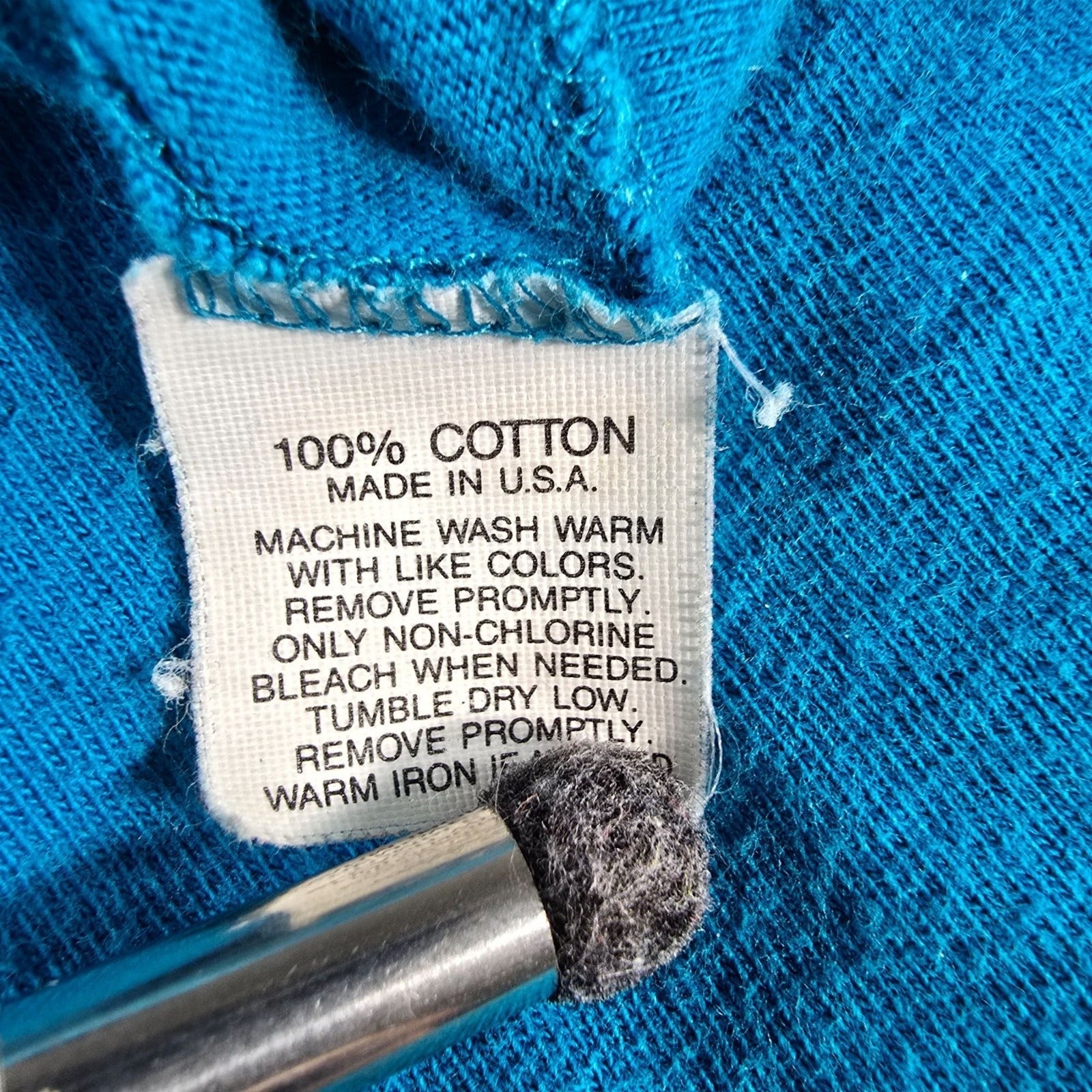 Fair/distressed used vintage condition. Multiple small bleach stains/areas of light discoloration at middle of front of shirt. One additional bleach stain on left side shirt near bottom hem. Moderate to heavy fabric wear and pilling throughout. See photos for details.