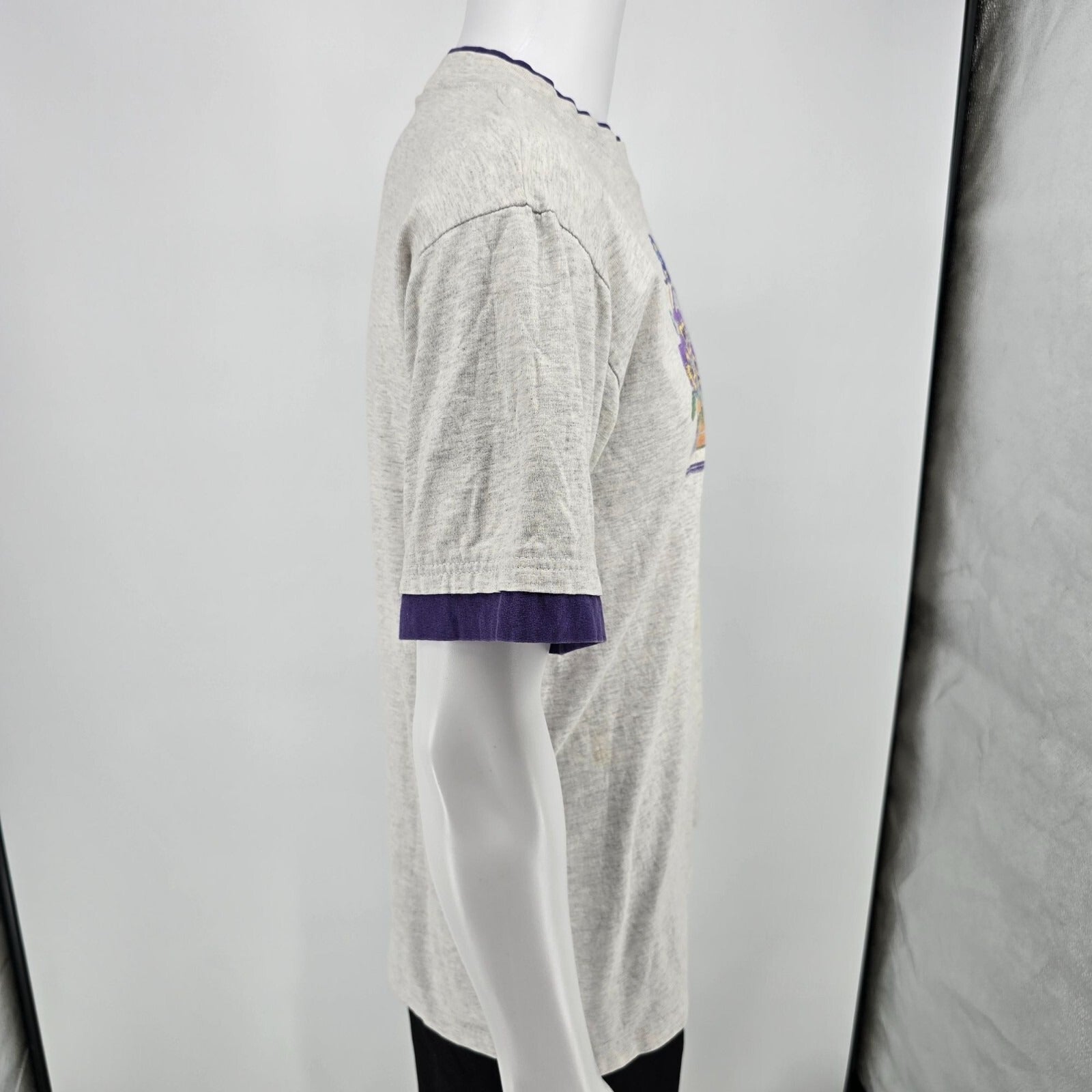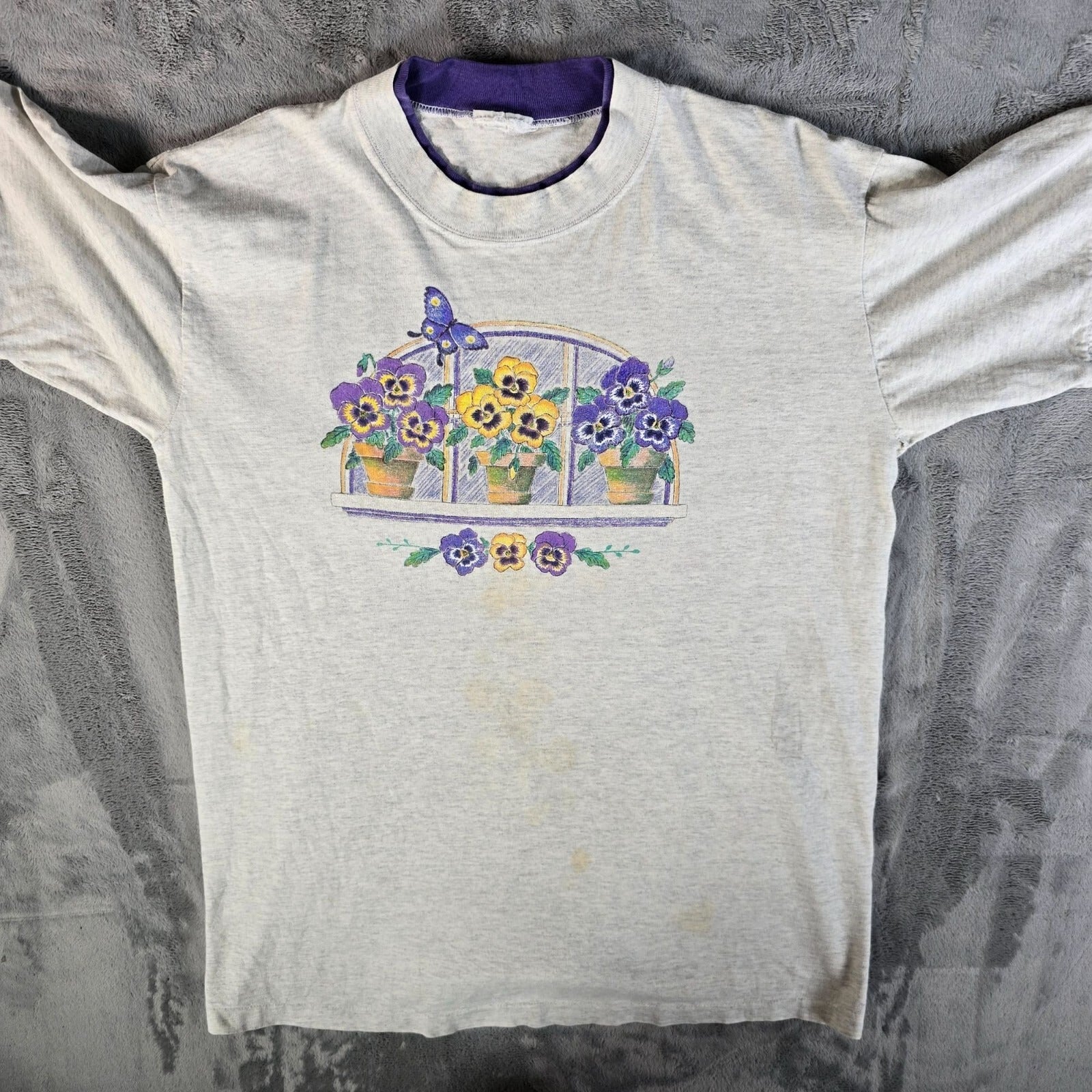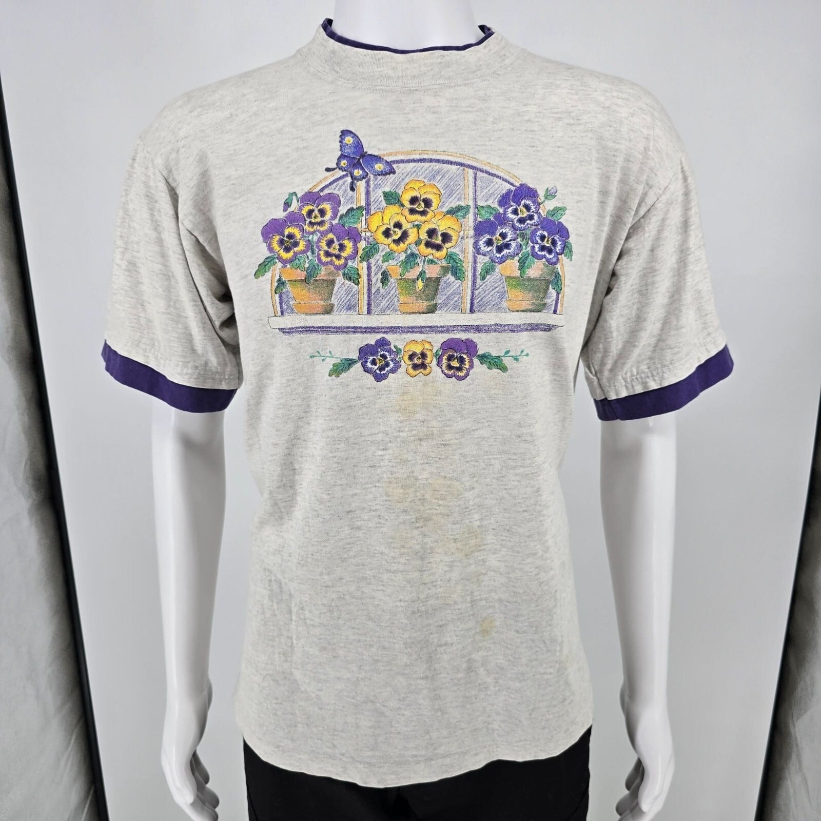 Distressed Vintage 1990s Pansy Flower Window Garden Ringer Tee T-Shirt (L)