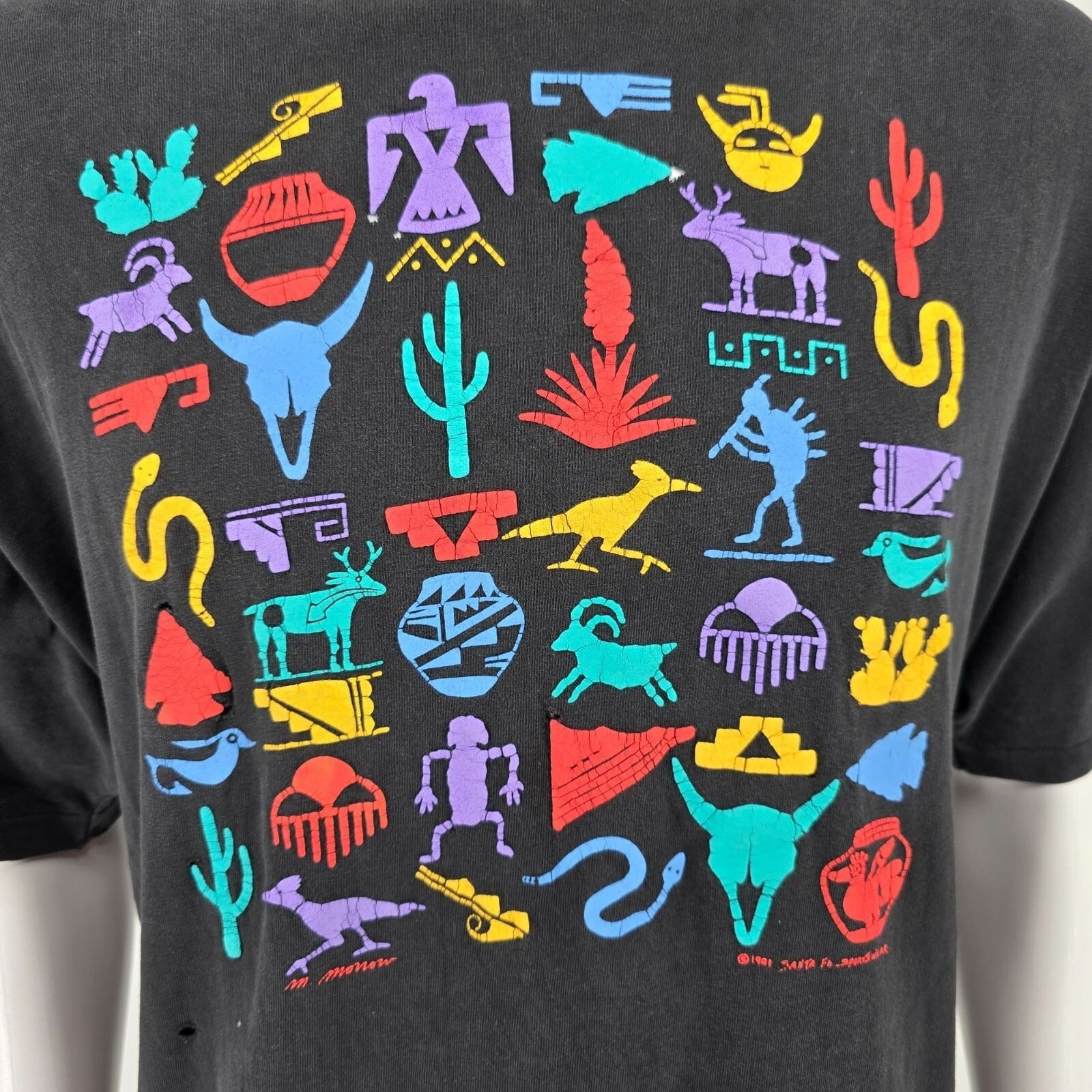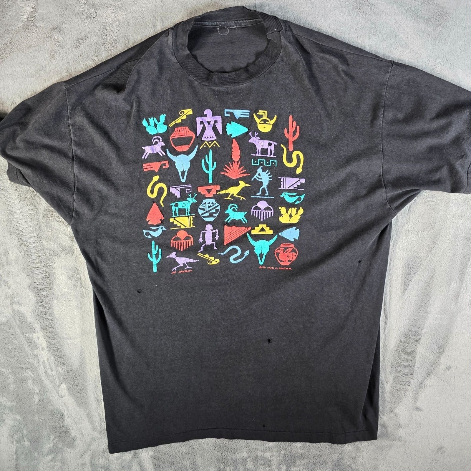 Distressed Vintage 1990s Santa Fe Sportswear Southwestern Symbols T-Shirt (XL)