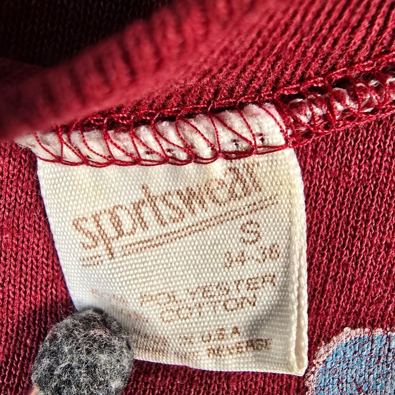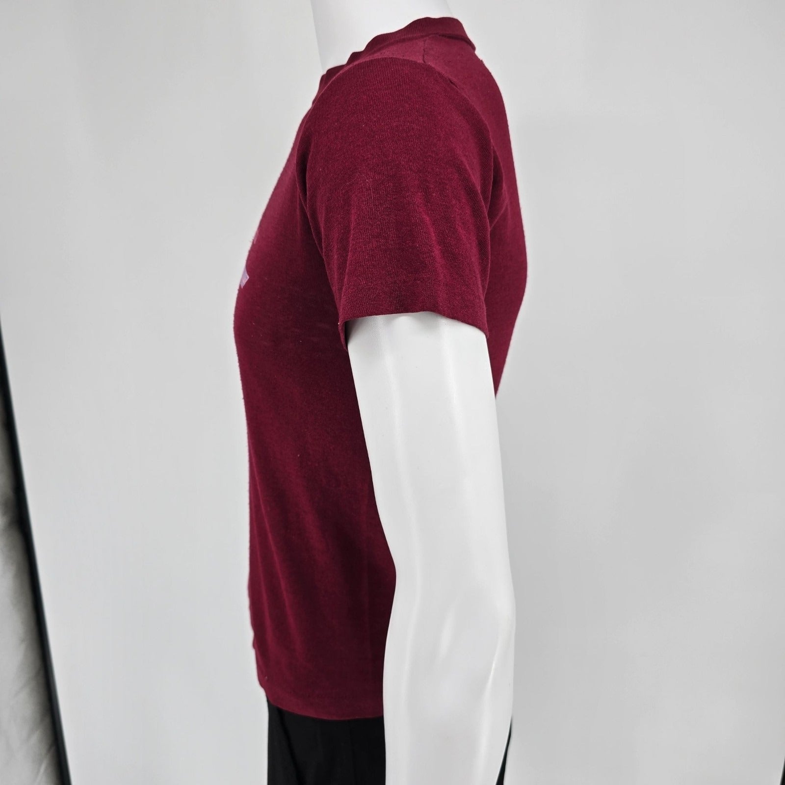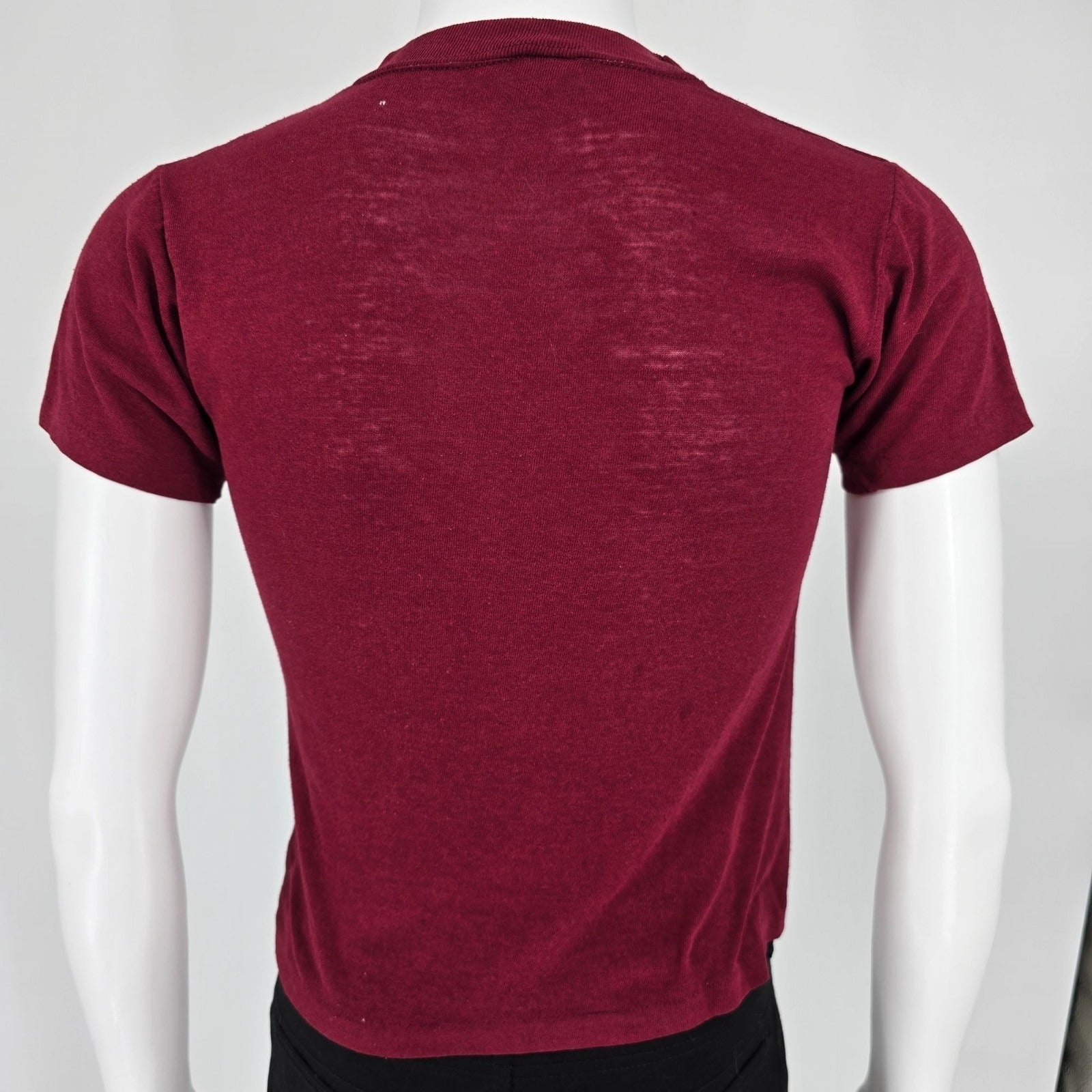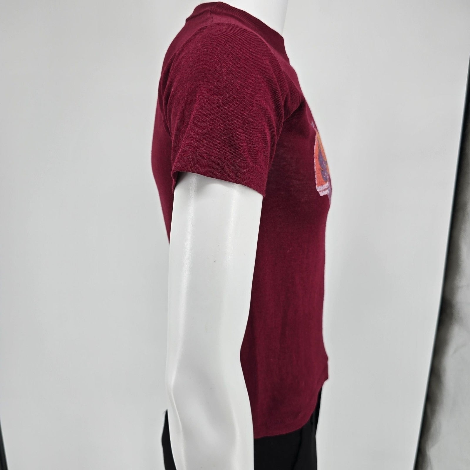 Notable Features: Single stitch cuffs and hem; surf graphic with sunset and stylized wave design; soft and thin; early 80s style fit with narrow collar and short torso