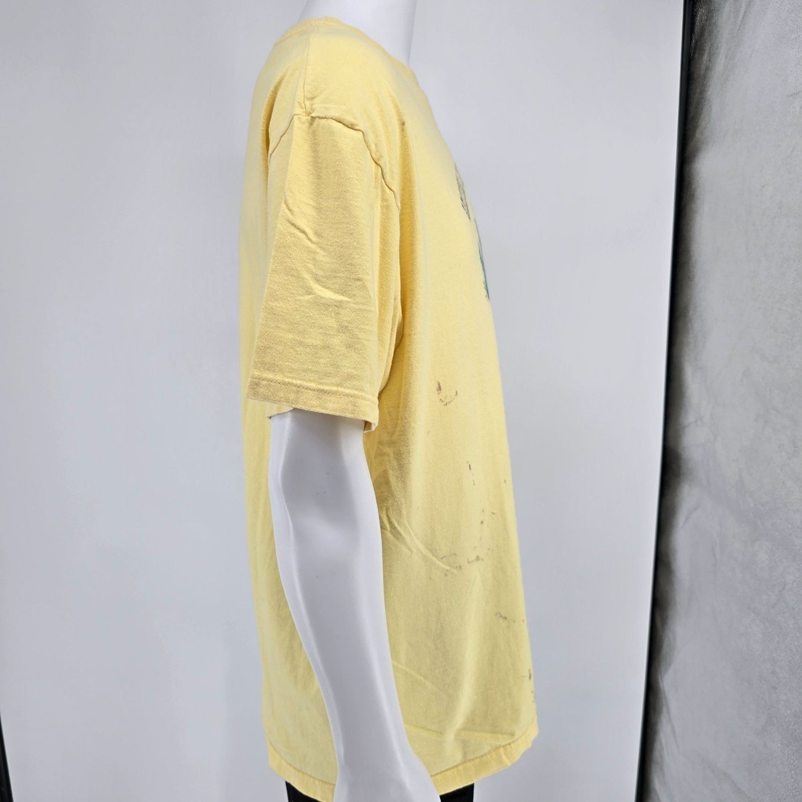 Heavy staining in multiple areas on front of shirt.