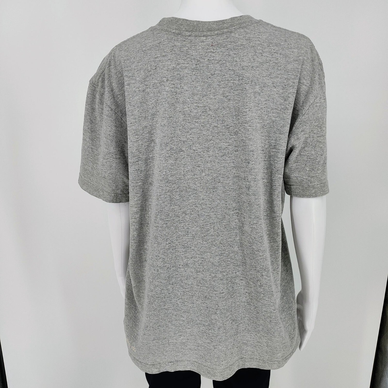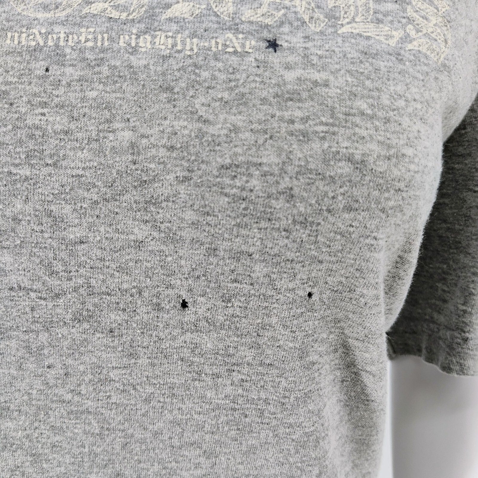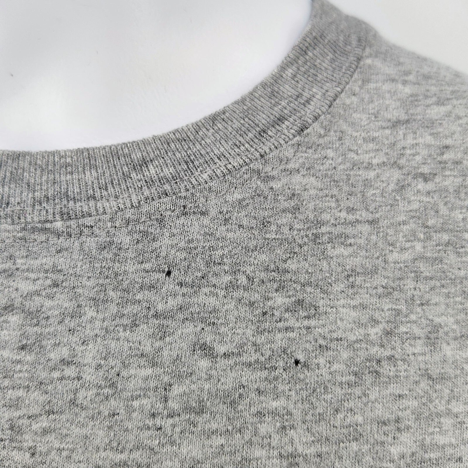 Condition Notes: Fair condition. Five small stains on front of shirt (three below logo, and two above logo). Mild yellowing at collar. Slight pilling. Moderate wear throughout. See photos.
