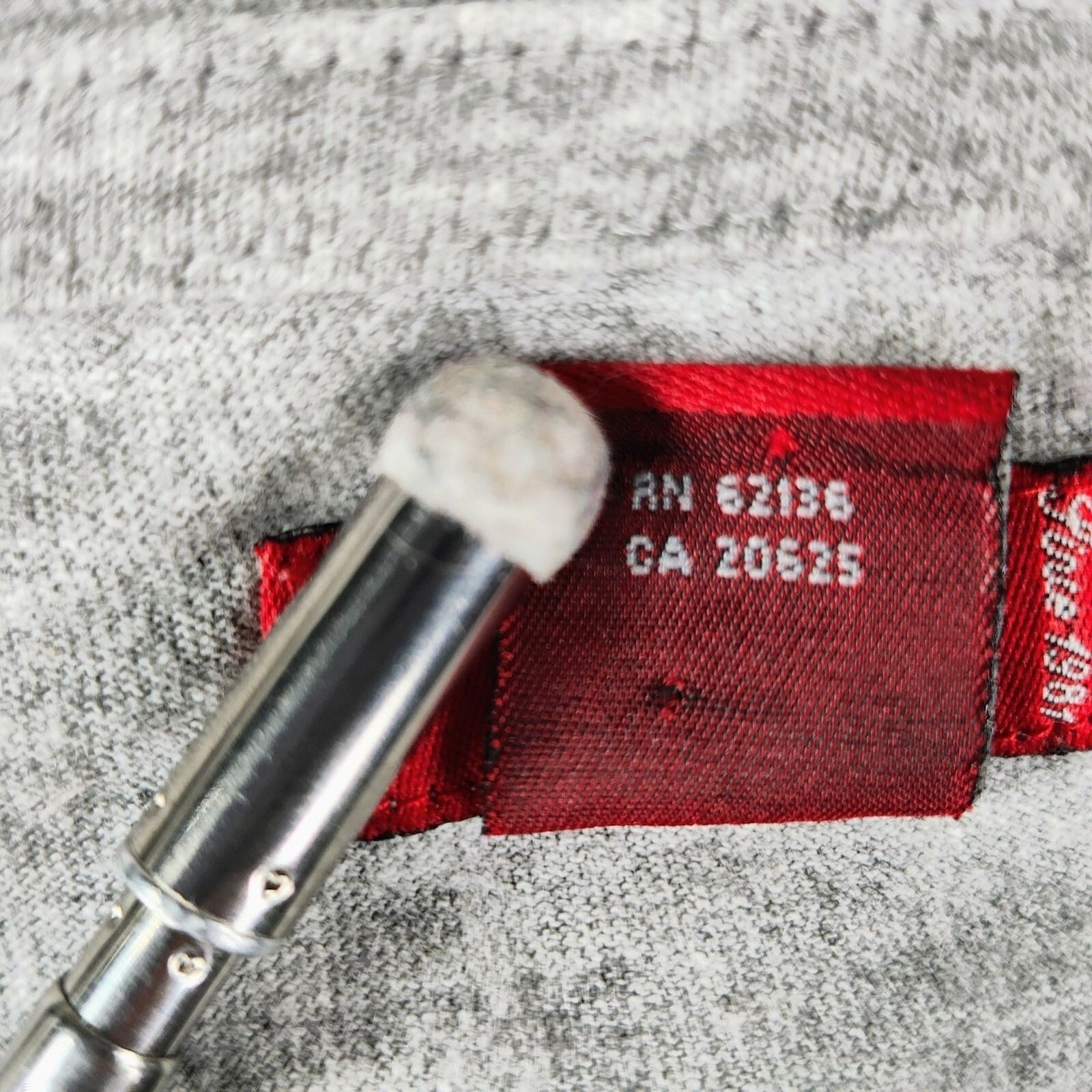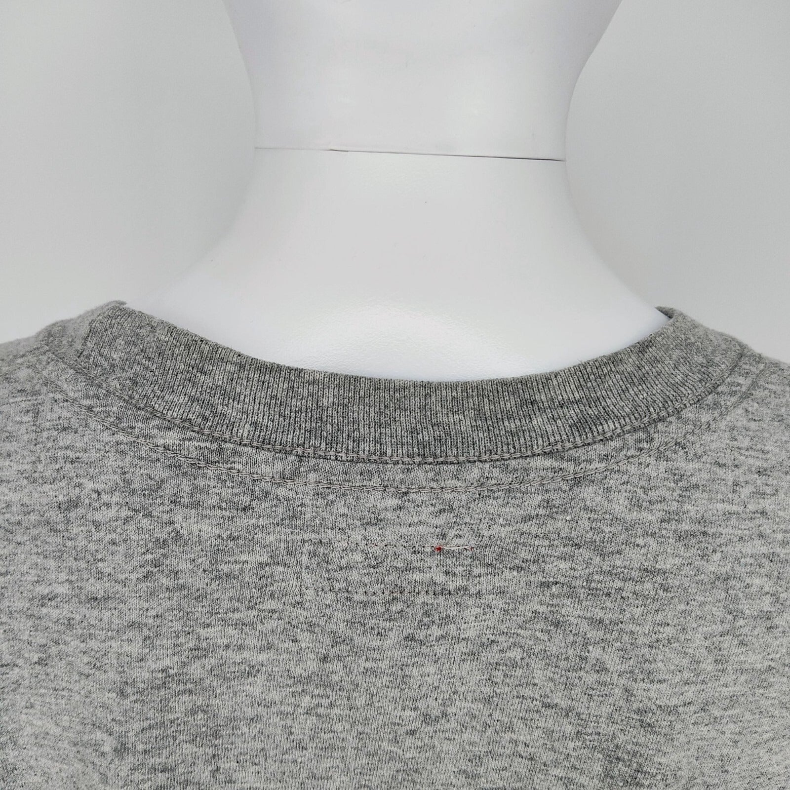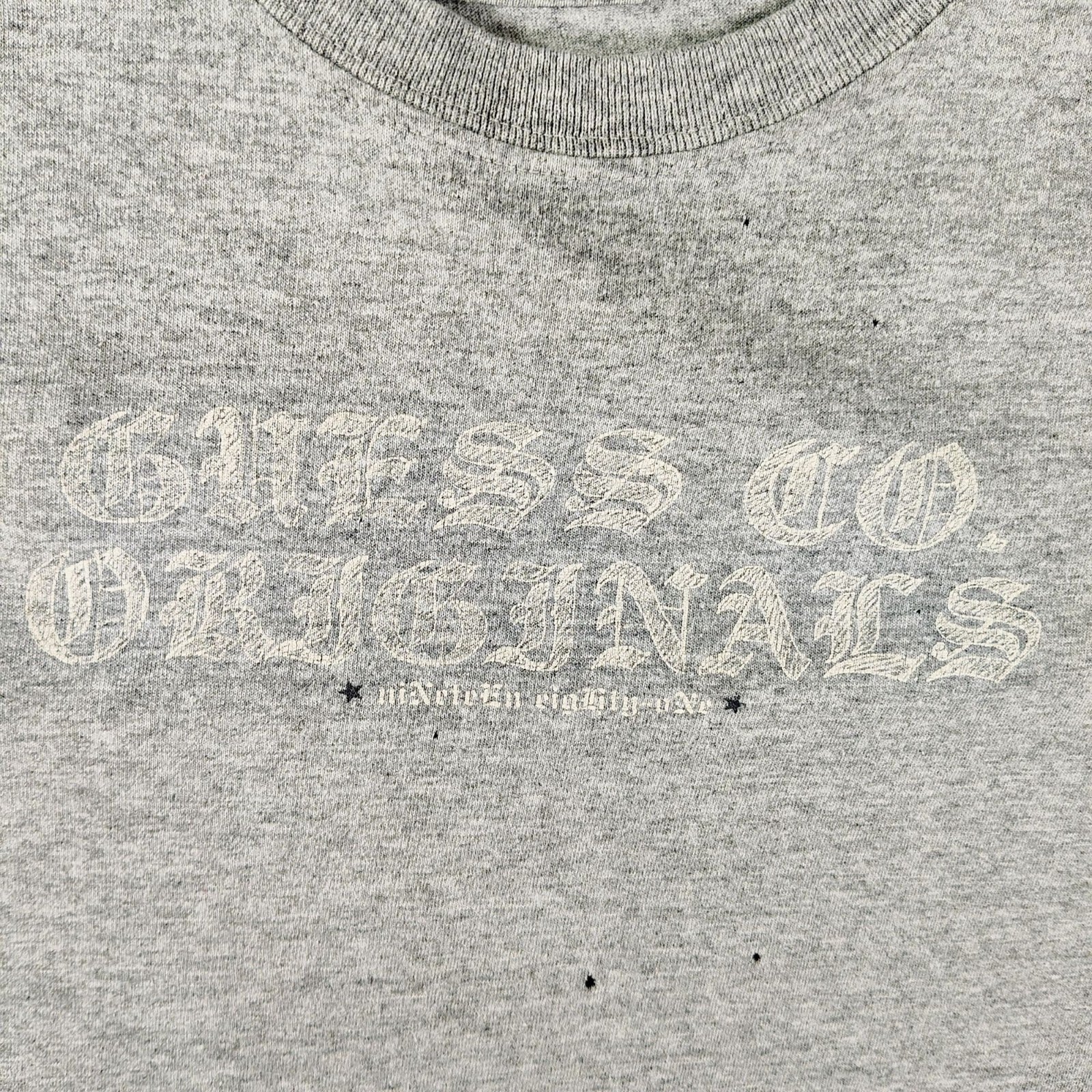 Condition Notes: Fair condition. Five small stains on front of shirt (three below logo, and two above logo). Mild yellowing at collar. Slight pilling. Moderate wear throughout. See photos.