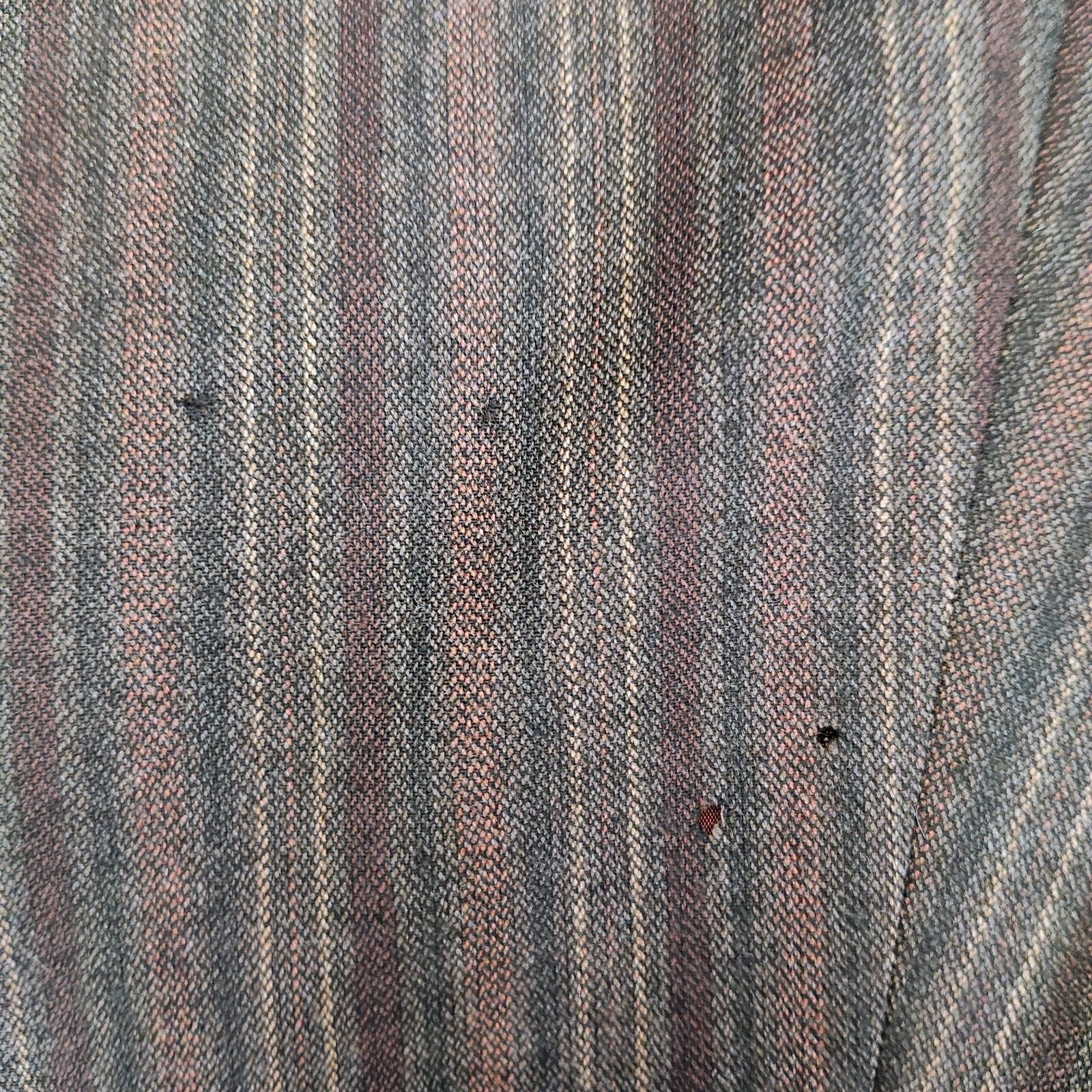 Fair Condition. At least ten small holes on the back of the jacket, concentrated near the collar (See Pictures). Fabric and Size tag missing. Feels like wool. Listed size is based off of measurements.