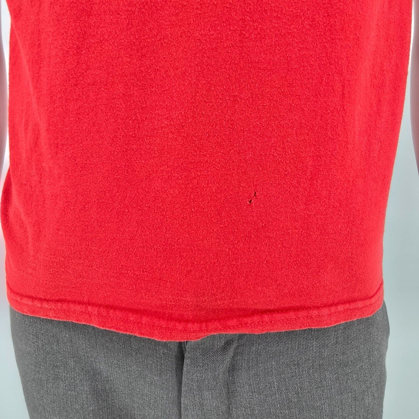 Condition: Fair condition. Two small holes on front near bottom of shirt. Spots of dark discoloration on the front of the shirt (in middle) and back of shirt (above logo). Moderate wear throughout.