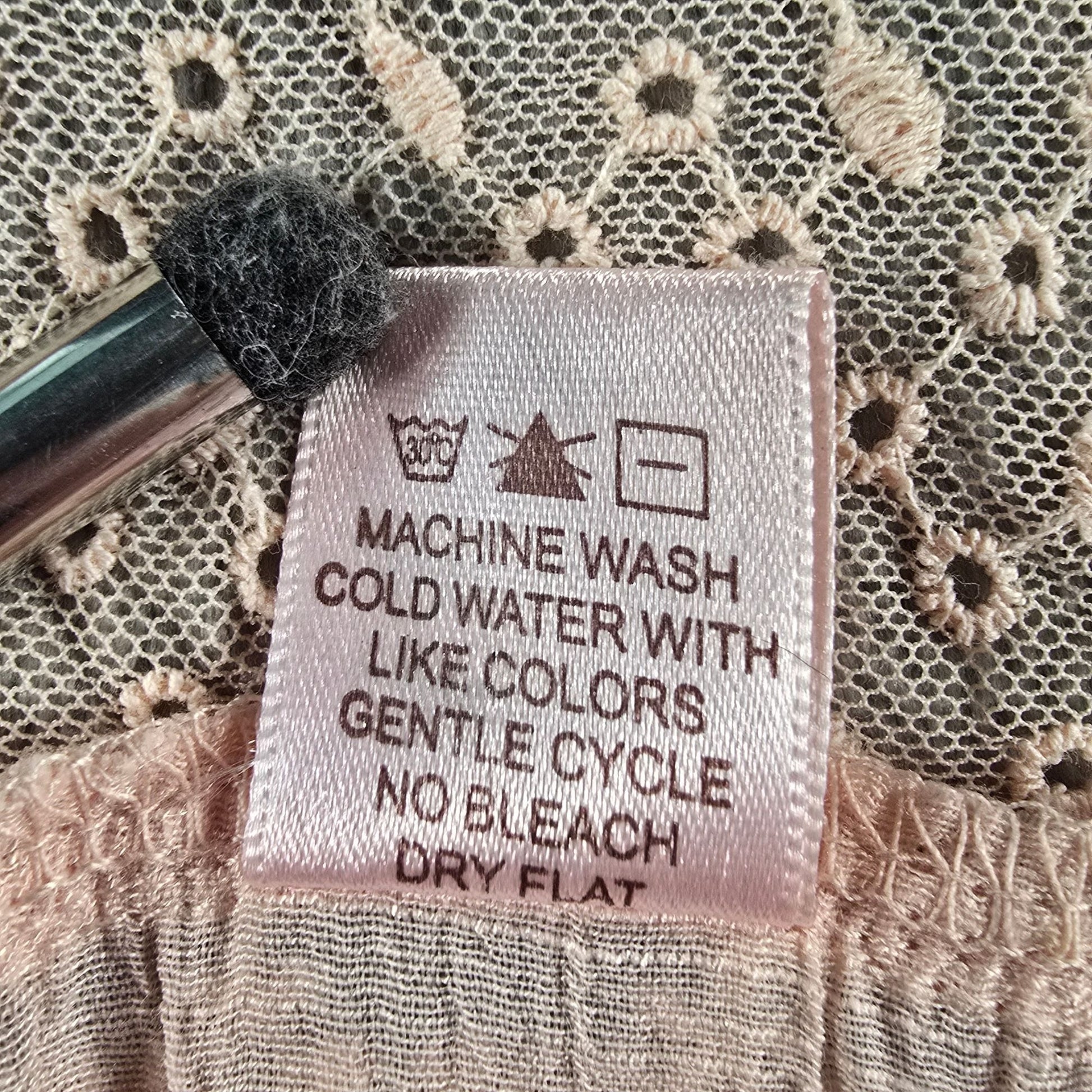 Notable Features: Floral Lace Trim; Self-tie slash at waist; Decorative faux button placket (buttons are nonfunctional)