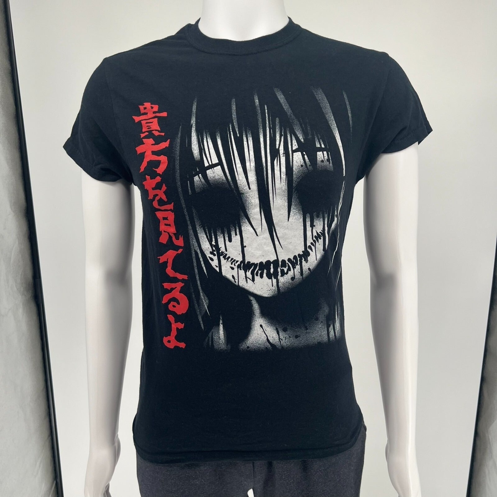 Description from the Manufacturer: Add a tinge of horror to your wardrobe with this graphic tee! This black t shirt, with kanji meaning "watching you," is sure to get you noticed and help you embrace your dark side.