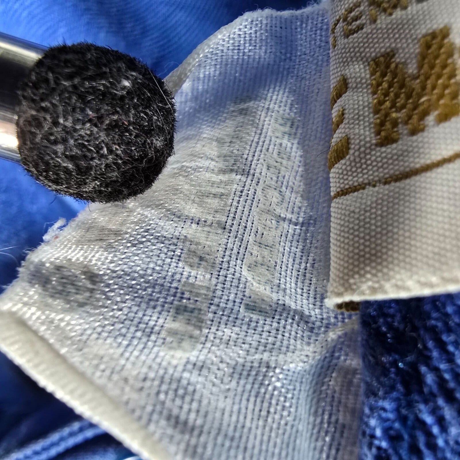 Back pocket ripped off, with two holes at top corners of where the pocket once was.