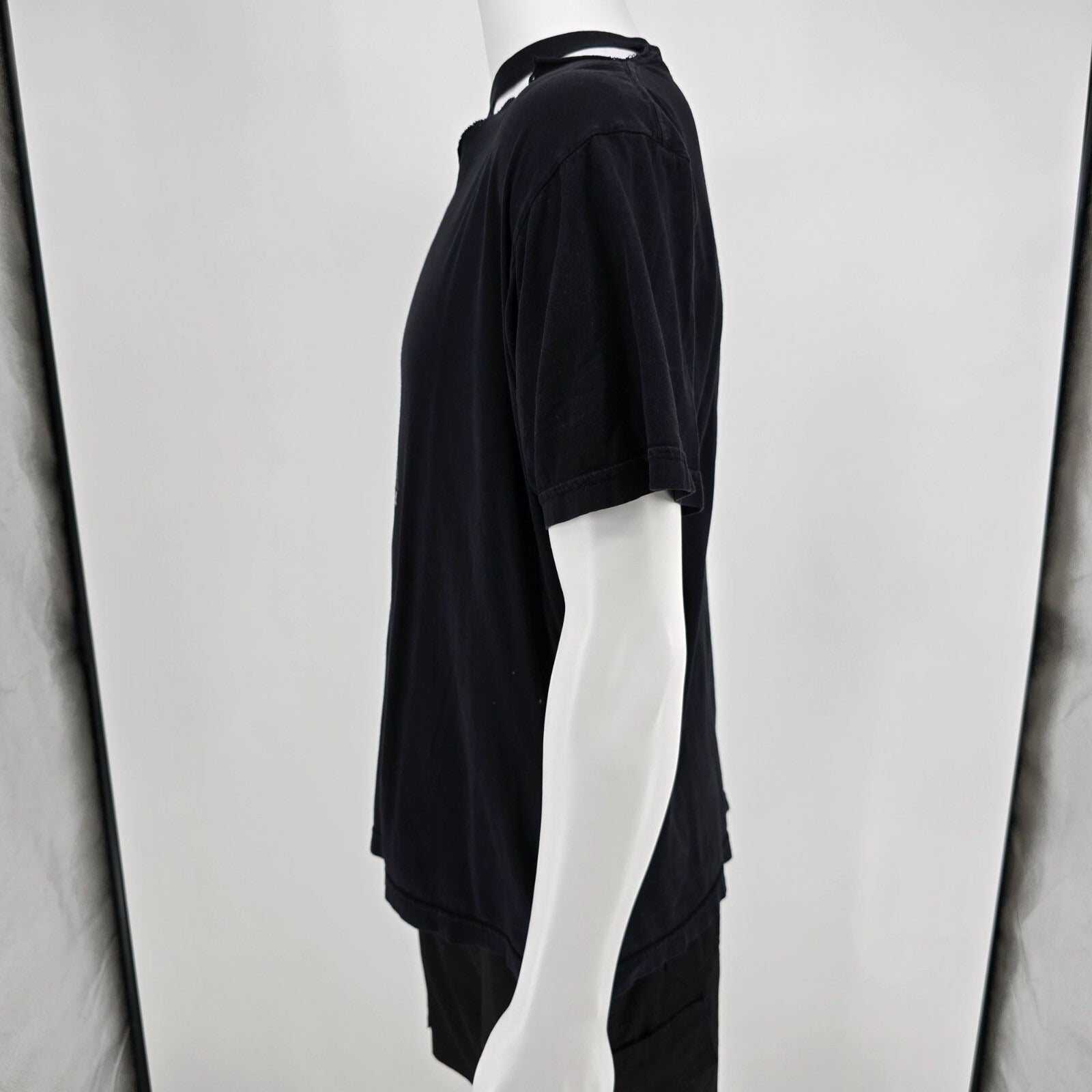 Large rip separating collar from body of shirt across the front of the shirt, extending to a seam split where the collar meets the left shoulder.