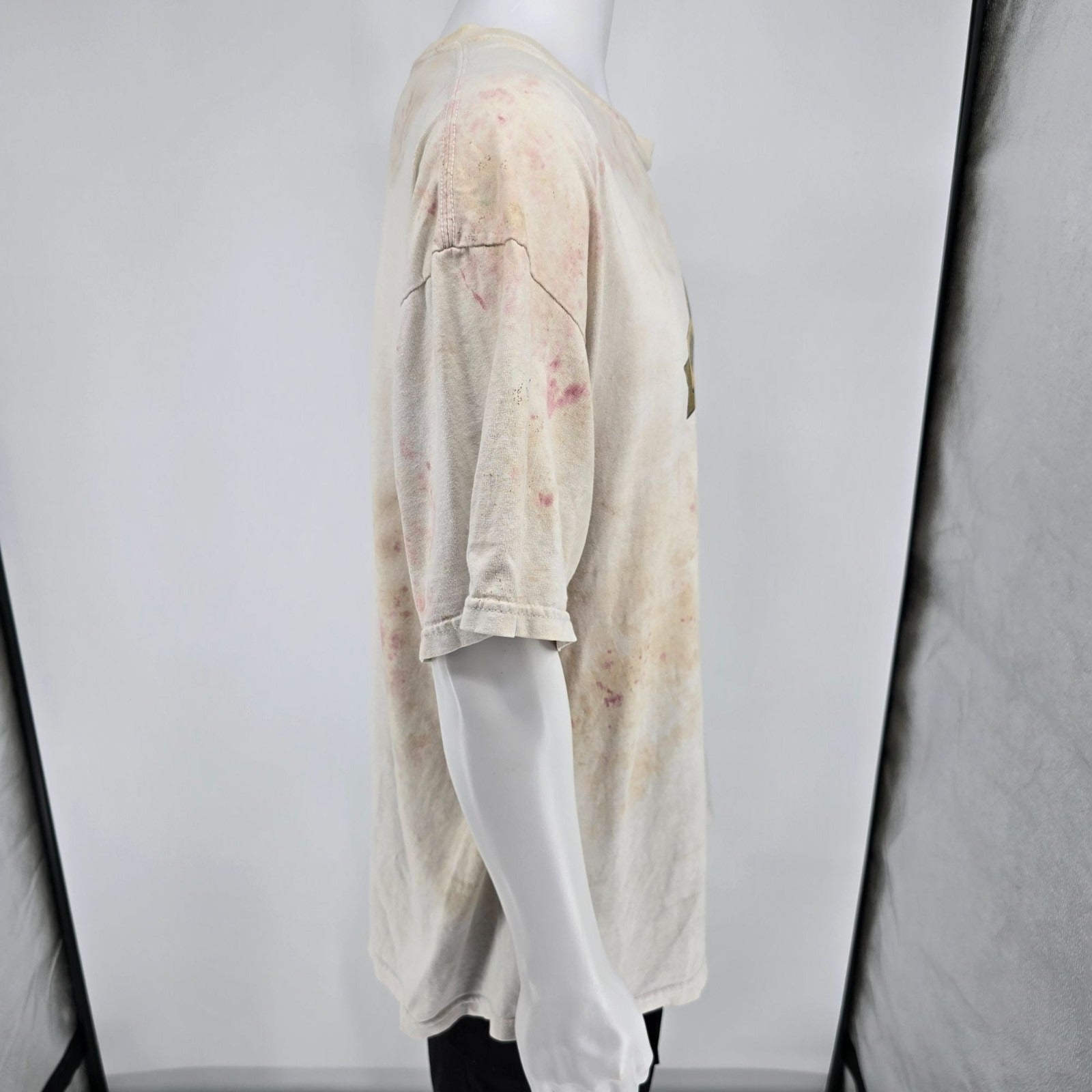 Very heavy multi-colored staining/discoloration on the entirety of the right side of the shirt on both the front and back and under the front collar.