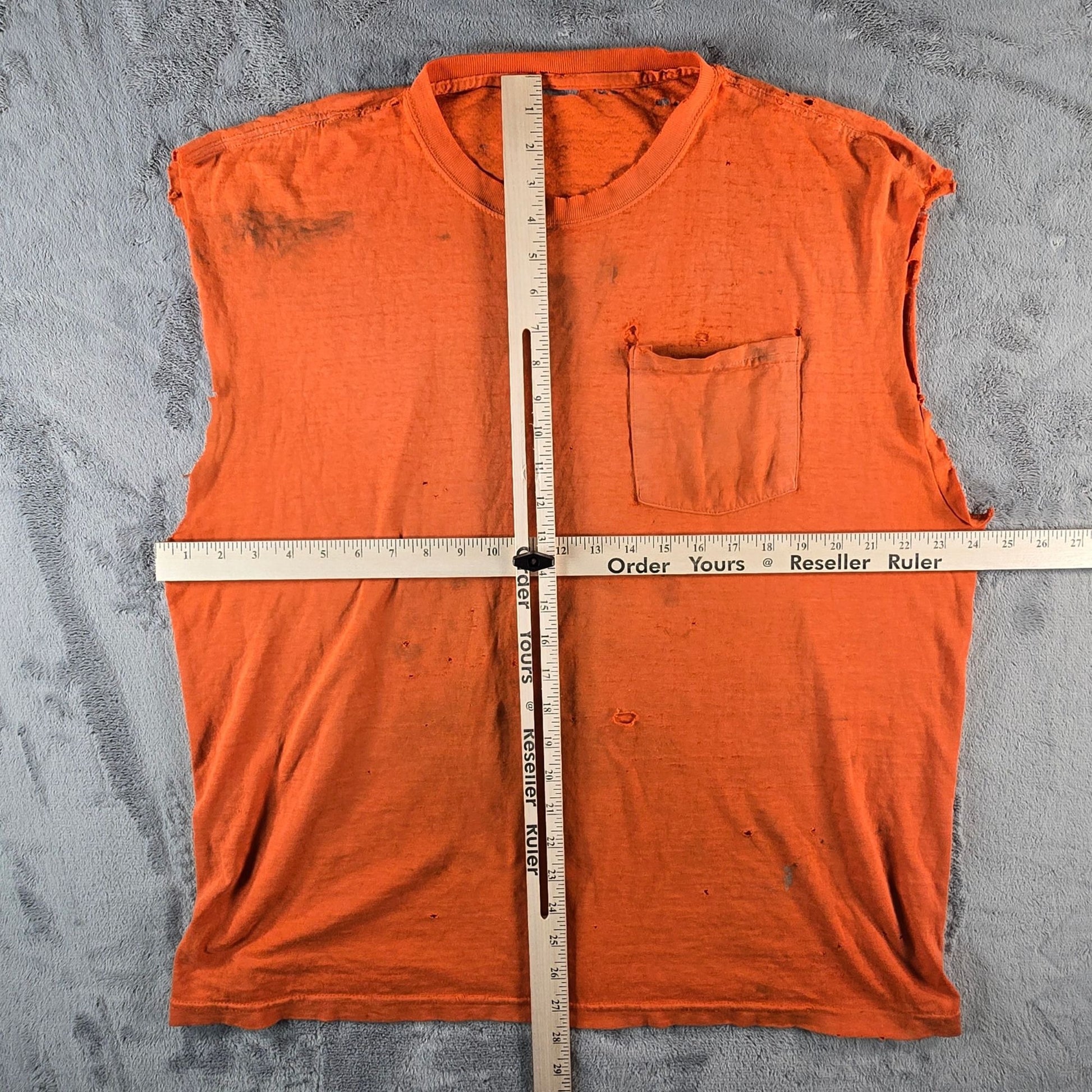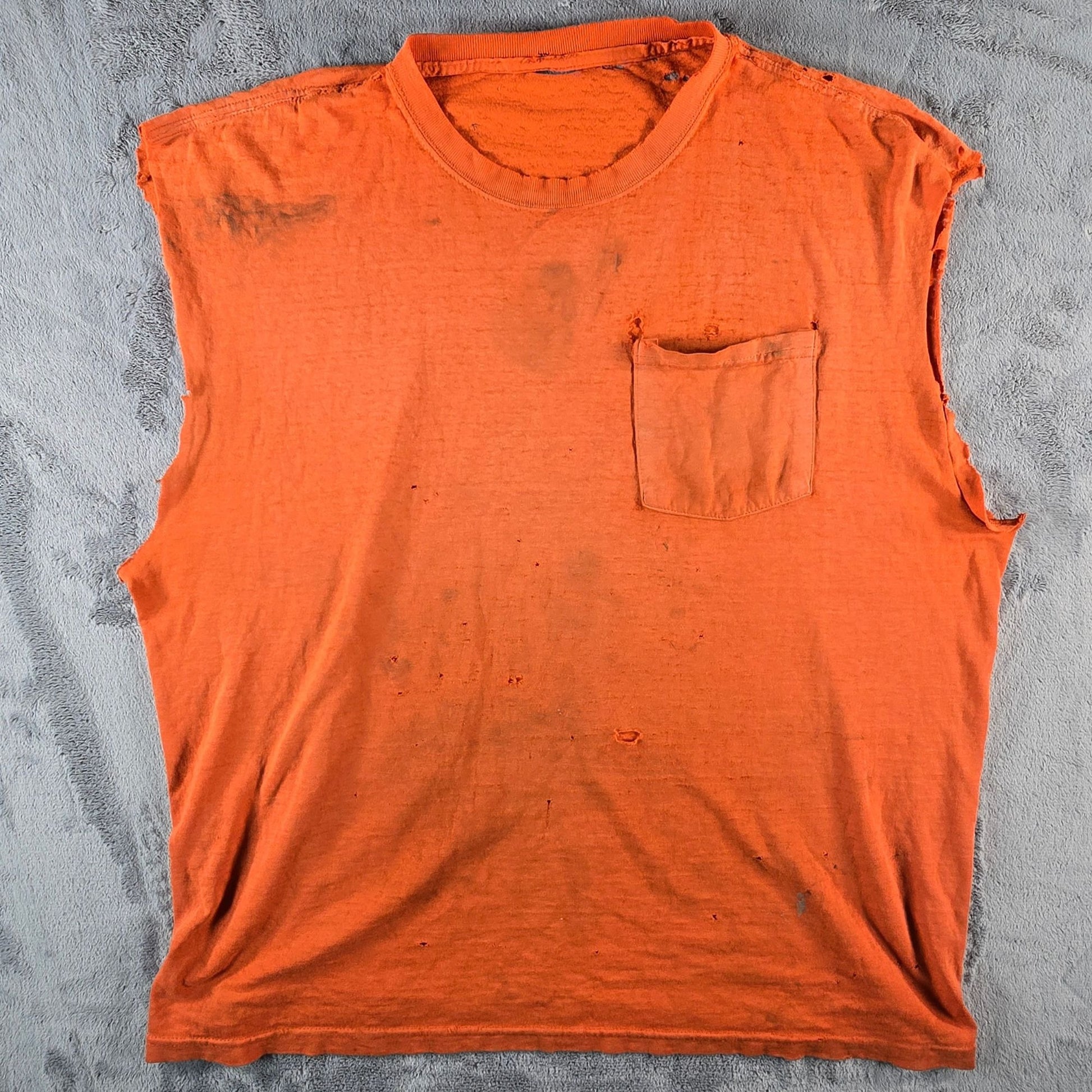 Fai/distressed/thrashed used vintage condition. Tag cut out. Sleeves cut off with ragged and fraying edges. Very heavy fabric wear throughout with many holes and tears. Heavy staining and discoloration throughout. See photos for details.