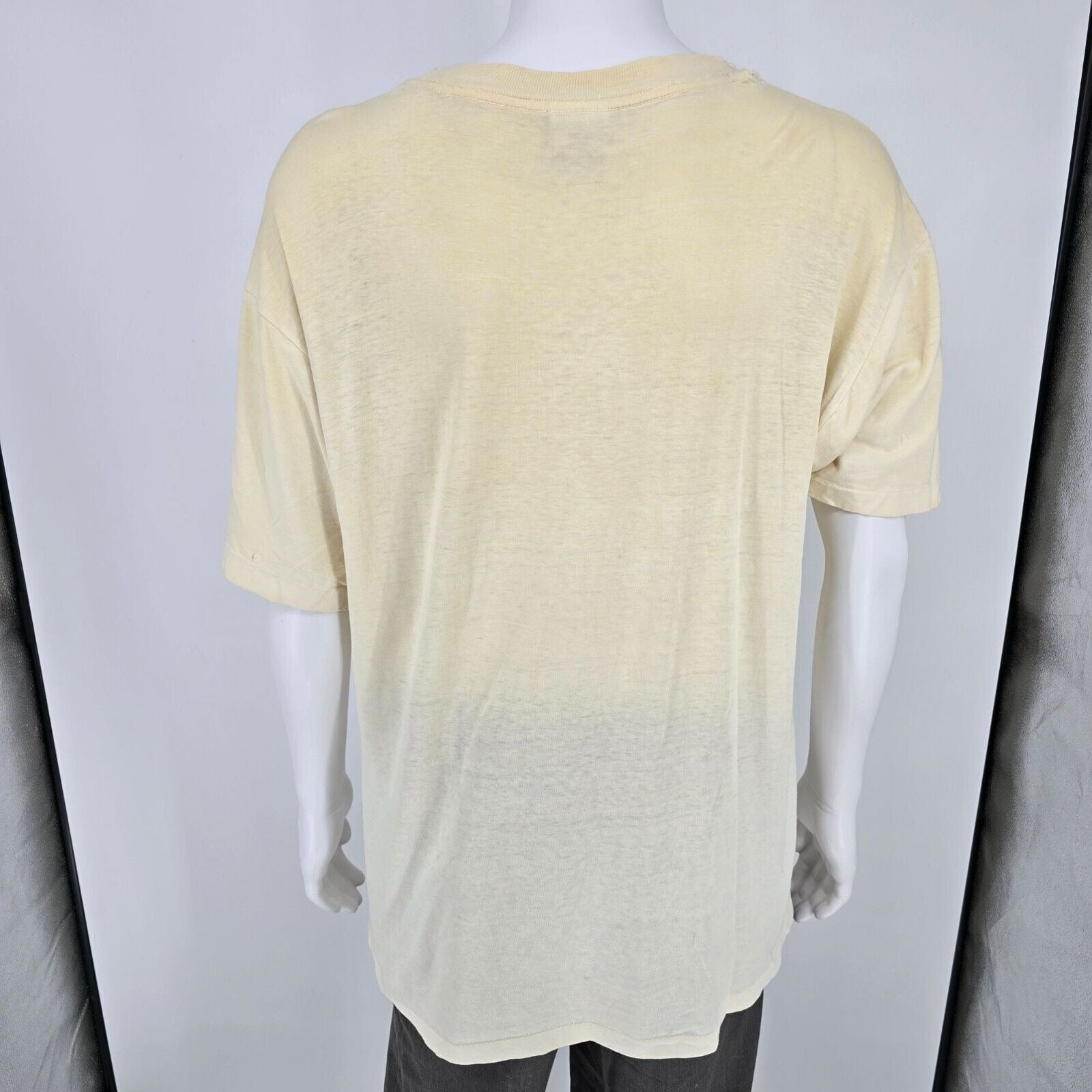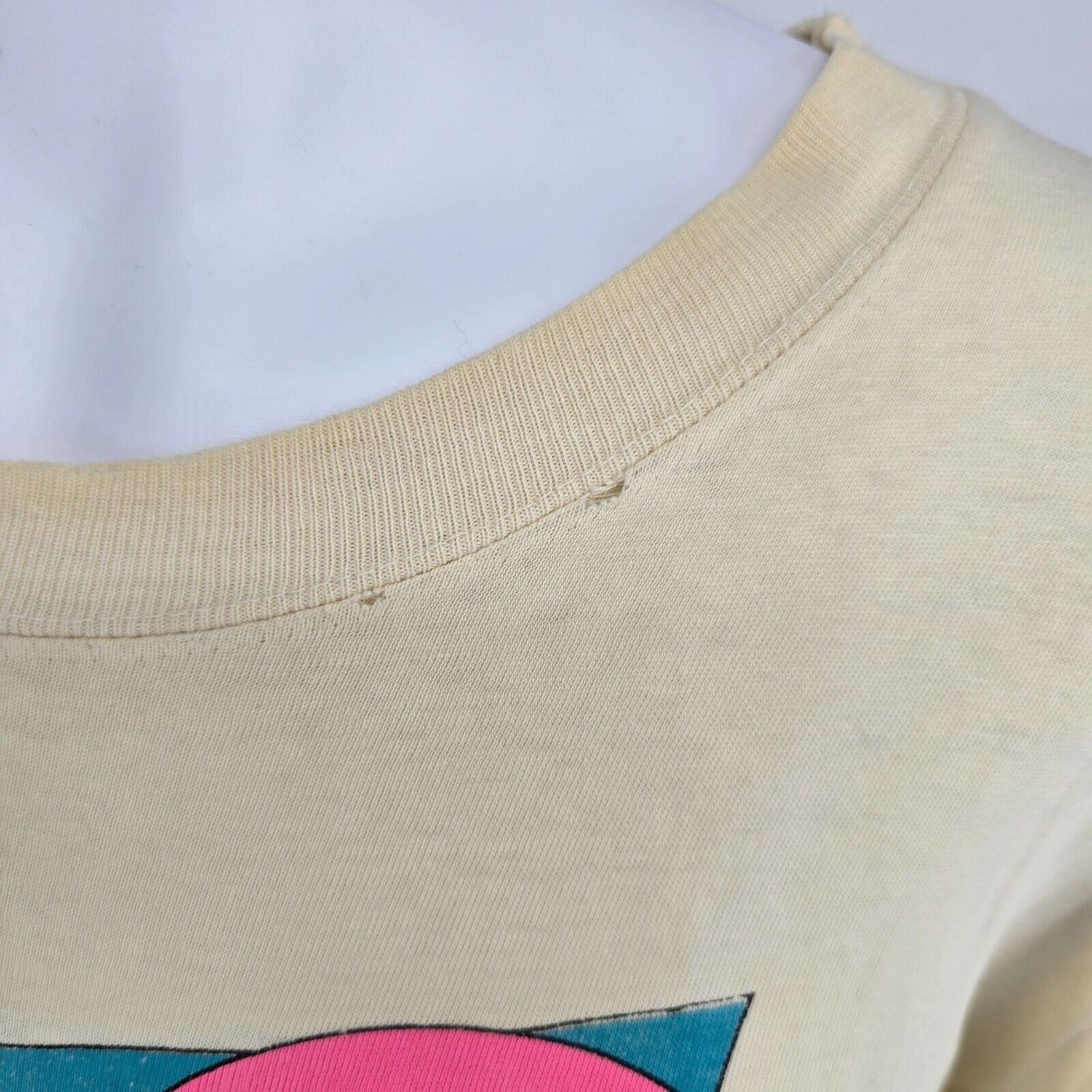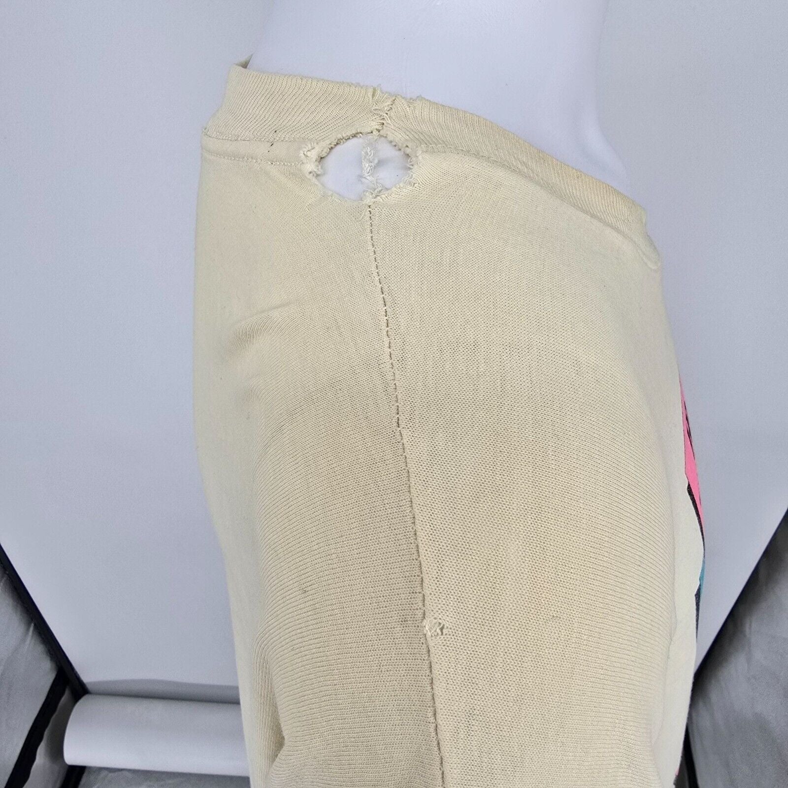Condition Notes: Fair/thrashed vintage condition. Heavy discoloration throughout. Stain on front of shirt above logo. Black marks running across front of shirt below logo. Small brown stains on front left side below logo. Two small holes at bottom of front near hem. Large hole/seam split at right shoulder. See photos.