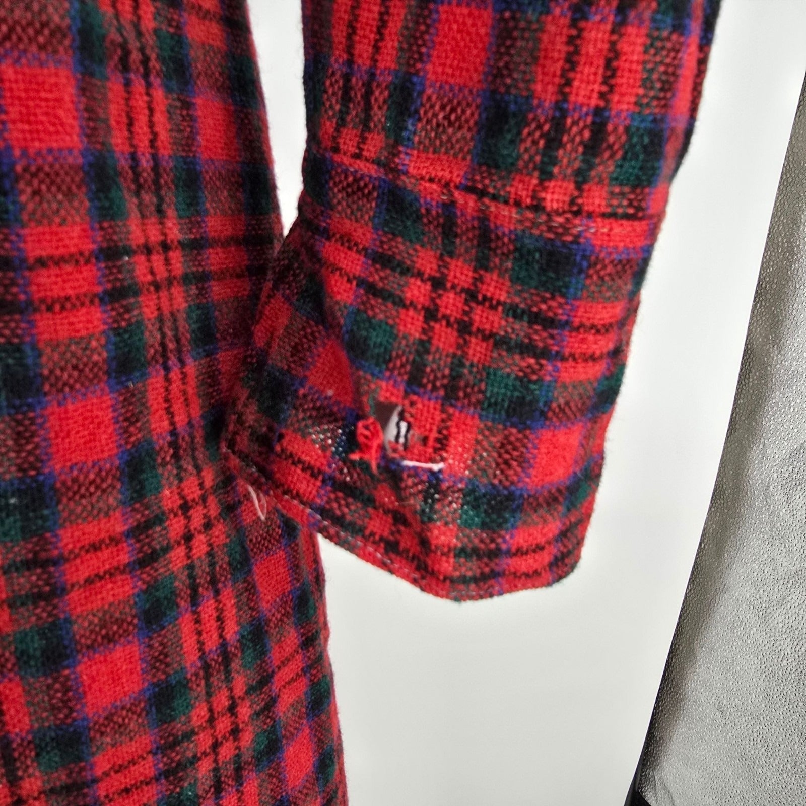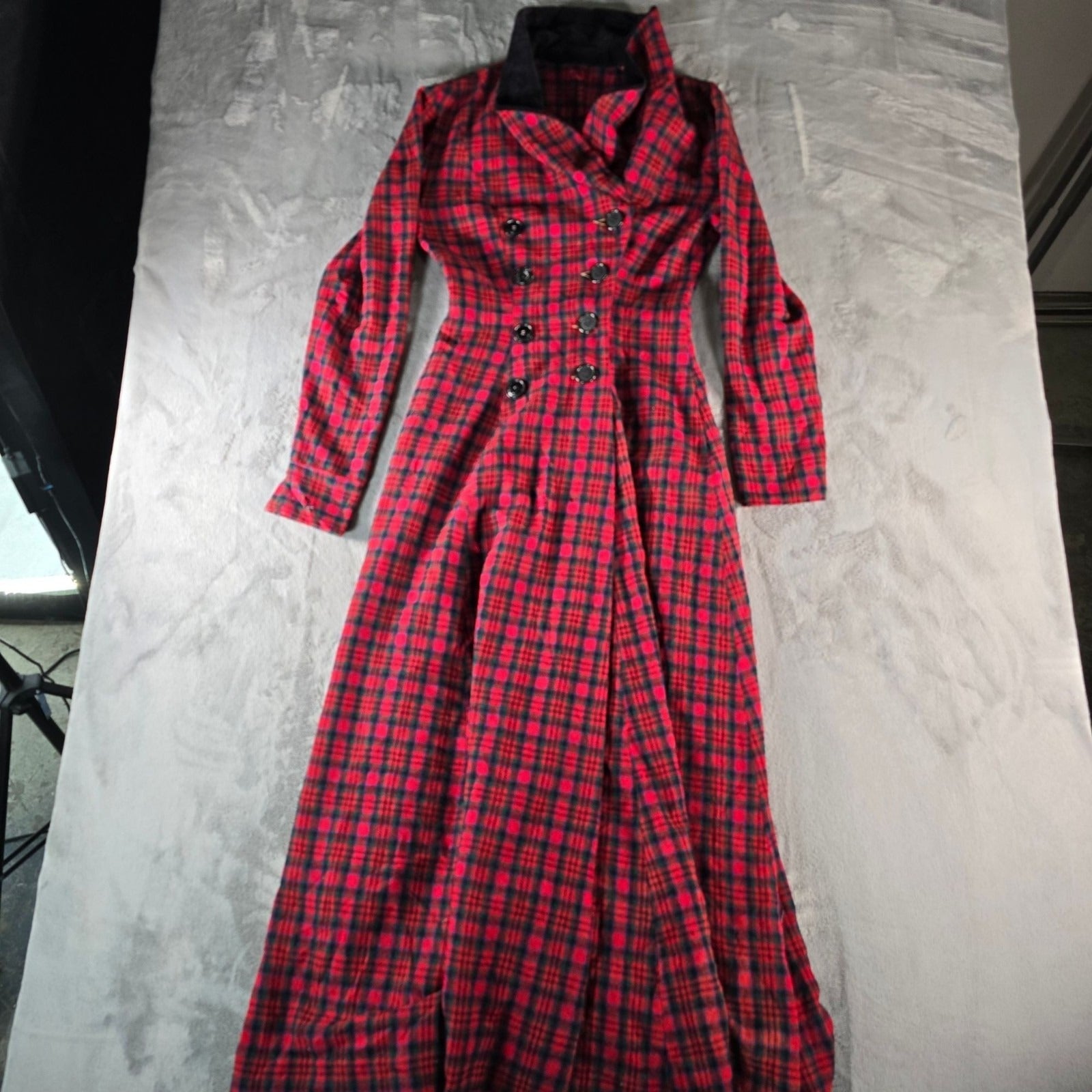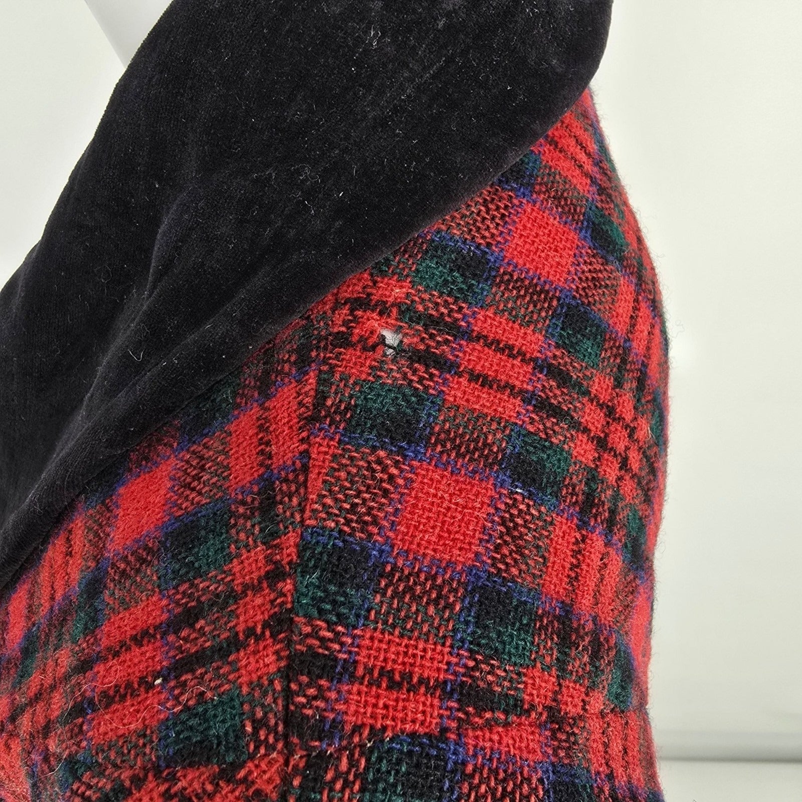 Color: Red tartan plaid with black velvet collar (with green/blue/black accents)