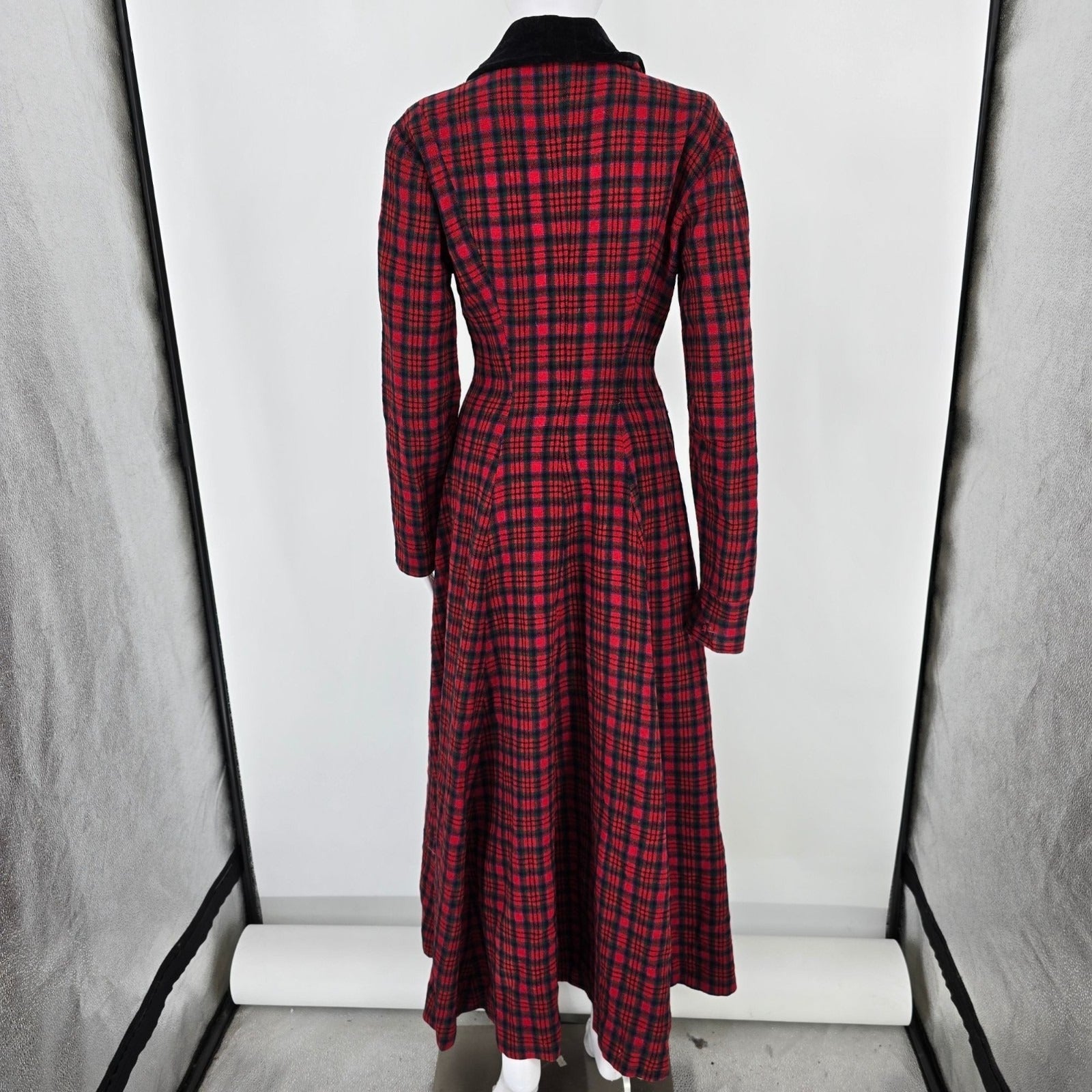 Vintage 1940s Raymond New York Velvet Collar Tartan Plaid Wool Long Coat (S)