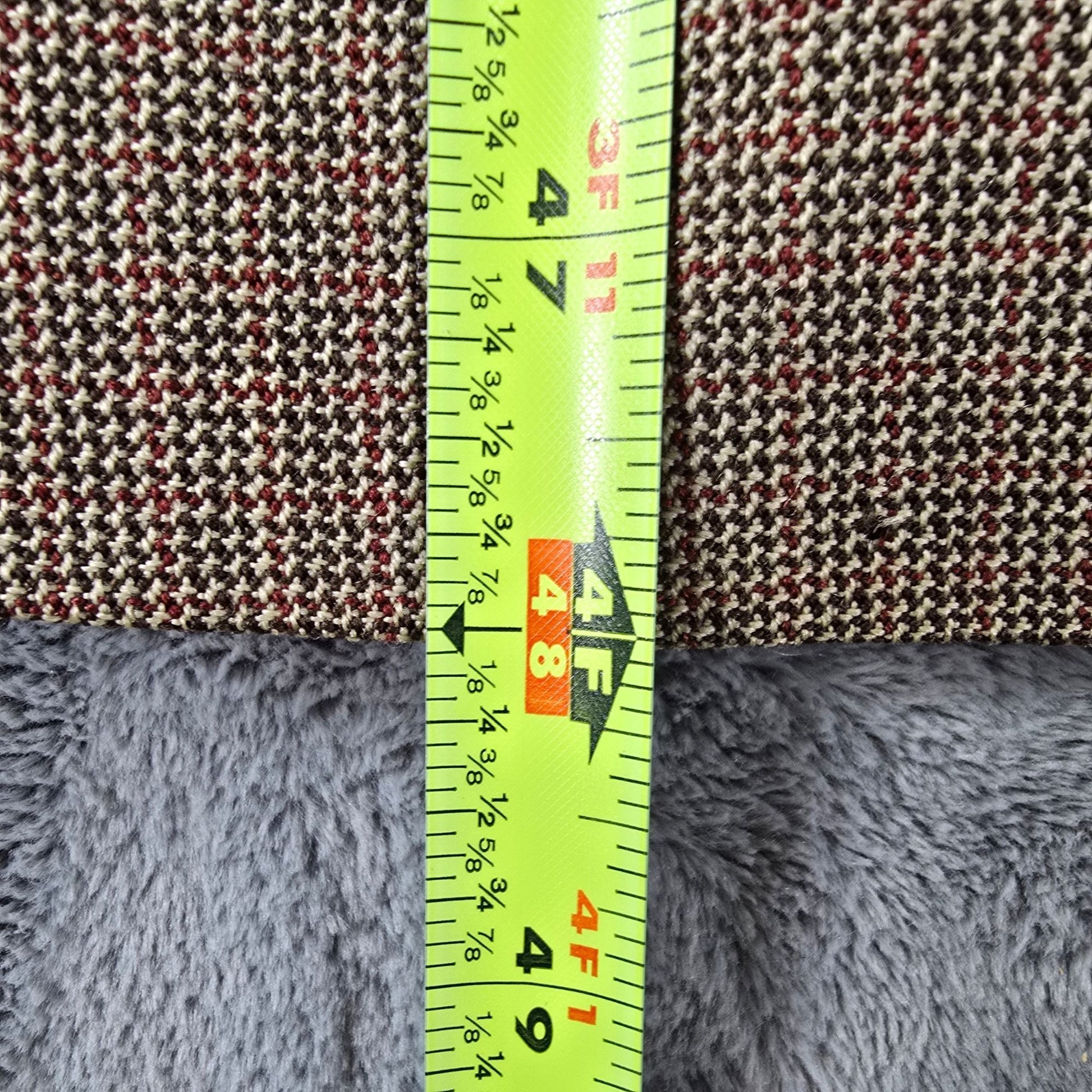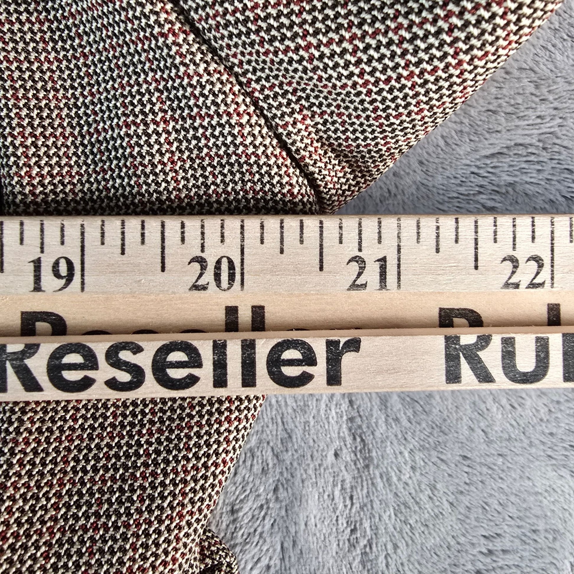 Color: Brown micro-houndstooth check with cream and red tones; Rust satin lining