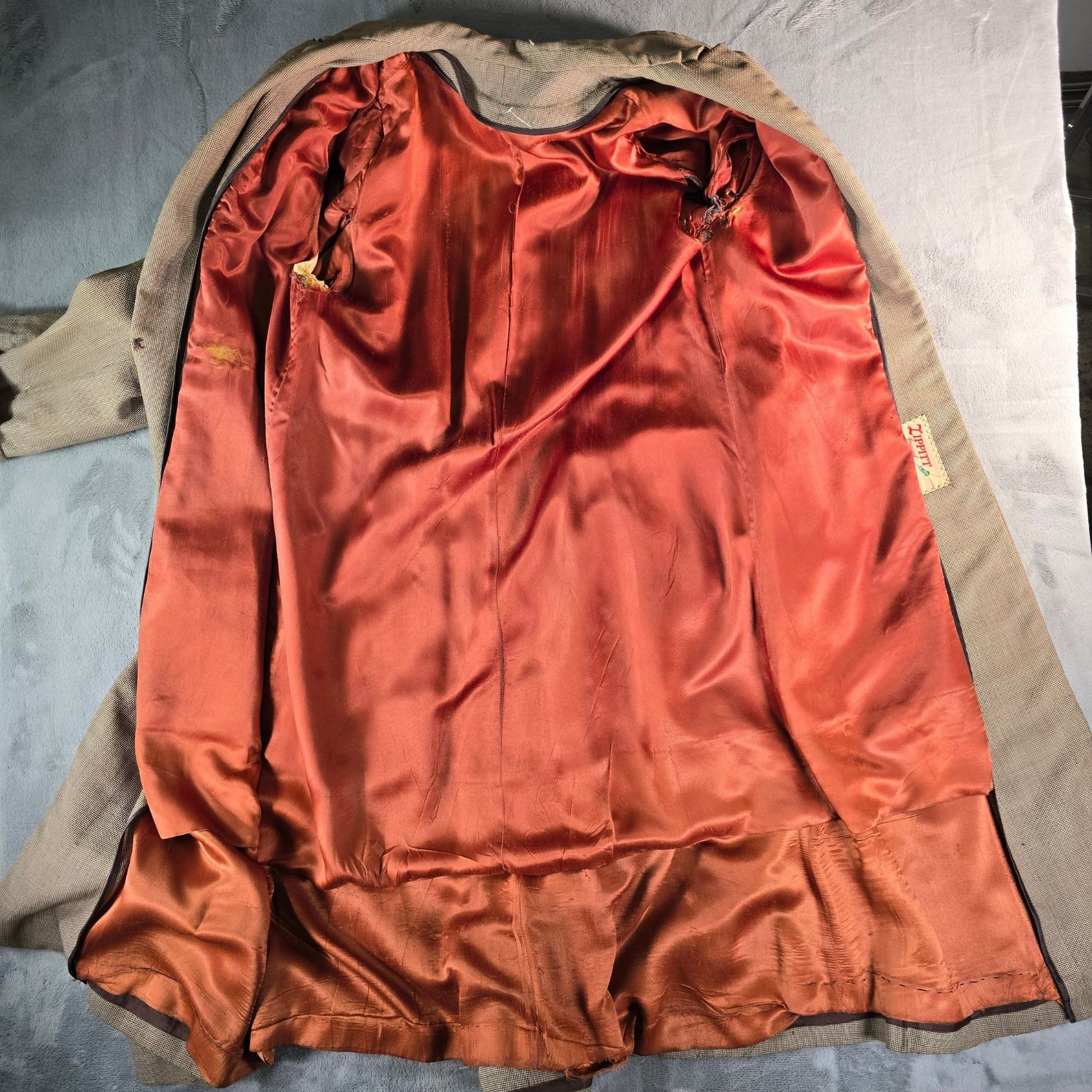 Fair/distressed used vintage condition. Large number of moth bites scattered throughout. Multiple missing buttons. Large tears in linings (both the attached lining of the coat and the separate zip-in lining). Moderate to heavy wear throughout. See photos for details.