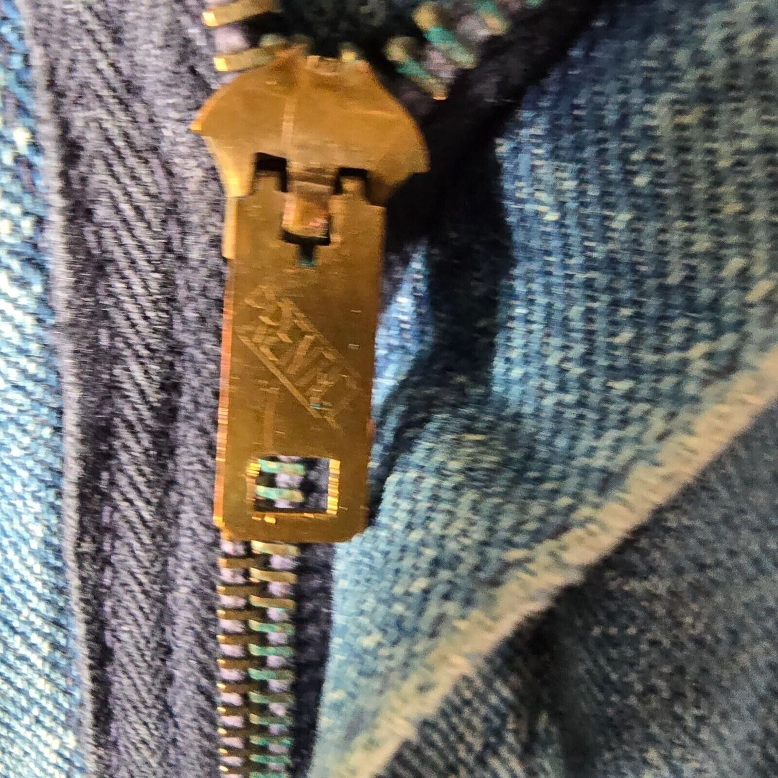 Condition Notes: Fair to poor used vintage condition. Massive hole on back of right left running from crotch seam all the way to knee. Additional holes around the seam and evidence of prior repair at the seams. Missing leather patch on back pocket. Heavy wear, staining, and fading throughout. See photos.