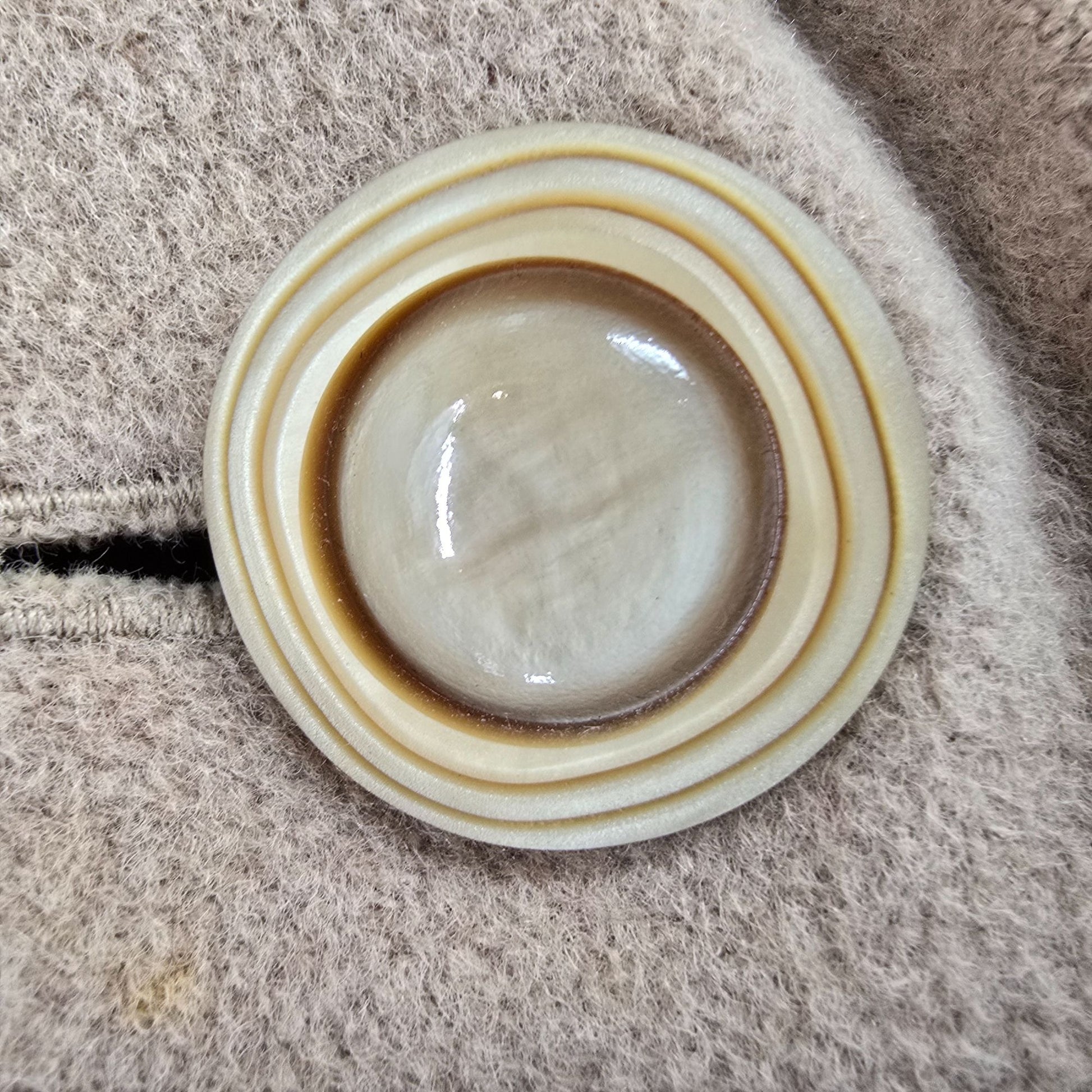 Good overall used vintage condition. Outer shell has no rips, cuts, holes, or tears. Some small stains on front between bottom button and hem. . Two small stains on bottom third of jacket on back. Lining has a couple of small tears between shoulders. Cashmere tag is partially detached. Generally light to moderate wear throughout. See photos for details.