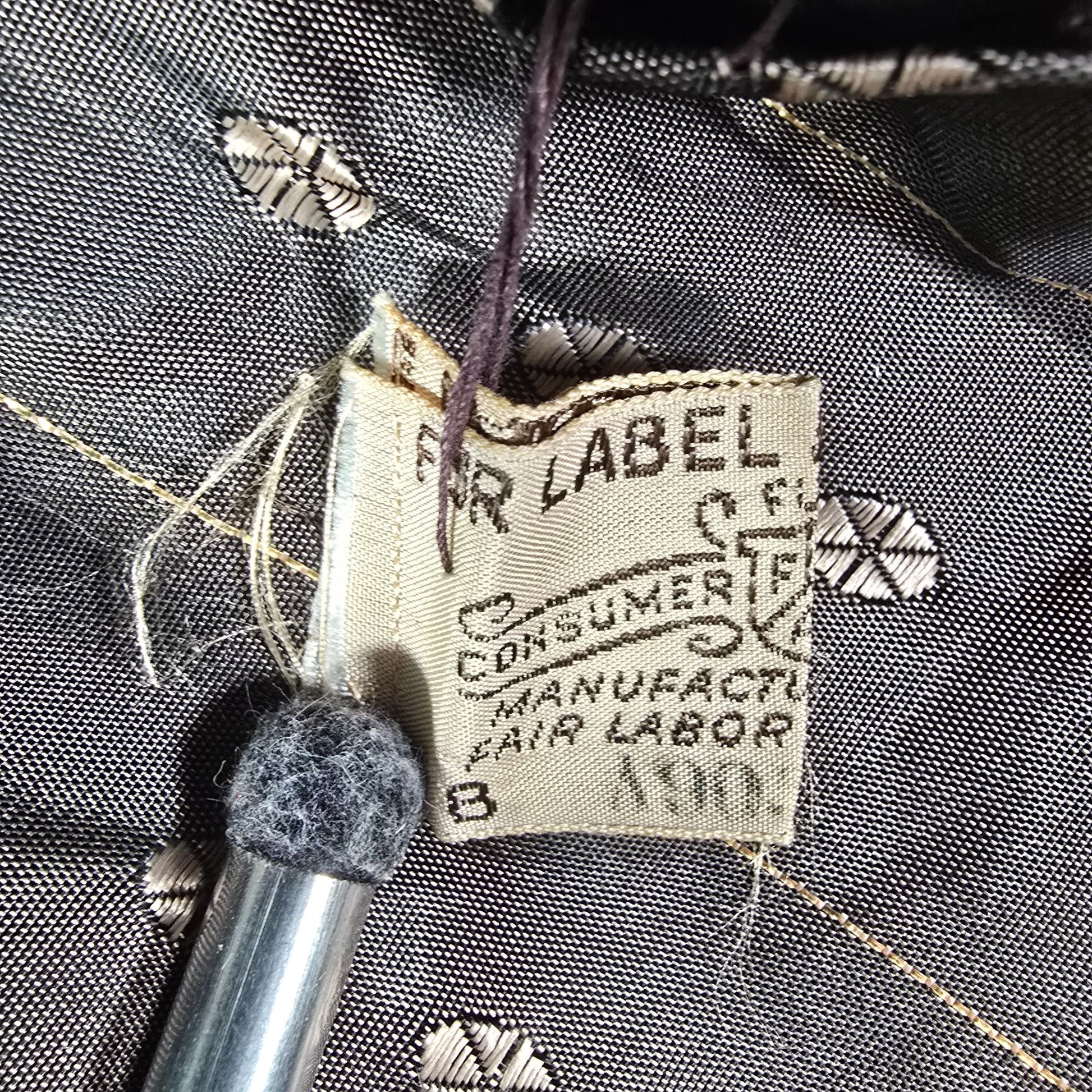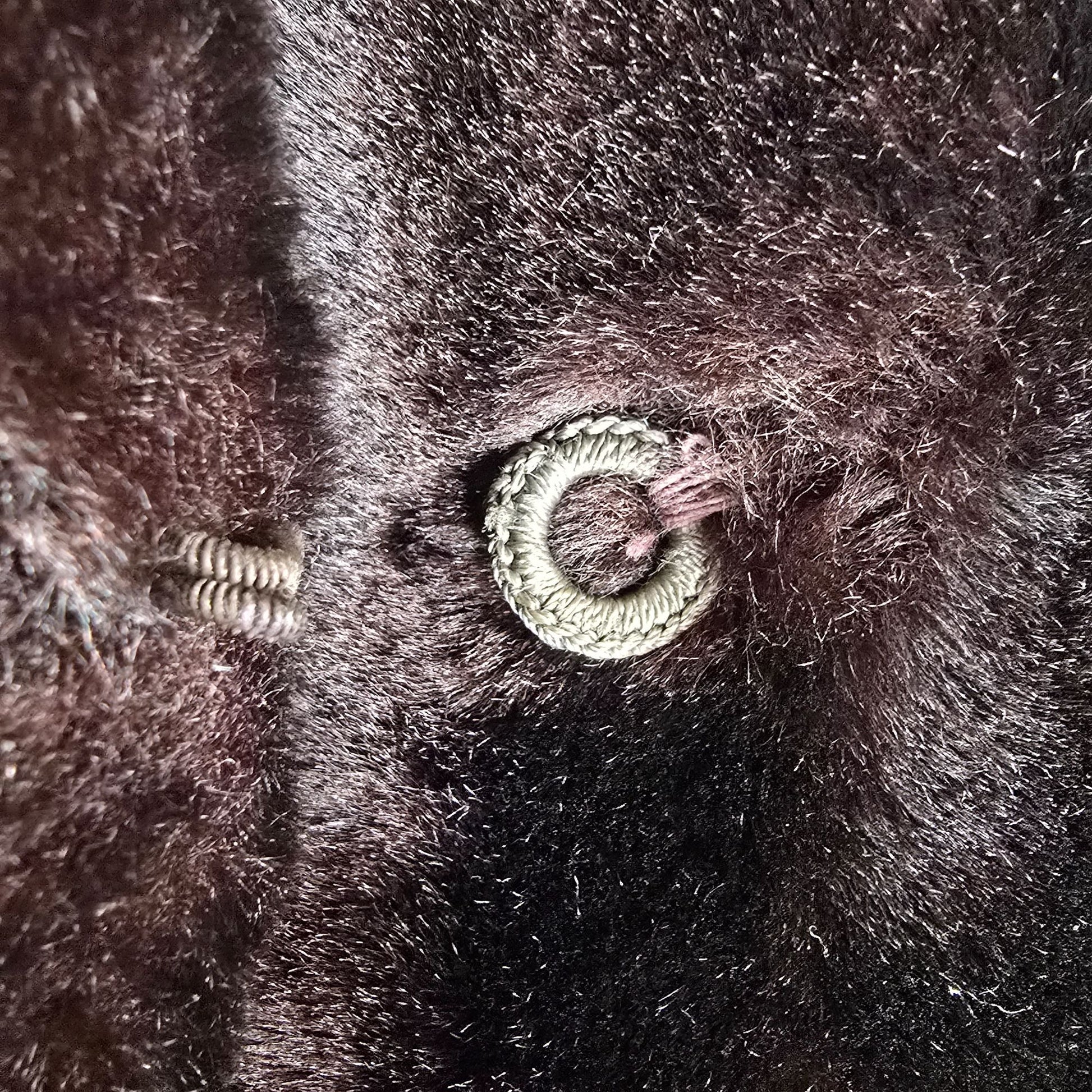 Fair used vintage condition. Jacket is wearable. Fur is in very good condition. Jacket has a one-inch panel separation at top of right shoulder. Satin lining has large seam split at right shoulder. Lining is partially detached (loose at left shoulder and at bottom hem). Metal hardware has some rust. One hook is missing. See photos for details.