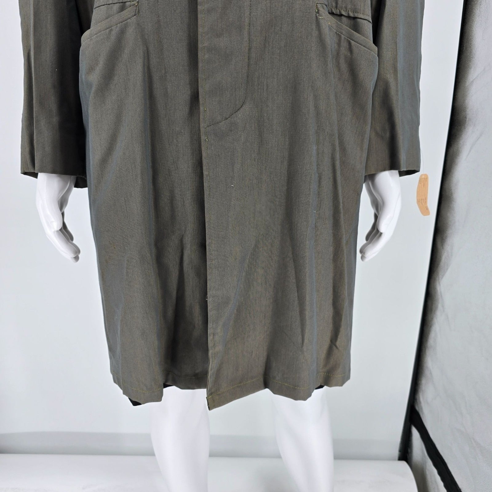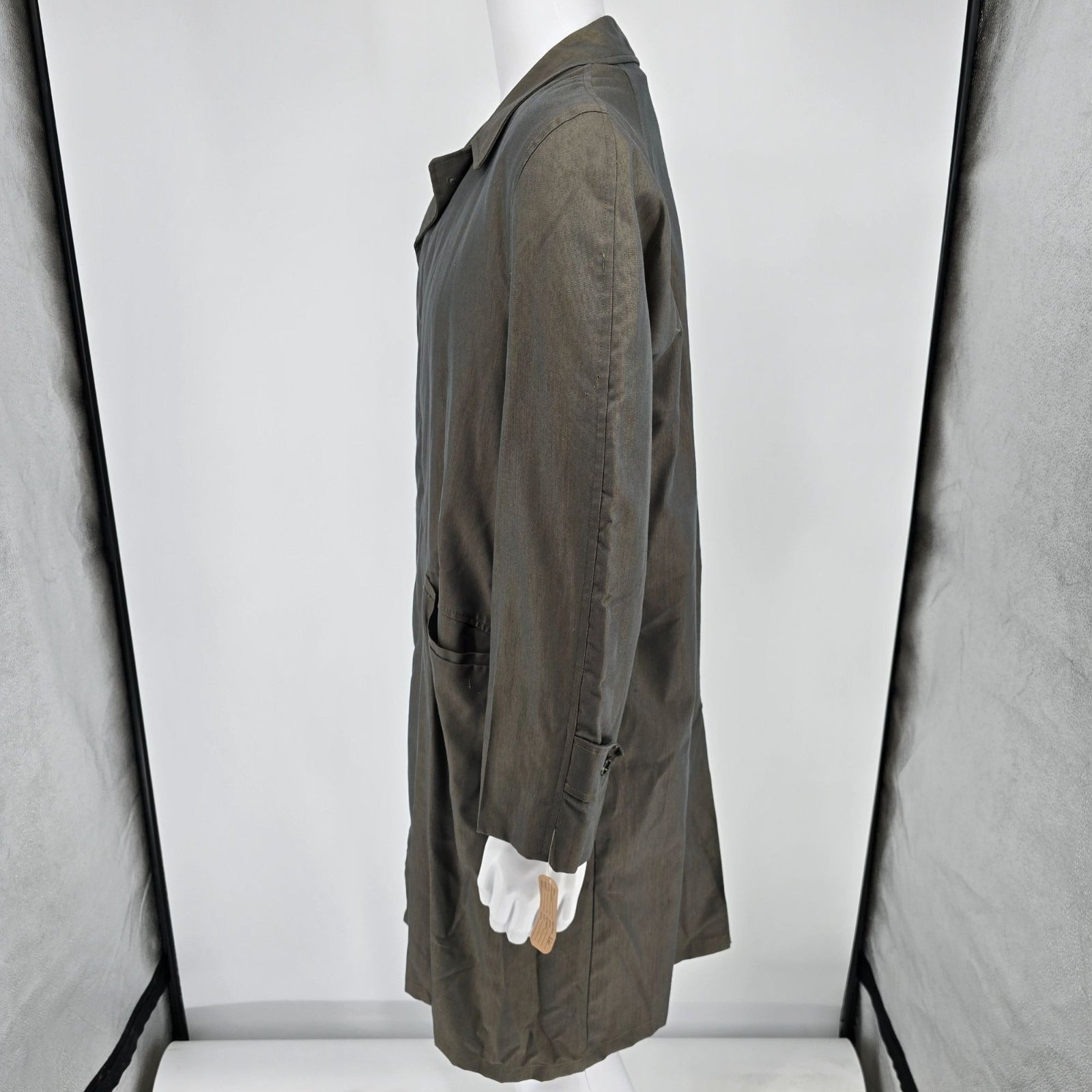 Notable Features: Single-breasted raincoat silhouette; Fly front (hidden buttons); Back Vent; Satin Stripe Lining