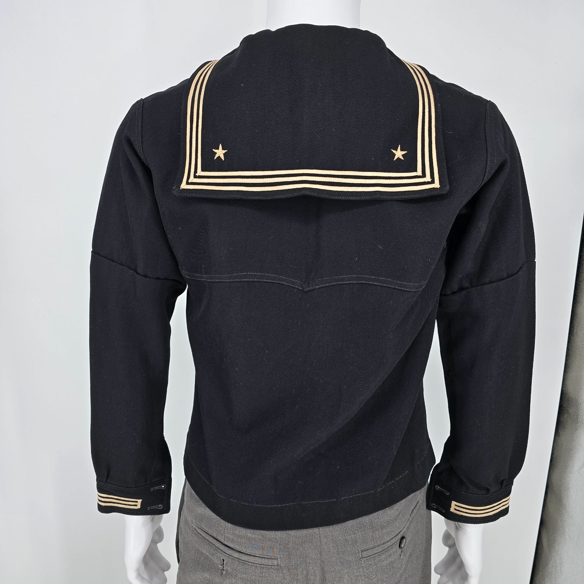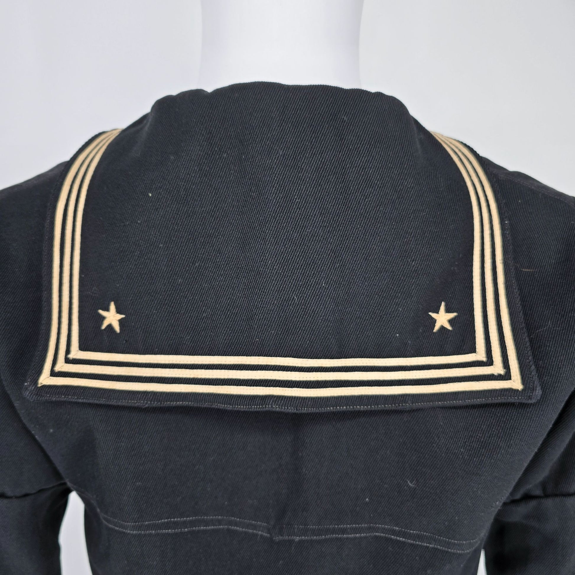 Notable Features: Sailor collar with triple cream stripes and two embroidered stars, horizontal chest pocket, anchor-embossed cuff buttons, triple-striped cuffs, cropped/naval jumper silhouette, unlined
