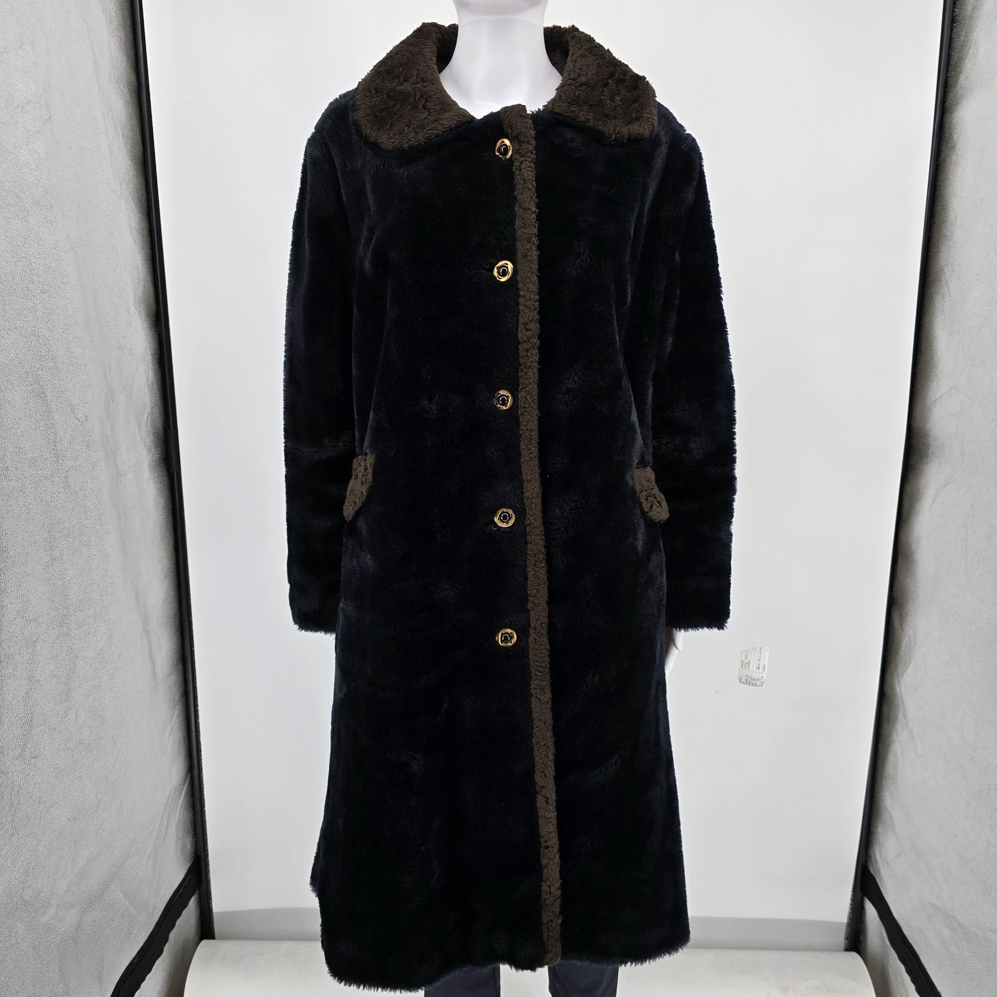 Notable Features: Plush faux-fur body with contrasting faux-shearling collar/trim; pockets