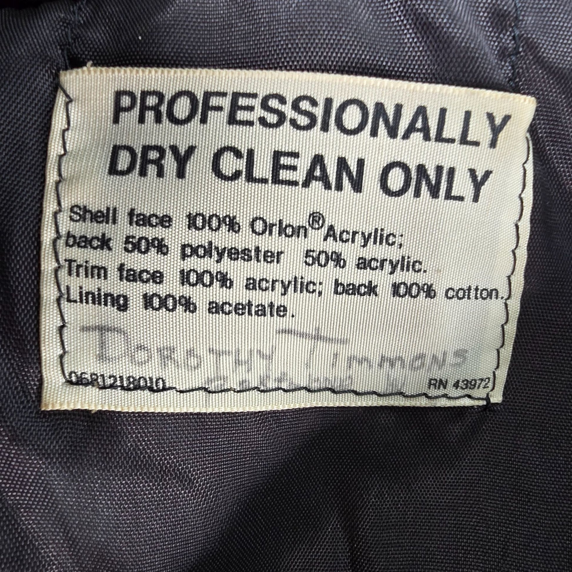 Material: Shell Face: 100% Orlon acrylic; Shell back: 50% Polyester, 50% Acrylic backing; Trim face: 100% acrylic; Trim backing 100% cotton; Lining: 100% acetate