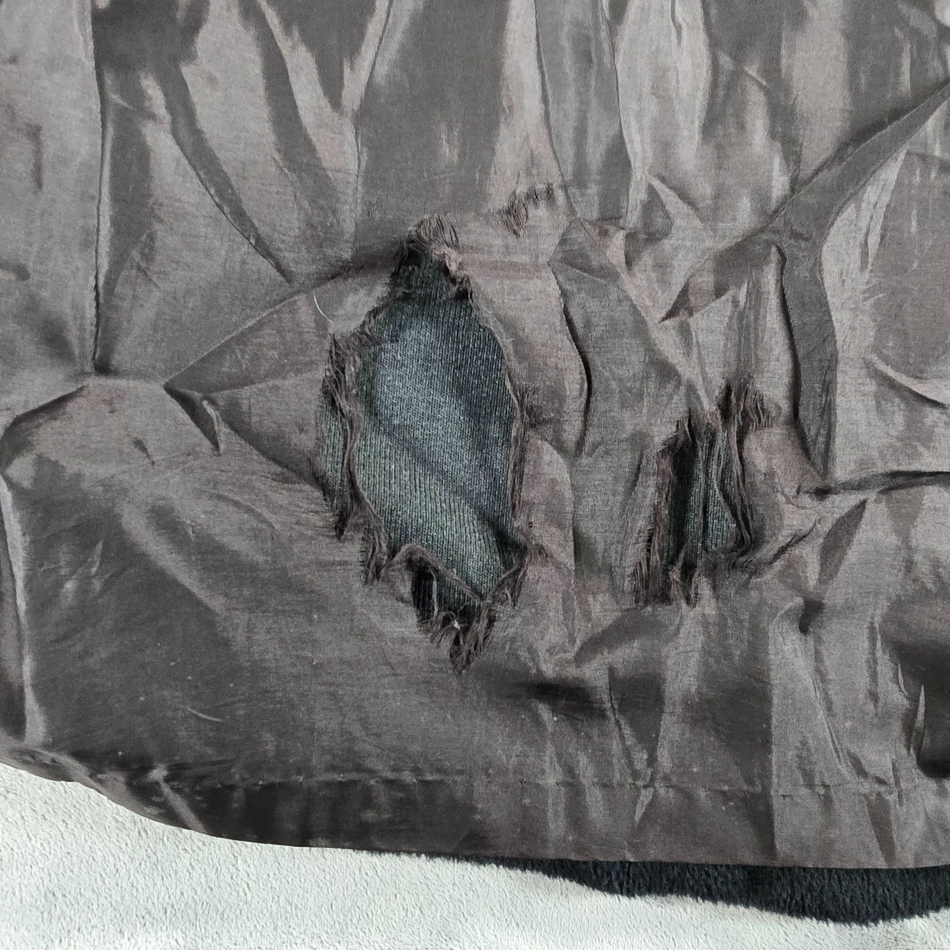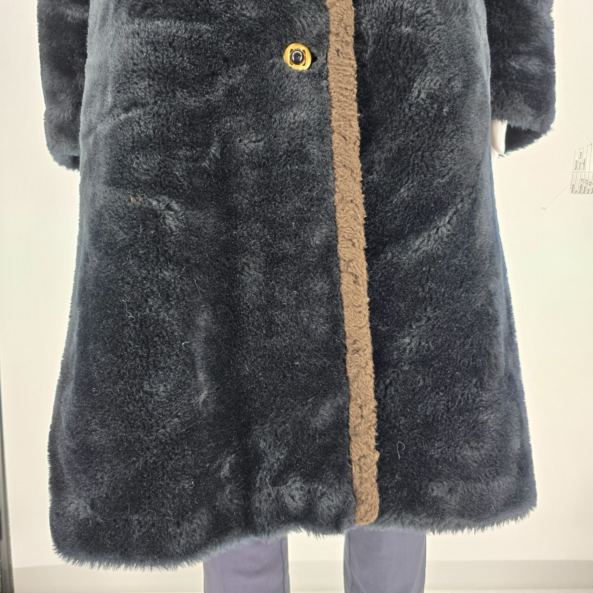 Good overall used vintage condition. Outer shell has no rips, cuts, holes, or tears. All buttons are present and firmly attached. Lining has large area of ripping/tearing just above bottom hem. Lining is partially detached at bottom hem. Heavy fabric wear of the sherpa trim. Moderate wear throughout. See photos for details.