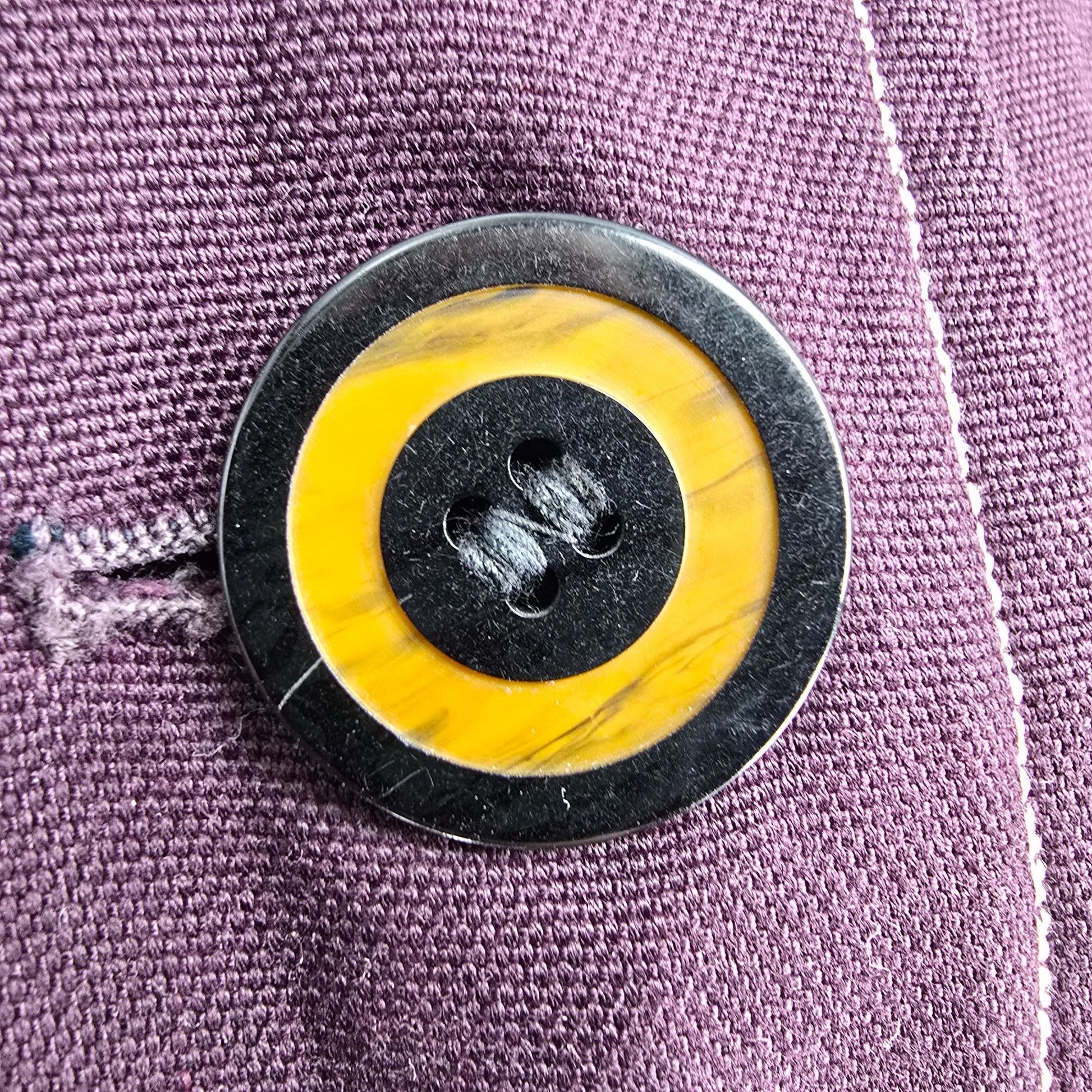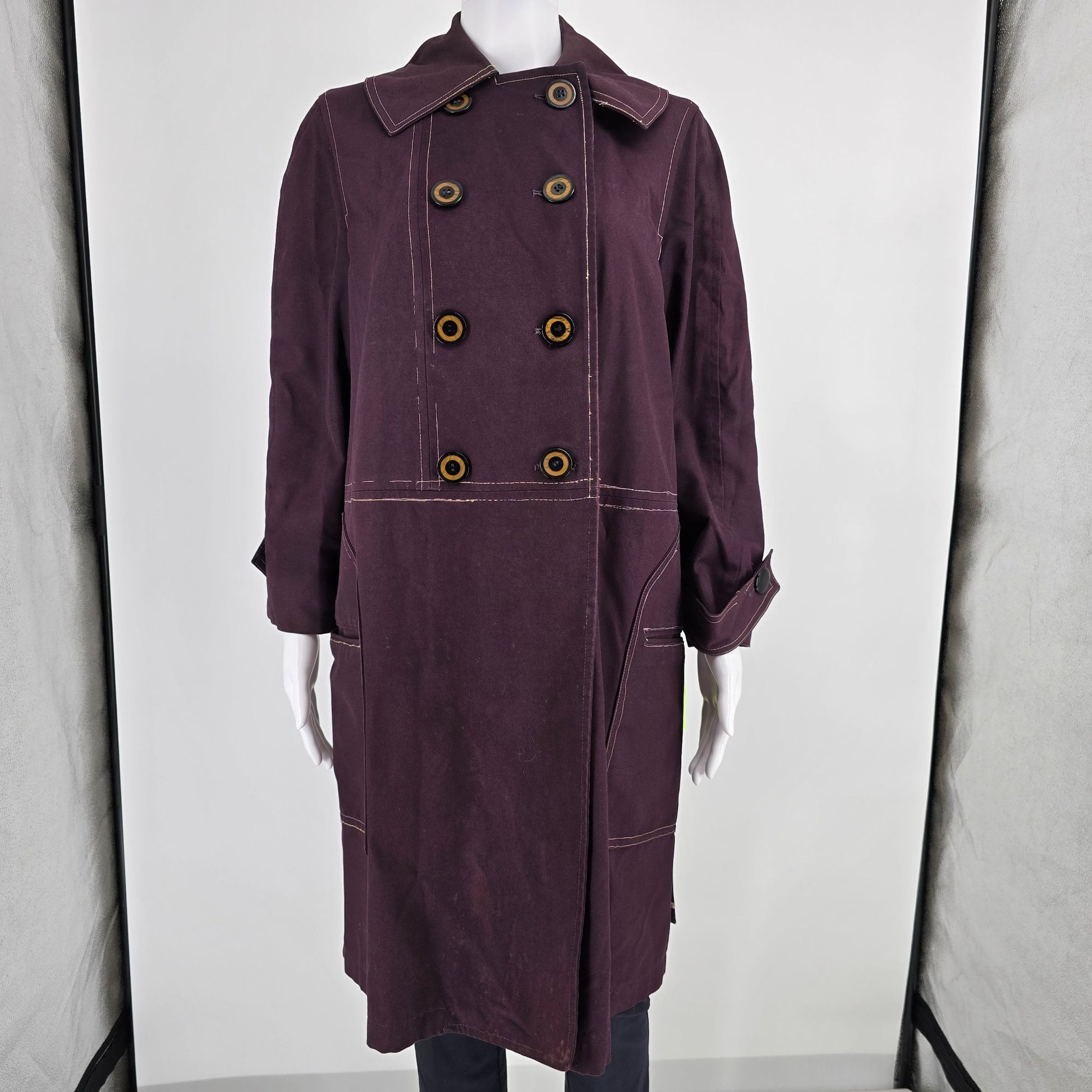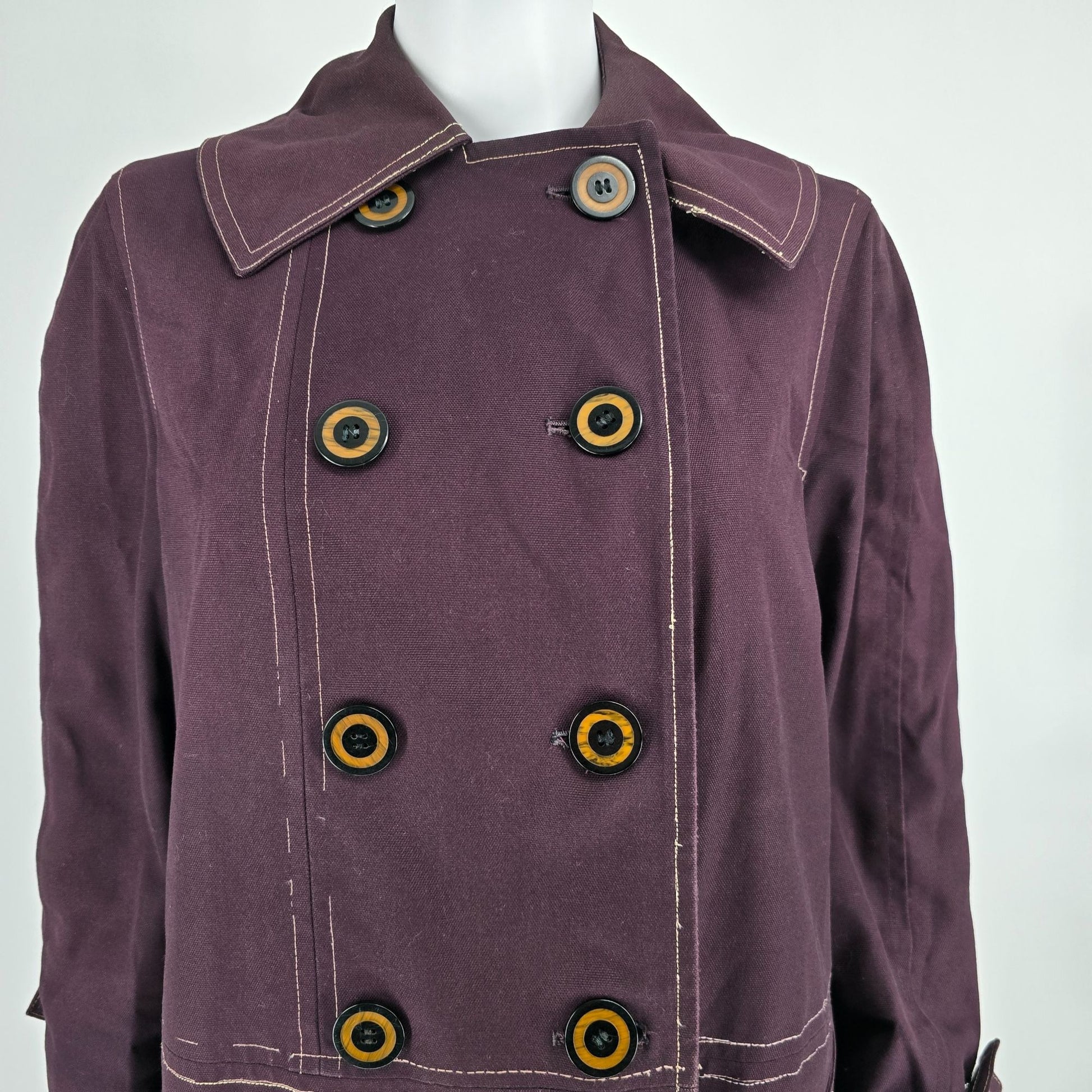 Notable Features: Double-breasted trench-style raincoat with oversized mod two-tone buttons; Contrast topstitching, cuff tabs, large front pockets; full lining