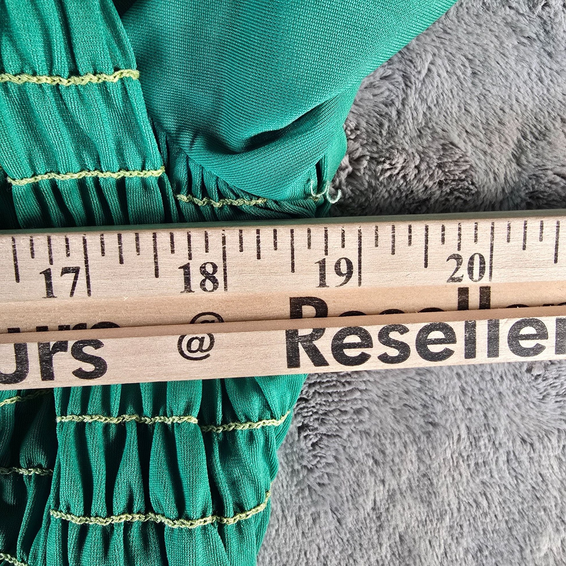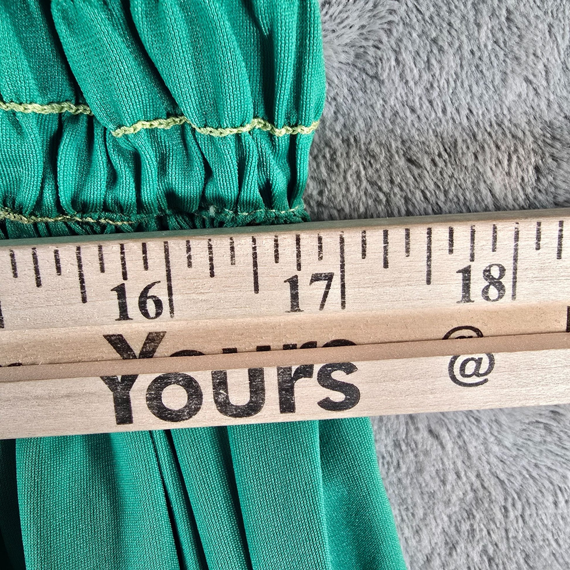 Notable Features: Floor-length maxi dress with smocked bodice front and back in matching green with gold-tone thread. Sparkling gold-tone and clear rhinestone embellishment encircles the neckline. Long sleeves, empire waist, and a flowing, full skirt. MARK Zipper