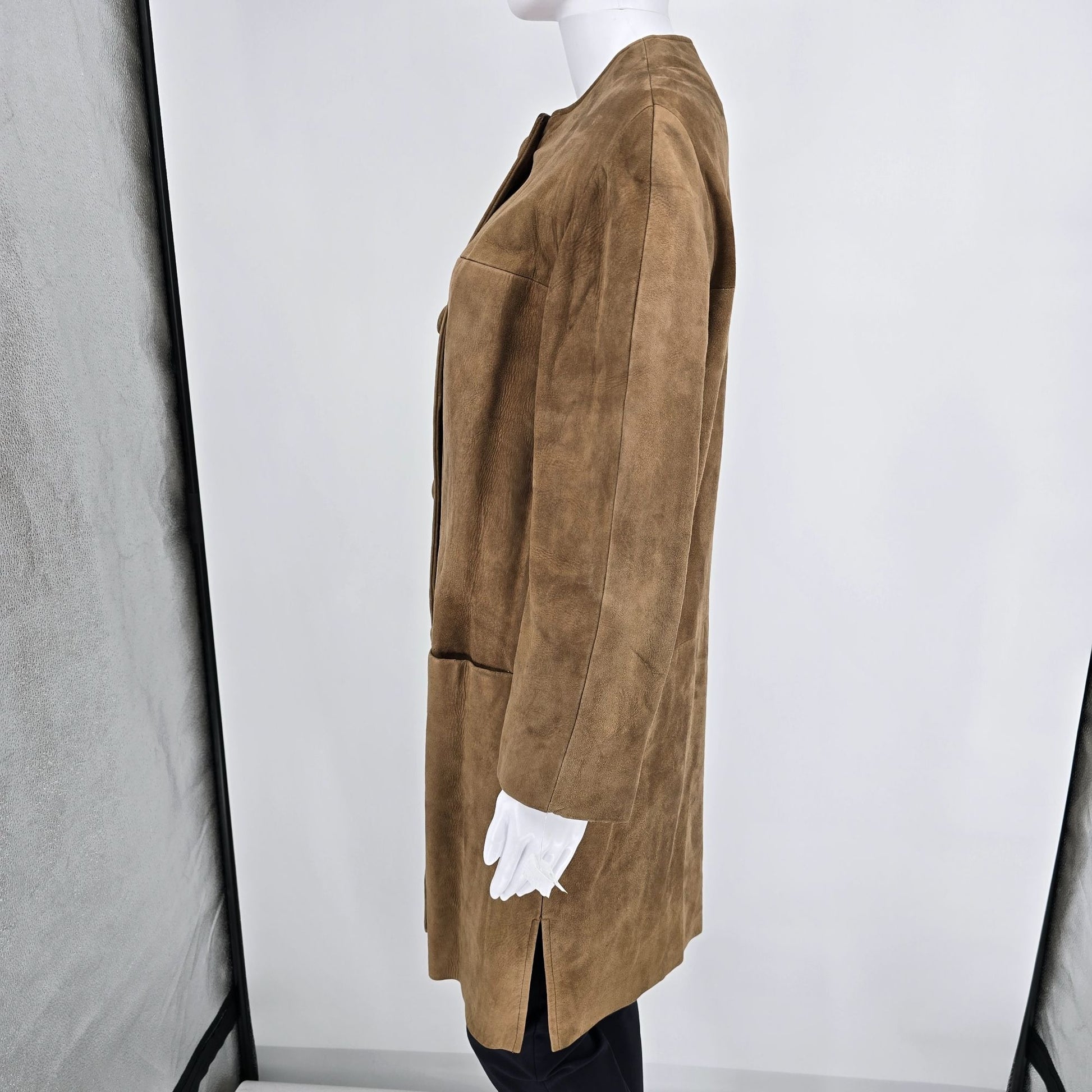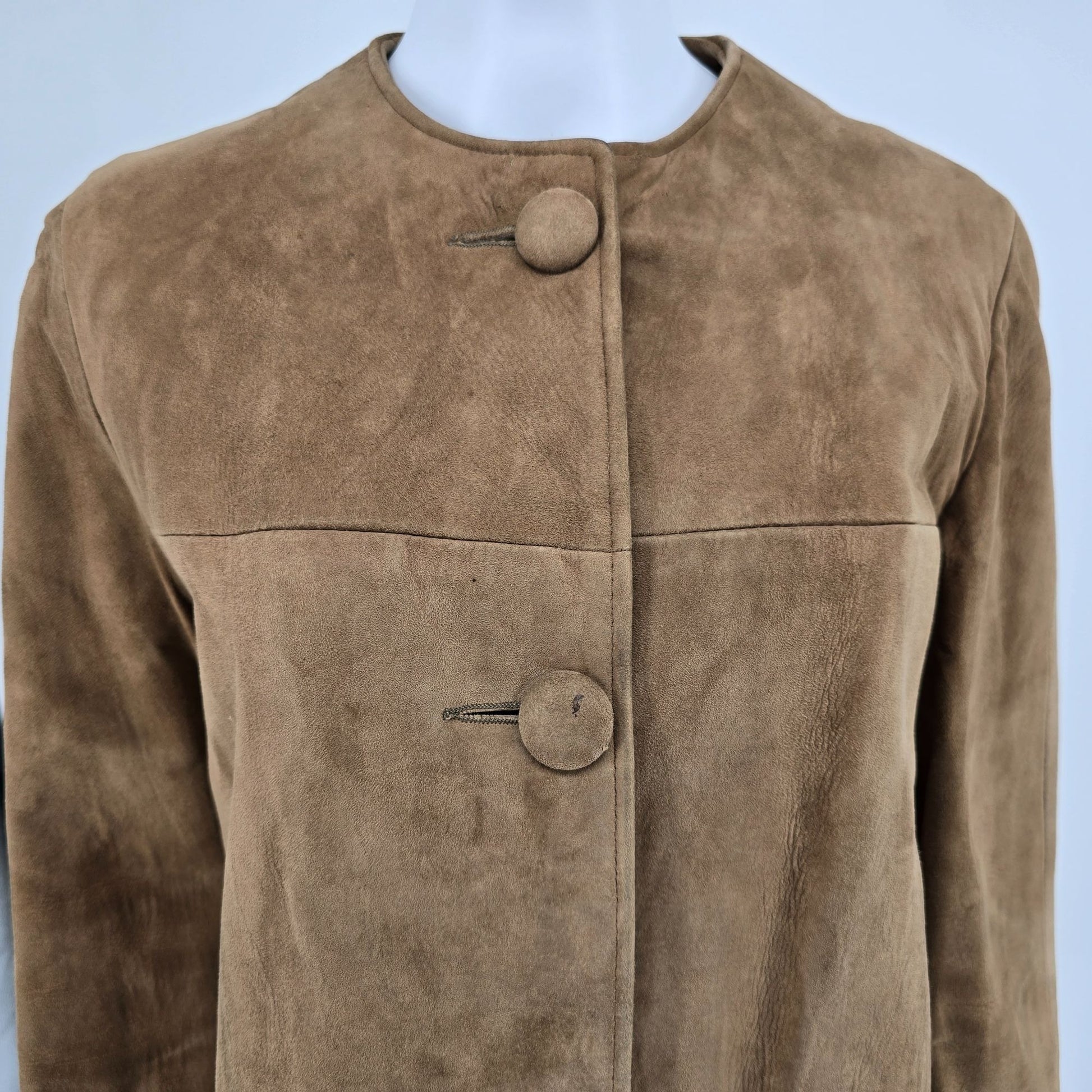 Vintage 1960s Unbranded Women's Camel Suede Leather Collarless Car Coat (M)