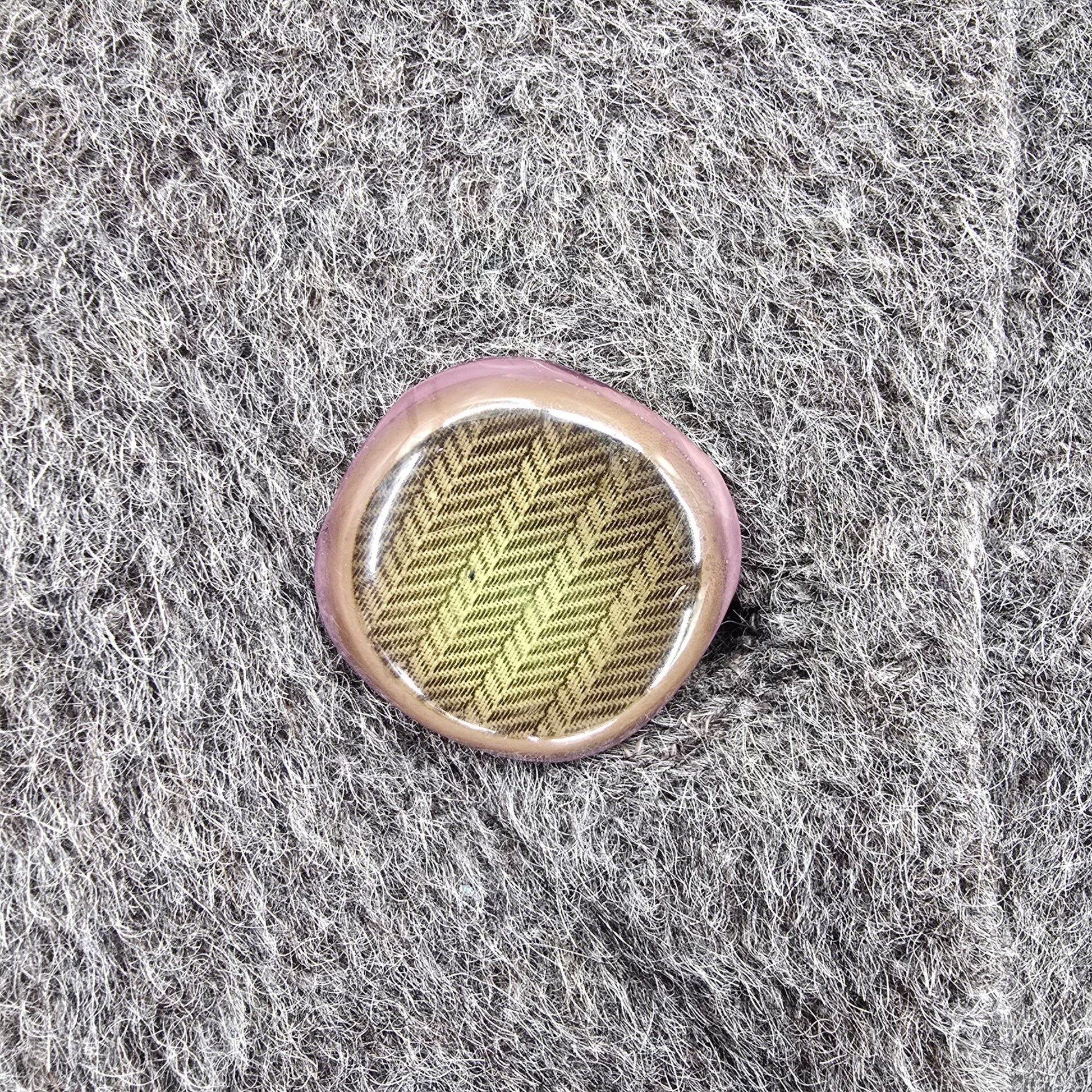 Fair to good used vintage condition. Spot of fabric damage on inside of collar (visible only when collar is worn rolled down). Large area of heavy yellowing/discoloration on bottom half of front of jacket. Other scattered areas of yellowing/discoloration throughout. Detached button at left sleeve cuff (button comes with coat). Generally moderate fabric wear throughout. See photos for details.