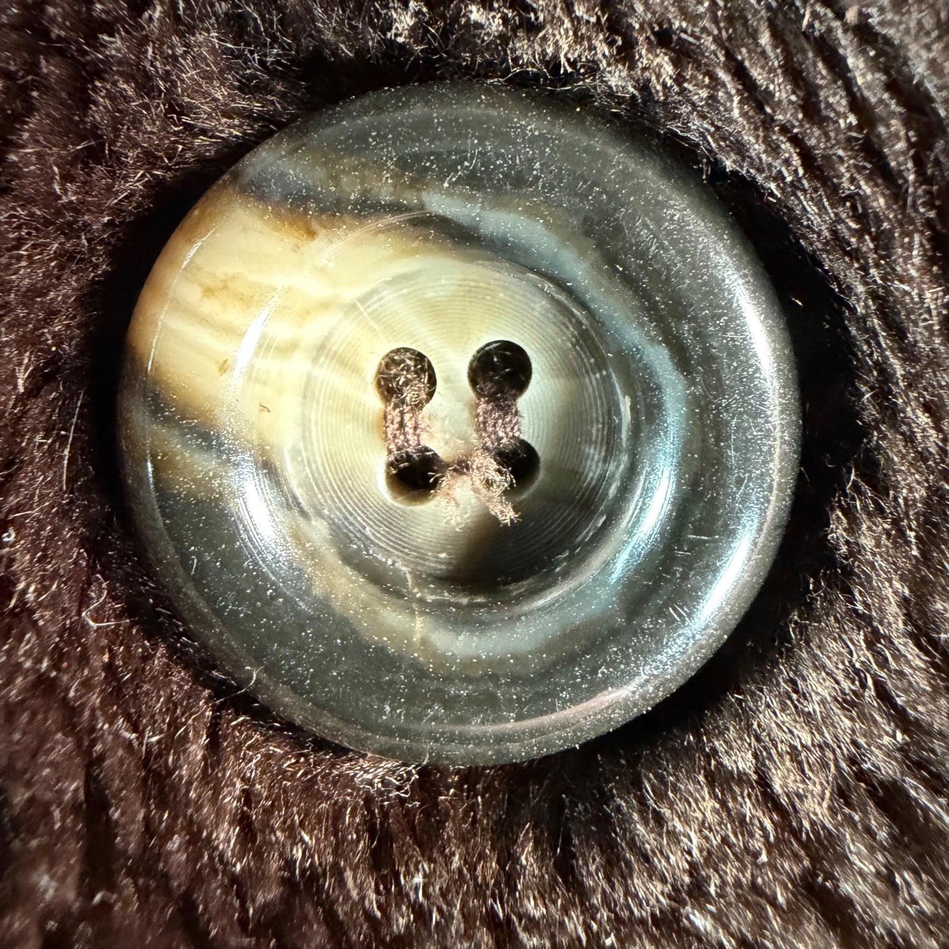 Notable Features: Double-breasted front; Marbled plastic buttons, Front patch pockets; Mid-thigh to Upper-Thigh length; Interior hanging chain